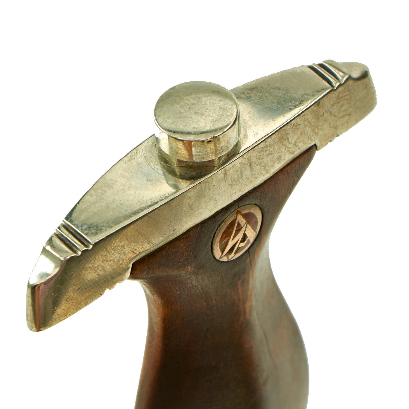 Per J. Anthony Carter's book GERMAN KNIFE AND SWORD MAKERS,this firm was originally founded by Gottfried Jetter in 1867, and in 1887 he partnered with the Scheerer brothers to form Jetter & Scheerer. By 1895, they recognized the limitations of a family business, and formally incorporated. They built a new factory and registered the trademark Aesculap. The company used this particular "round" trademark on very early SA and NSKK daggers, which they made only made a small number of. They were a known maker of early Ernst Röhm signed daggers, however this example shows no evidence of ever having the signature.