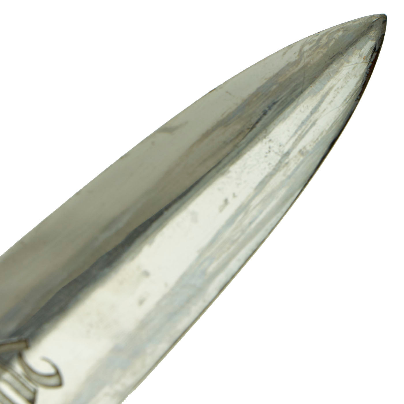 Prior to his "unmasking" as a traitor, Ernst Röhm was the leader of the SA. In 1934, he distributed approximately 100,000 SA daggers with his personal inscription on the reverse blade. These daggers were to honor individuals who had served with the SA prior to December, 1931. Other than the inscription, these pieces were identical to the standard M1933 SA dagger. After the Röhm purge, the inscription was ordered to be removed. Many examples were returned to the factory for grinding. Others were simply ground in the field by whatever means were available. Examples will occasionally be encountered with remnants of the original inscription remaining on the blade, but mostly none will remain. Some blades exist with an intact inscription, reflecting only the removal of the Röhm signature. Very very rarely is an example seen with a full, untouched inscription, as the holder would have surely risked a charge of treason.