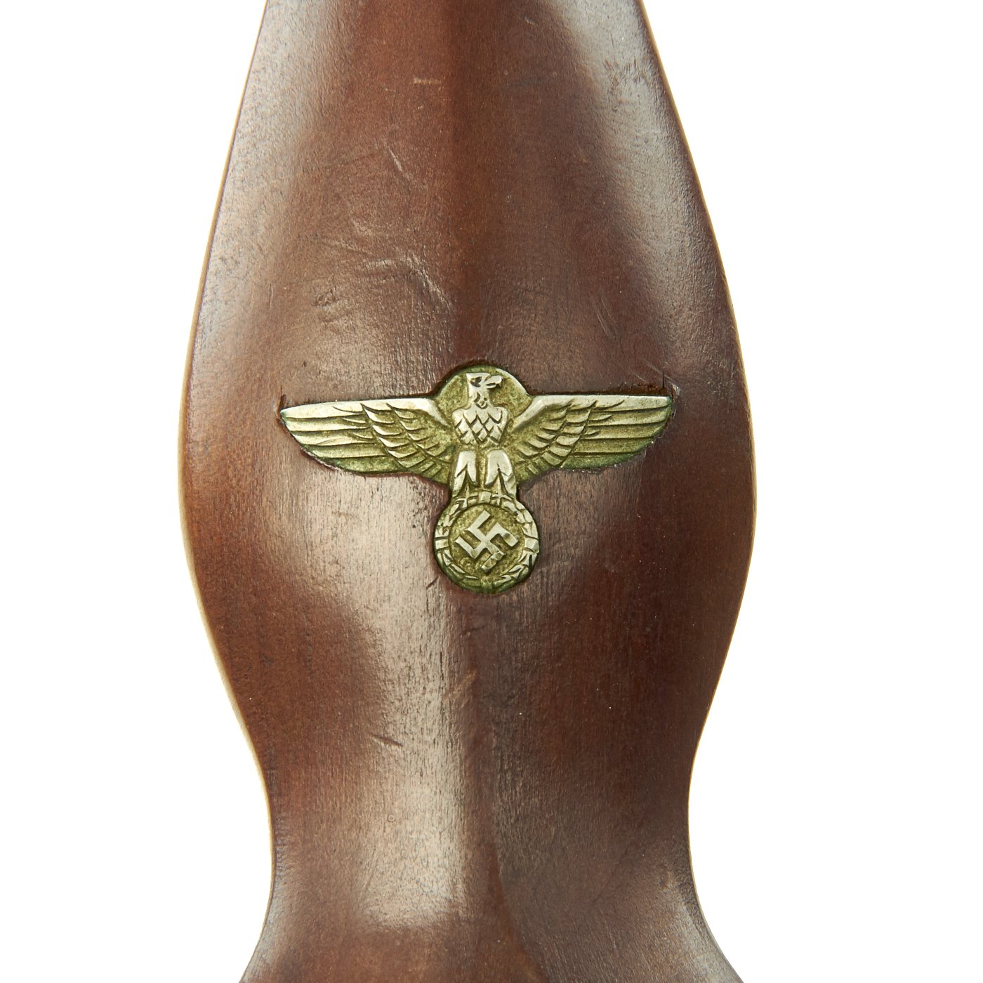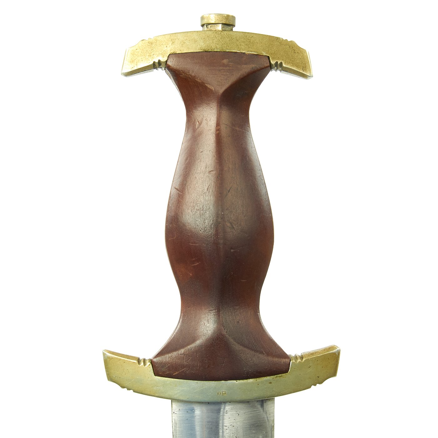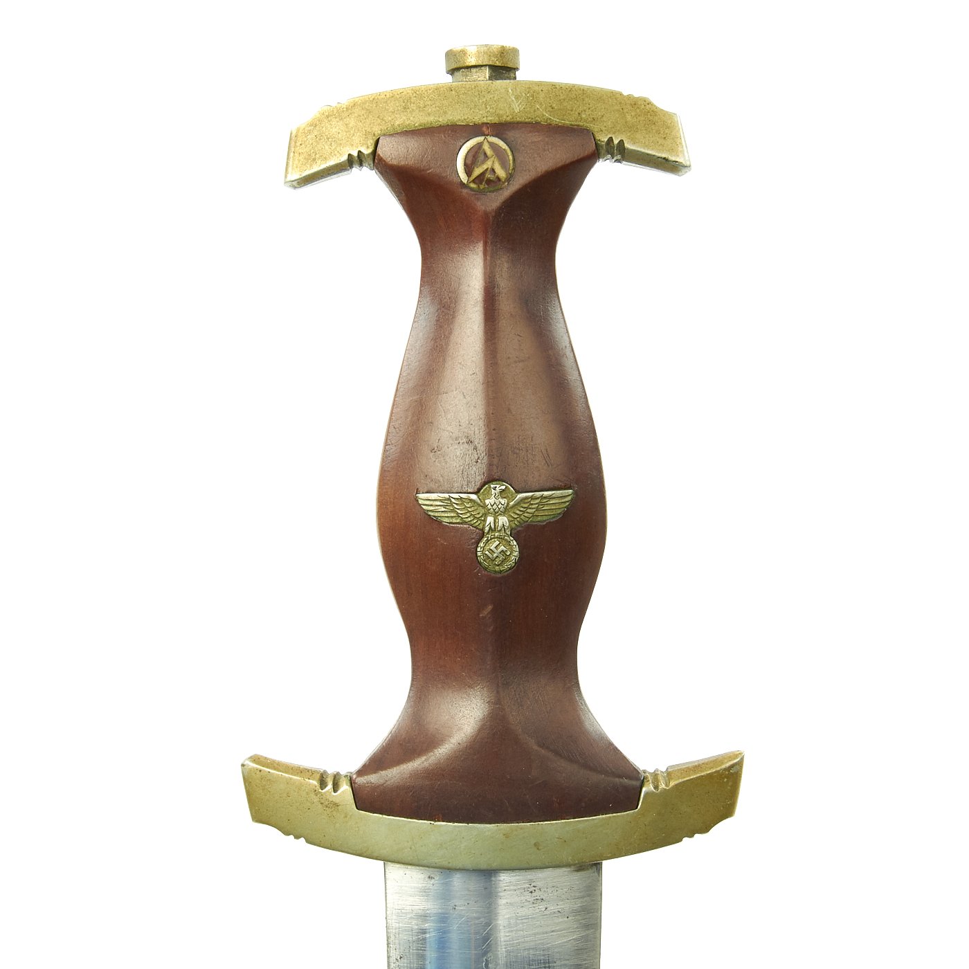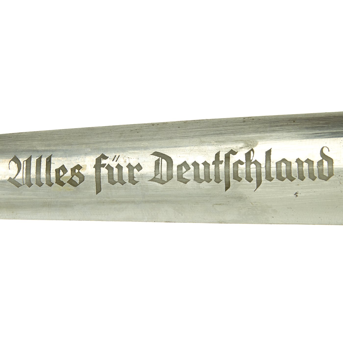 The blade was etched with the SA motto, Alles für Deutschland. Examples produced prior to 1935 were stamped with the German sector of the SA group on reverse lower crossguard. Later examples underwent standardization through the RZM ministry. These pieces were produced of cheaper plated zinc-base fittings and scabbards were simply painted brown.