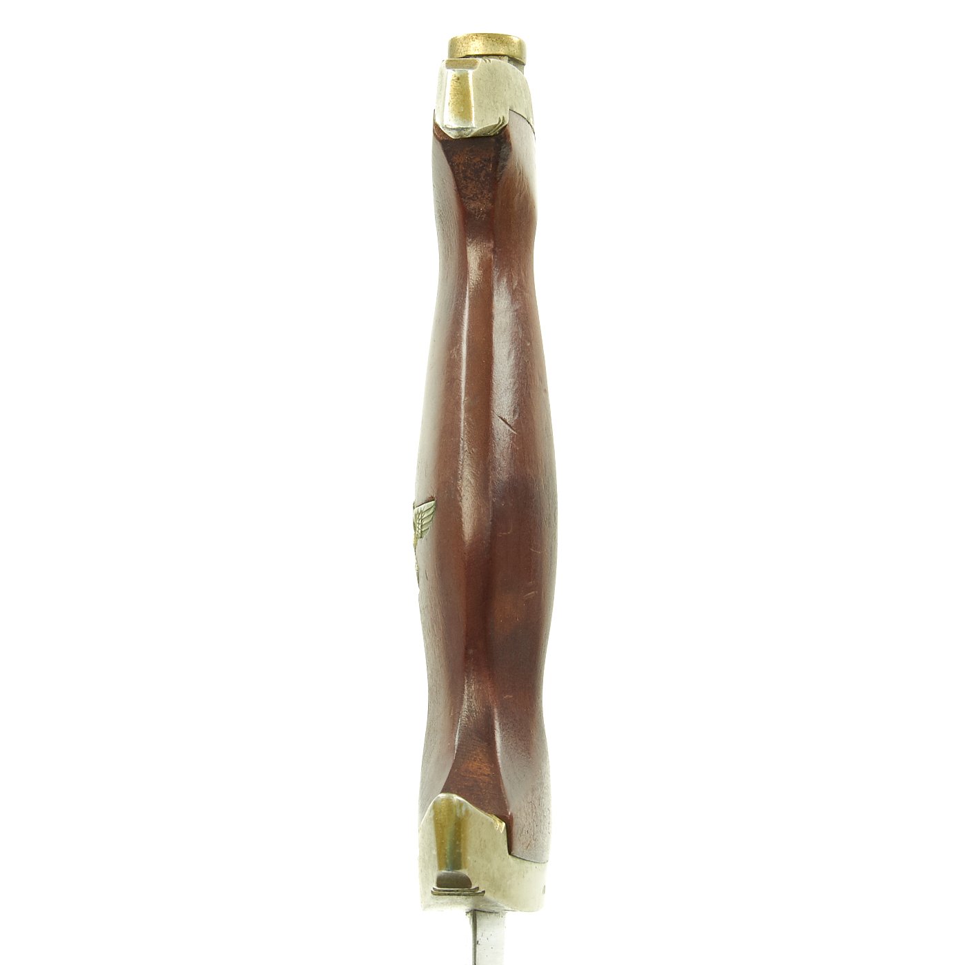 The grip is a fine product having a nice red brown color, with having medium center ridge construction, with just a bit of wear. This grip is in good condition and fits the crossguards nicely, without any cracking. The symbol button is still nicely set, and still has all of the enamel intact. The grip eagle is a fine example being the style with beak that points straight. The details are still there to the eagle to include the beak, breast feathering, wing feathering, talons, wreath and mobile swas. The nickel plating on both insignia is fully intact, with just a bit of verdigris.