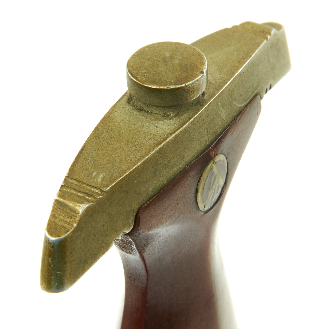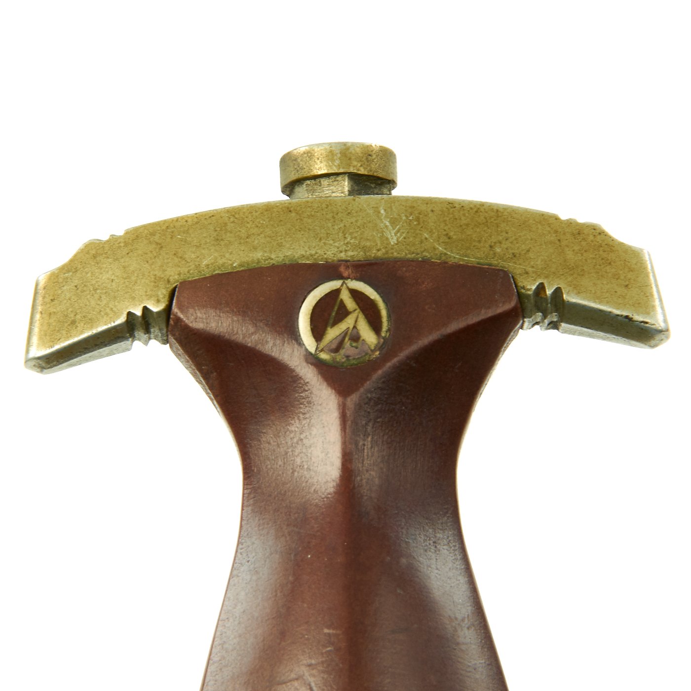This style trademark is specific to early SA Daggers, per J. Anthony Carter's GERMAN KNIFE AND SWORD MAKERS. They later moved to a simplified tradmark with an RZM code in 1939. Anton Wingen Jr. is a well-known maker from the famous "City of Blades" in Western Germany. The trademark is partly removed, but the factory cross grain is still present. Due to this, we believe this may possibly have originally had the signature of Ernst Röhm on the rear. It was then returned back to the factory, the signature removed, and a new factory polish applied.