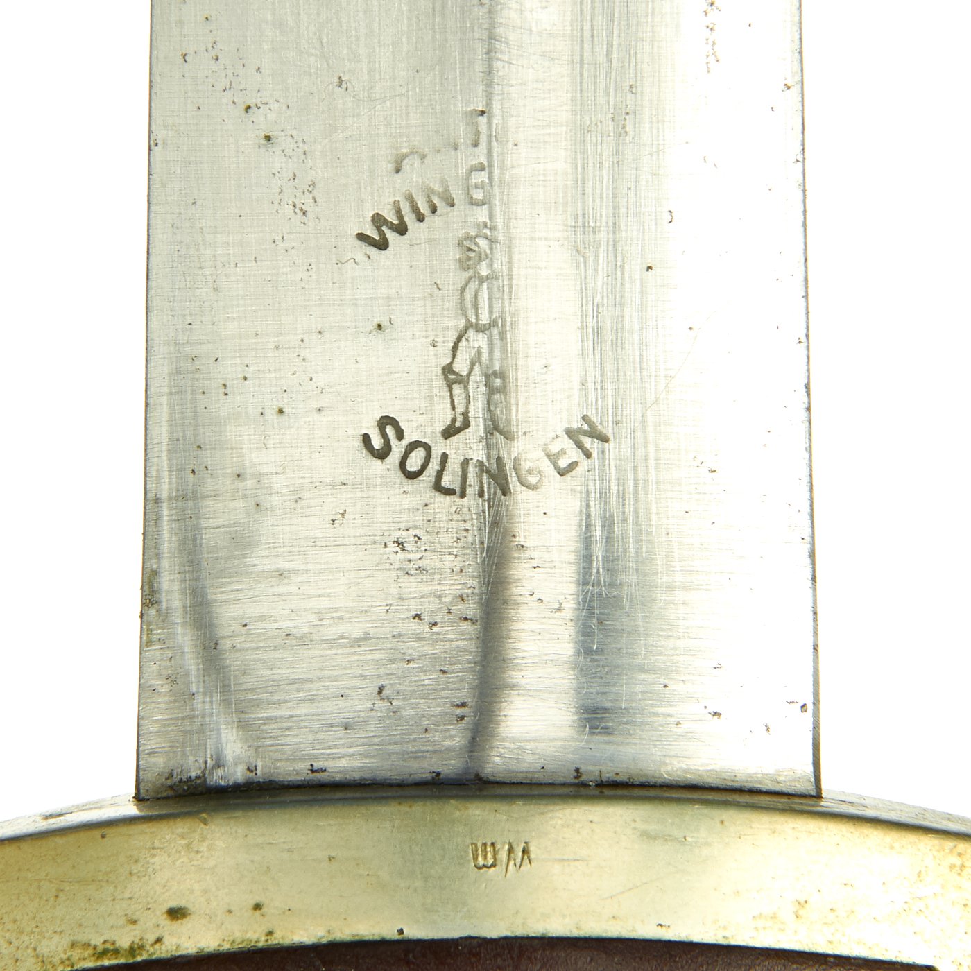 This fine example was produced by Anton Wingen jun., Stahlwarenfabrik, a known producer of this knife during WWII. The rear of the dagger is marked: