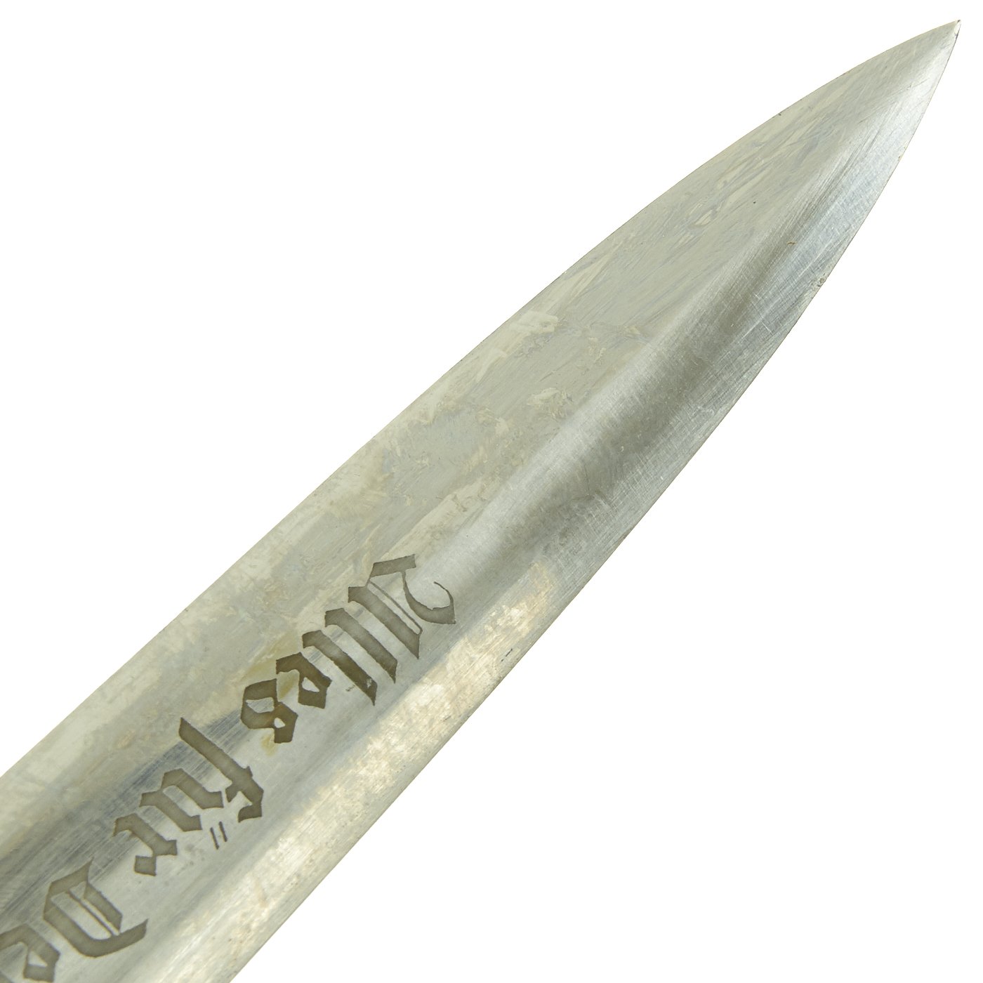 Prior to his "unmasking" as a traitor, Ernst Röhm was the leader of the SA. In 1934, he distributed approximately 100,000 SA daggers with his personal inscription on the reverse blade. These daggers were to honor individuals who had served with the SA prior to December, 1931. Other than the inscription, these pieces were identical to the standard M1933 SA dagger. After the Röhm purge, the inscription was ordered to be removed. Many examples were returned to the factory for grinding. Others were simply ground in the field by whatever means were available. Examples will occasionally be encountered with remnants of the original inscription remaining on the blade, but mostly none will remain. Some blades exist with an intact inscription, reflecting only the removal of the Röhm signature. Very very rarely is an example seen with a full, untouched inscription, as the holder would have surely risked a charge of treason.
