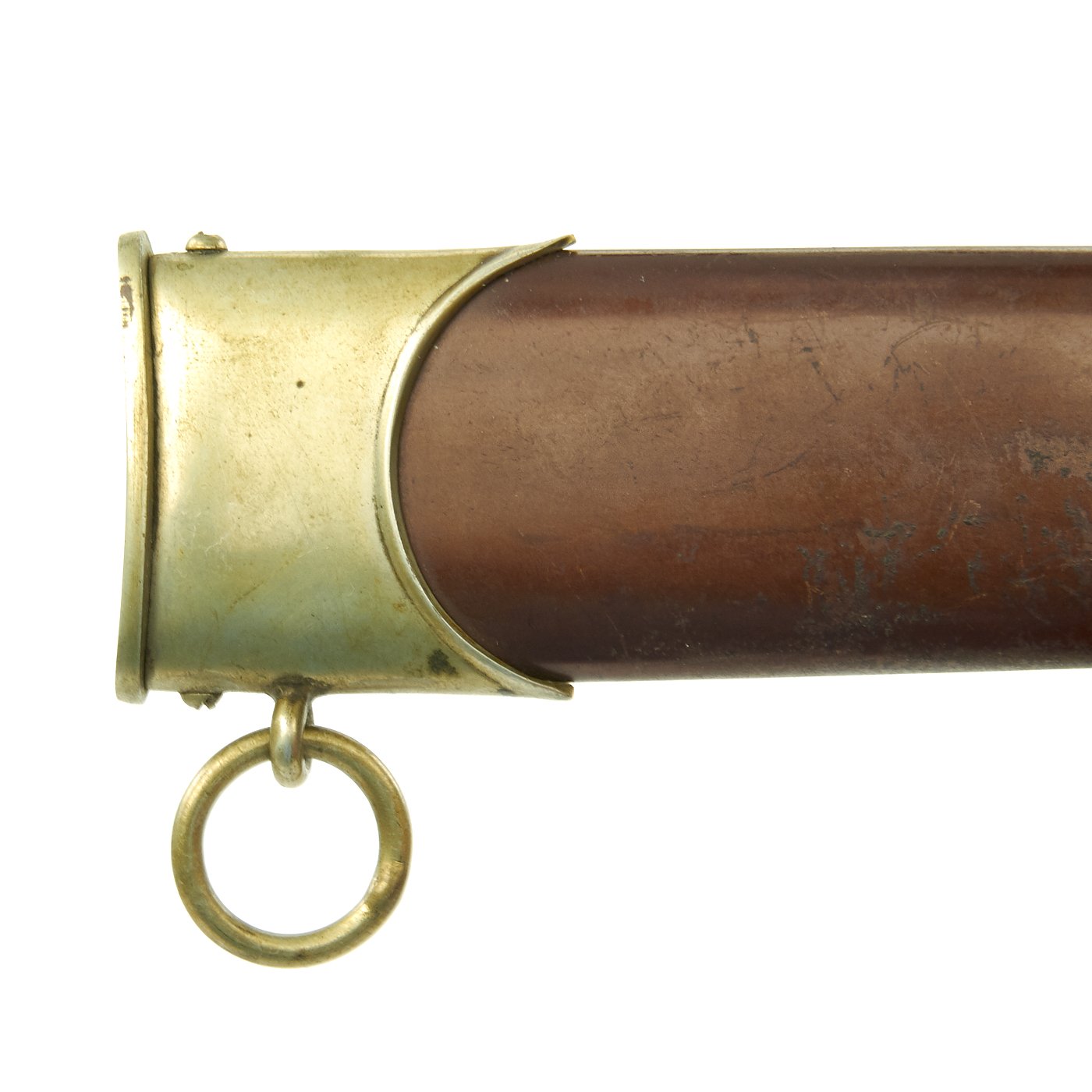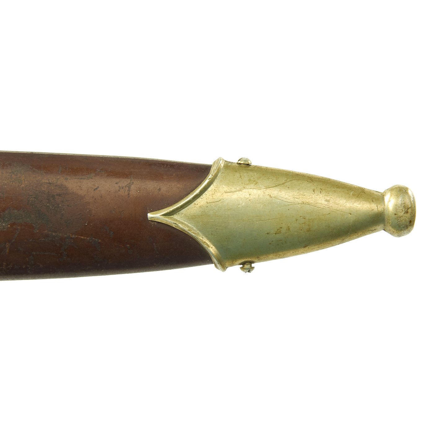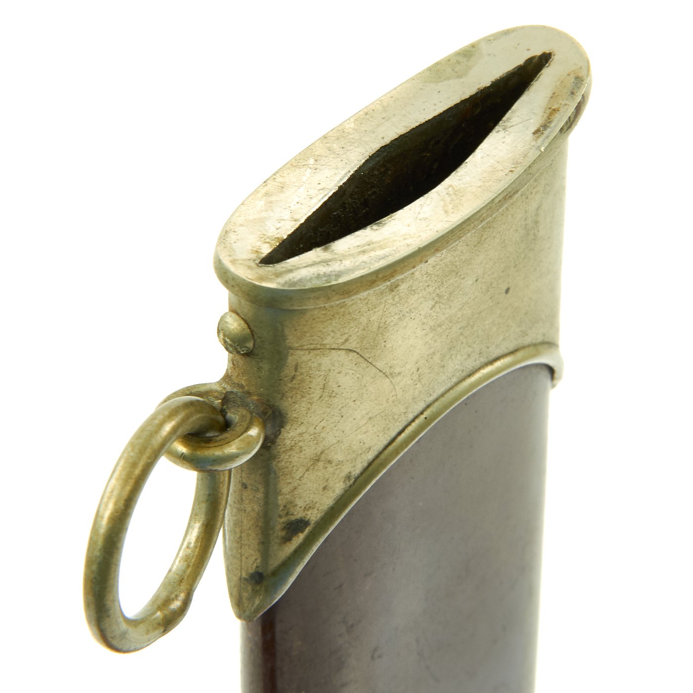 The scabbard shell is straight throughout and is the early-war style, with a brown "anodized" finish on the steel, which was then lacquered. Most of this is still intact, making this one of the nicest early war scabbards we have seen. The upper and lower fittings are solid nickel silver, and have a nice patina, with some dents and scratches showing typical wear. The bottom fitting is dented in a bit, typical of the softer alloy. The throat nicely matches the crossguards and all four screws are still present.