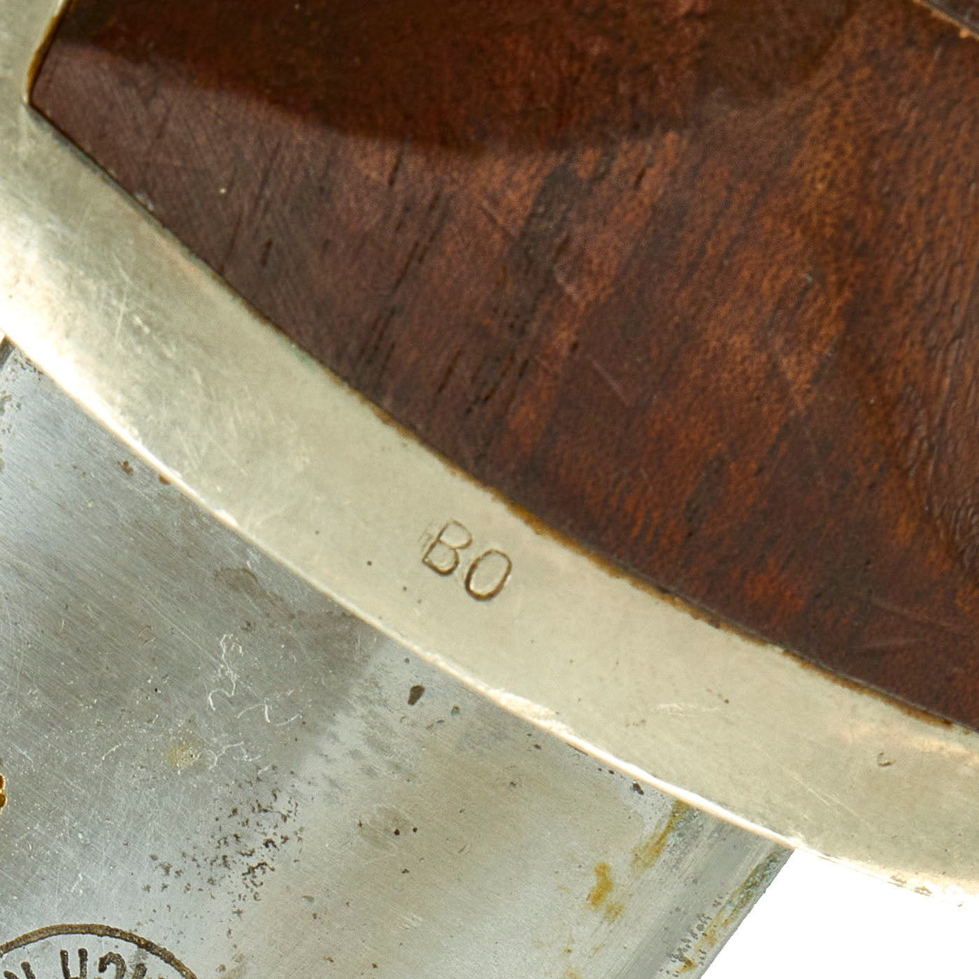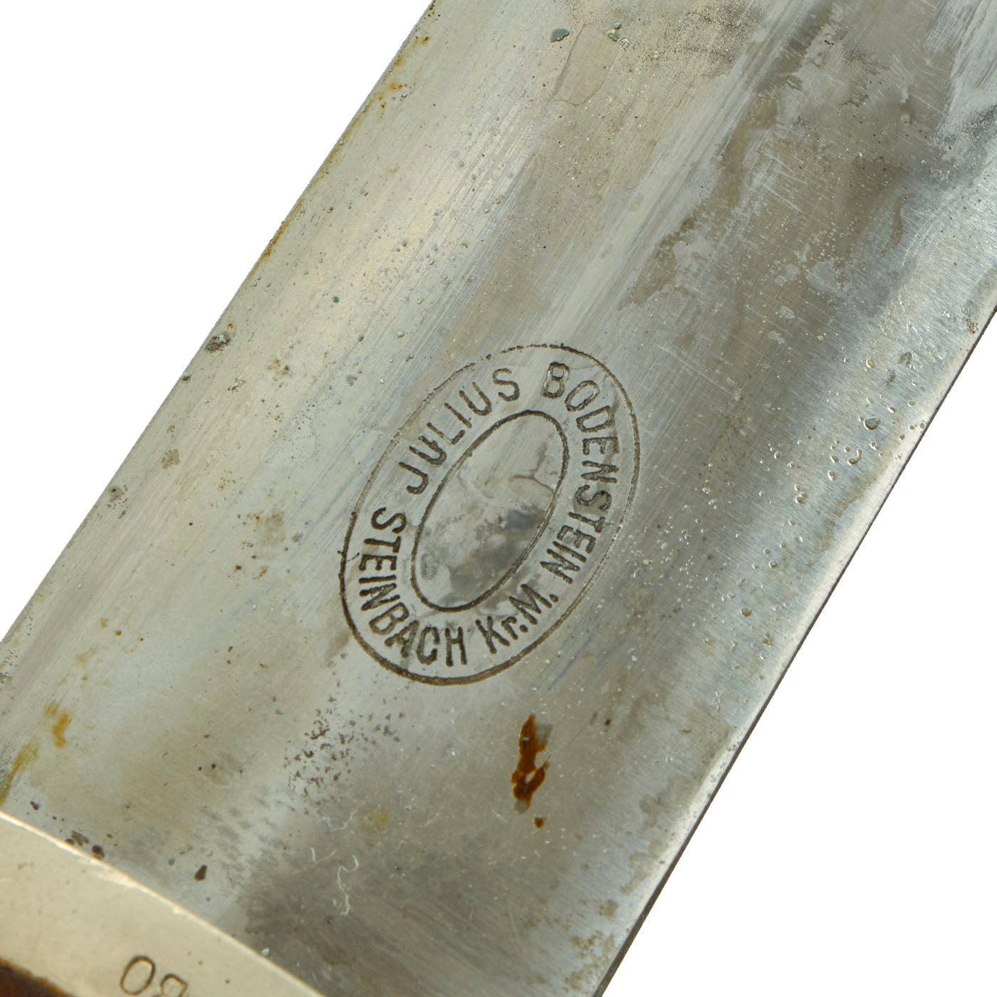 The blade of this example is marked Julius Bodenstein Steinbach Kr. M. over SOLINGEN in an oval border. The blade is in very good condition, with runner marks as well as some staining and light oxidation in places. The original factory final grind cross grain can still be seen throughout the blade, going right to the edge. The acid-etched Alles für Deutschland SA motto is crisp, and still retains much of the factory darkening.