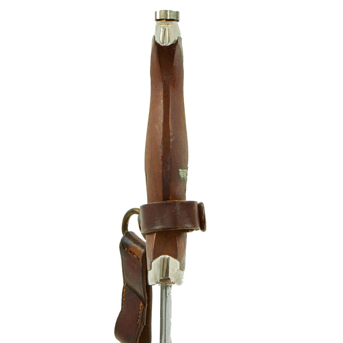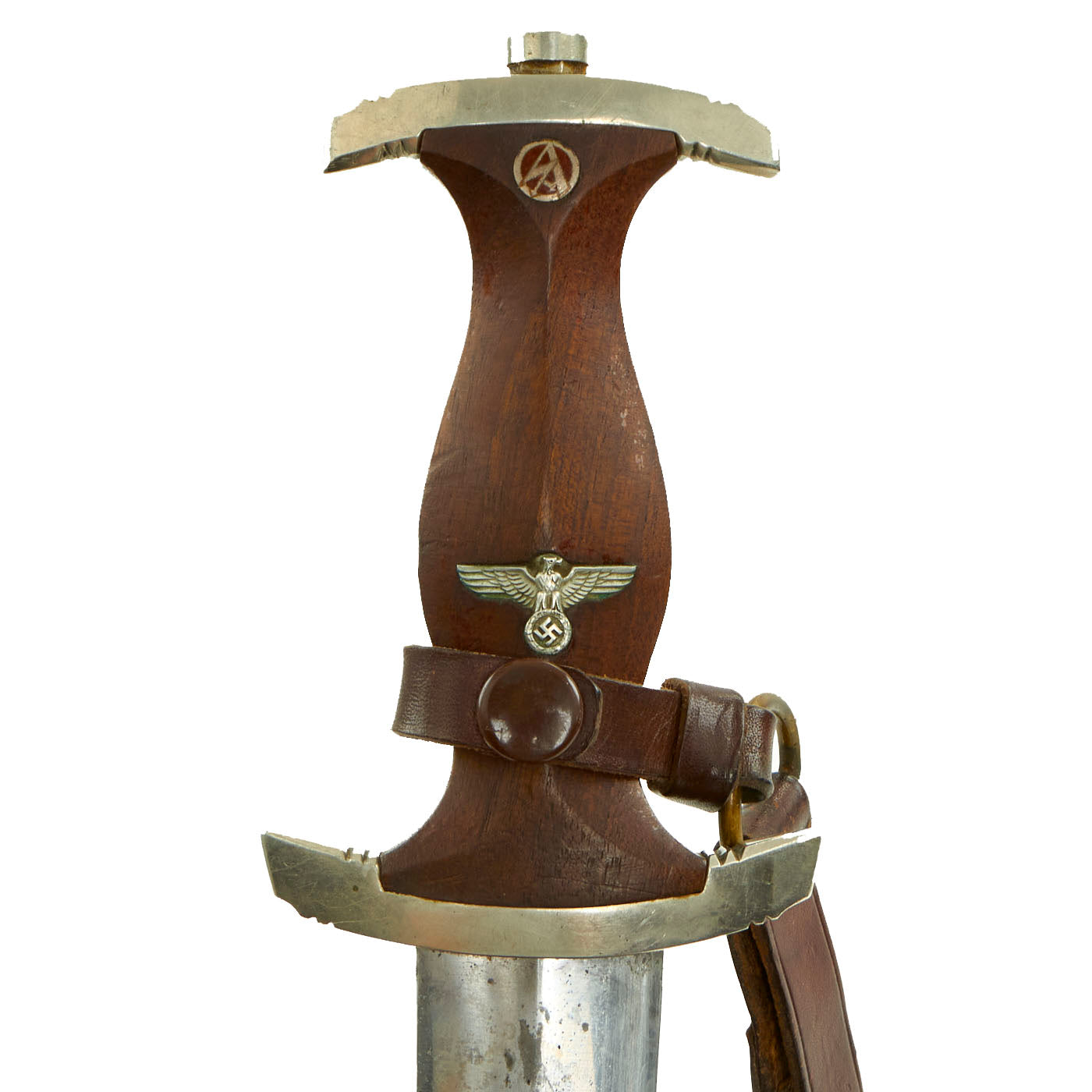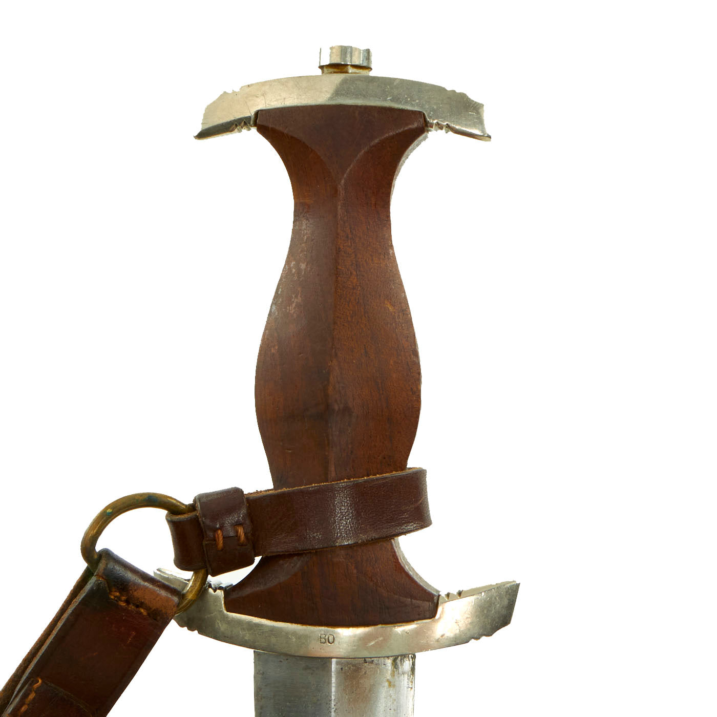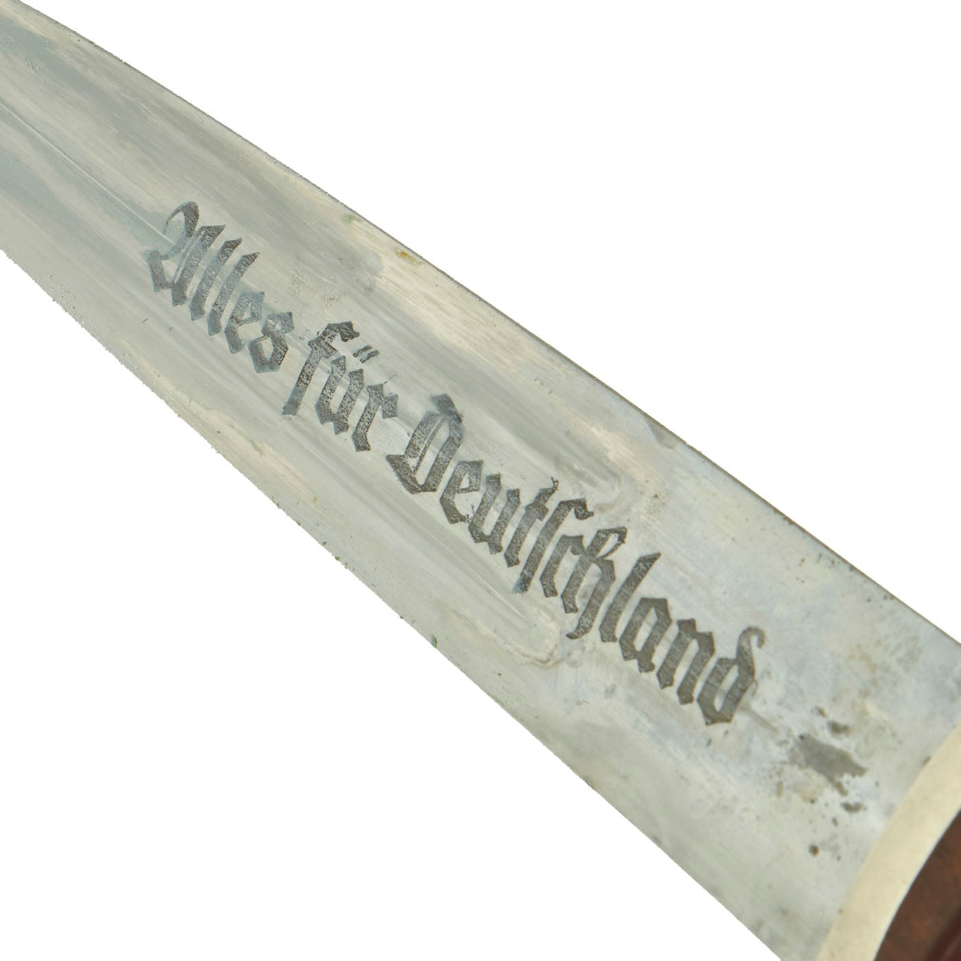 The blade was etched with the SA motto, Alles für Deutschland. Examples produced prior to 1935 were stamped with the German sector of the SA group on reverse lower crossguard. Later examples underwent standardization through the RZM ministry. These pieces were produced of cheaper plated zinc-base fittings and scabbards were simply painted brown.