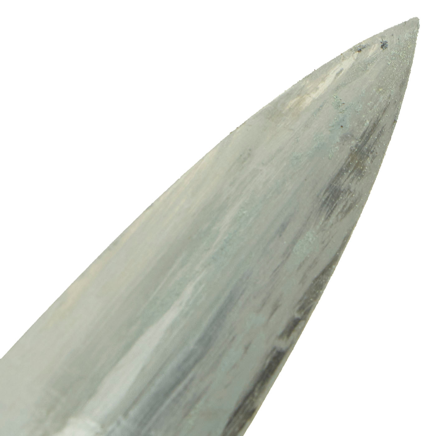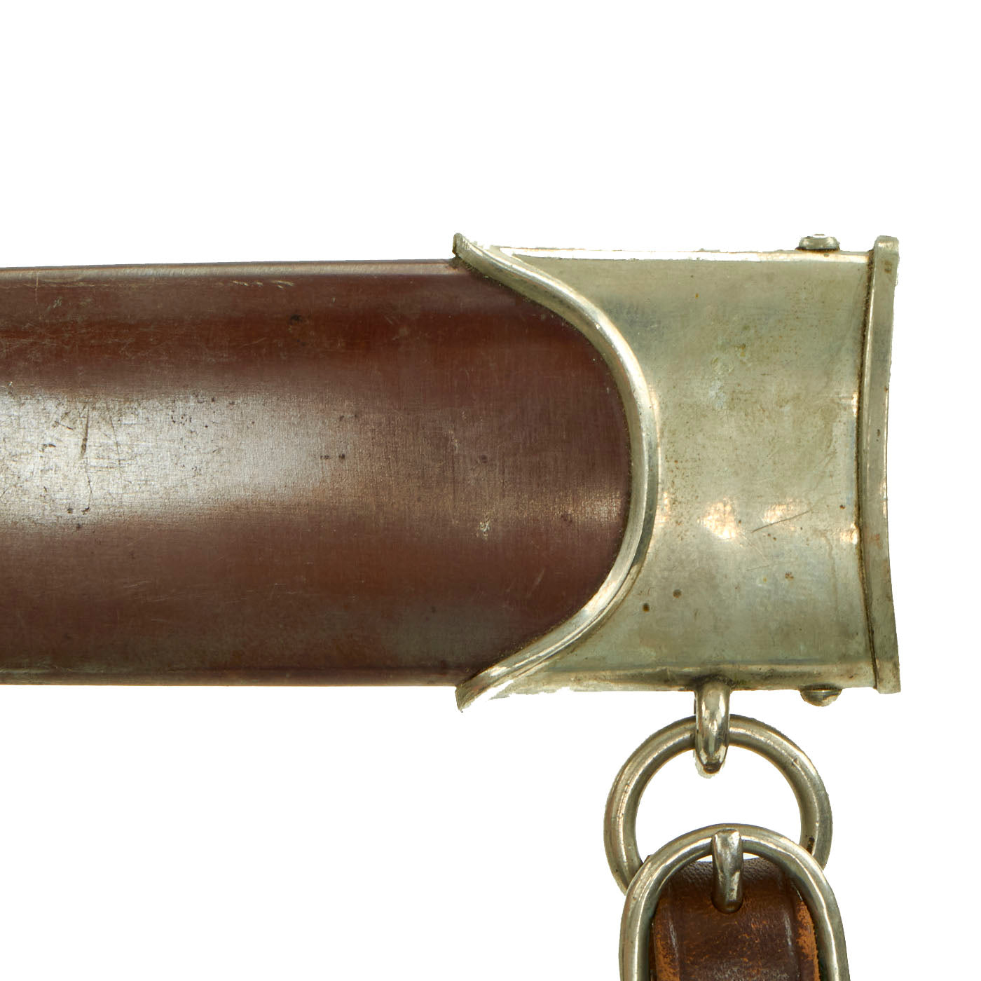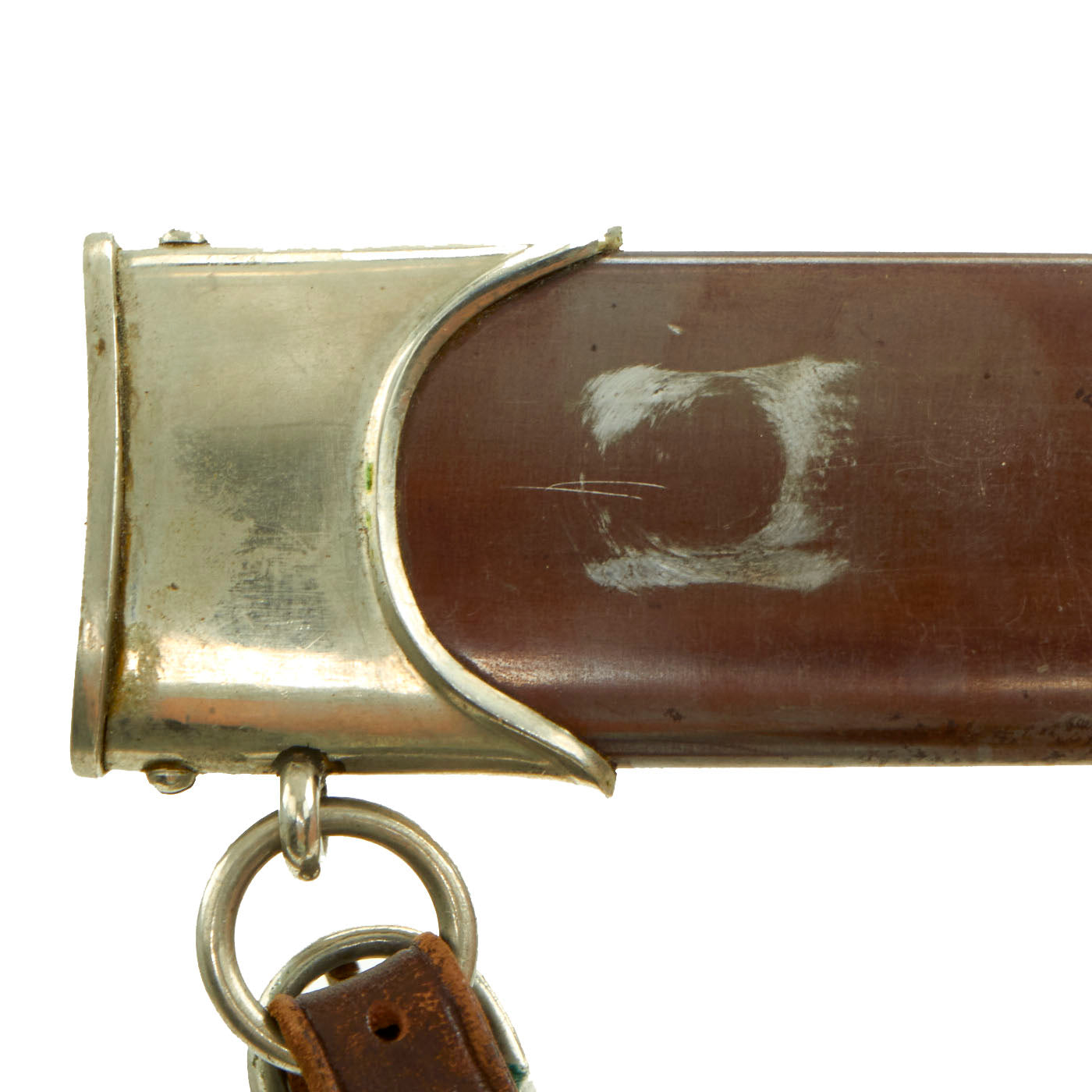 The scabbard shell is straight throughout and is the early-war style, with a brown "anodized" finish on the steel, which was then lacquered. The upper and lower fittings are solid nickel silver, and have a nice patina, with some dents and scratches showing typical wear. The bottom fitting is dented a little, typical of the softer alloy. The throat nicely matches the cross guards and the screws for the top and bottom mounts are still present.