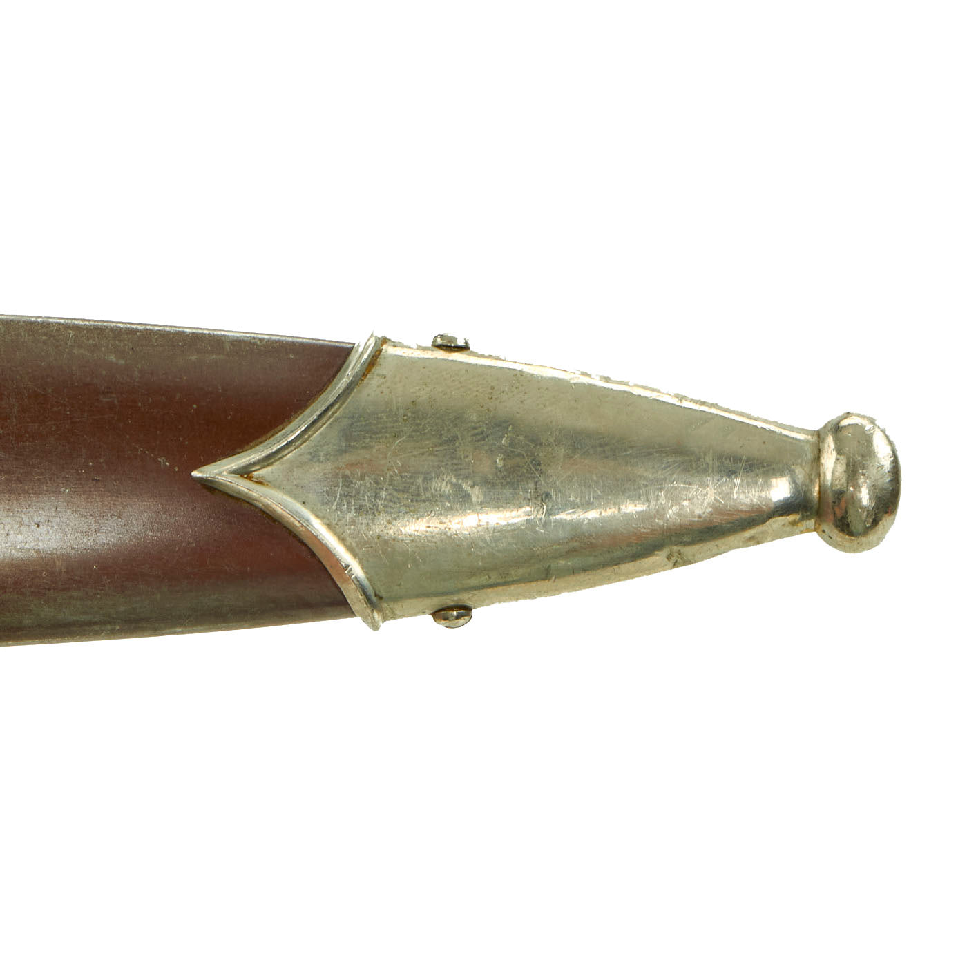 It comes complete with the original scabbard, as well as a three piece leather belt hanger. The dagger has solid nickel silver fittings throughout, and is a really nice example. The cross guards and tang nut are in very good condition throughout with all fittings having a nice aged patina.
