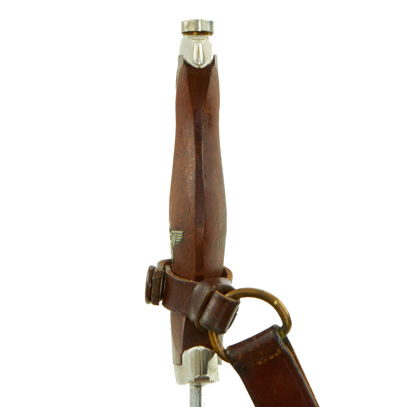 The grip is a fine product having a nice red brown color, with having medium center ridge construction. This grip is in great condition and fits the crossguards tightly. The symbol button is nicely set, and still has almost all of the enamel intact. The grip eagle is a fine example being the style with beak that points straight. The details are still there to the eagle to include the beak, breast feathering, wing feathering, talons, wreath and mobile swas. The nickel plating on both insignia is fully intact.
