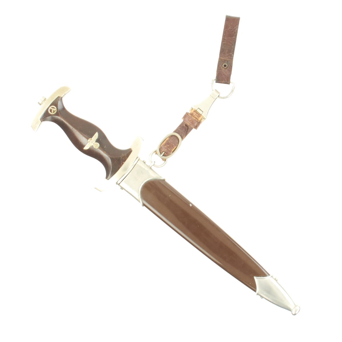 The SA or Brown Shirts, were a private political formation which Adolf AH and the NSDAP used to maintain order at organized Party meetings and demonstrations. The group was formed in 1921, and grew to a huge force of nearly 3,000,000 men by the later 1930's. To instill esprit de corps, as well as create employment for the Blade City of Solingen, it was decided each SA man would carry a dagger with his Brown Shirt uniform. Huge quantities needed to be produced to accommodate the demand. The dagger initially was produced of hand-fitted nickel mounts with attractive finished wood grip and brown anodized (a bluing process) finished scabbard.