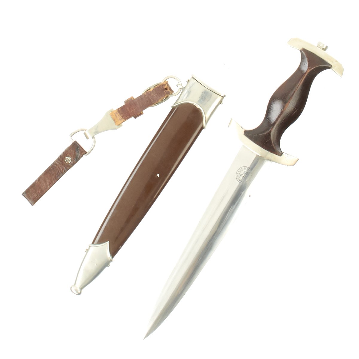 Original Item: Only One Available. This is a very nice early pattern SA Dagger, made by firm of Melzer & Feller in Zella-Mehlis, near Suhl, Germany. It comes comes compete with the original scabbard, as well as a leather belt hanger clip and loop. The dagger has solid nickel silver fittings throughout, and is really a quite nice example. The crossguards and tang nut are in very good condition throughout with all fittings having a nice aged patina. There is a little age to these mounts but there is no lifting anywhere. There are some light scratches and cuts, showing that the fittings are in fact solid nickel silver.