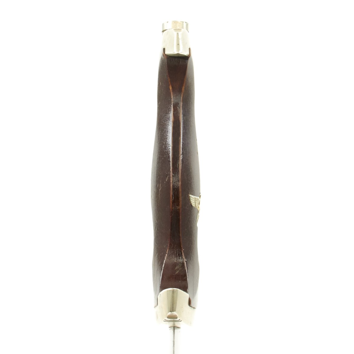 The grip is a fine product having a nice chestnut color finish and having medium center ridge construction. This grip is in very good condition and fits the crossguards very closely. The symbol button is nicely set, and still has all of the enamel intact. The grip eagle is a fine example being the style with beak that points straight. The details are still there to the eagle to include the beak, breast feathering, wing feathering, talons, wreath and mobile swas. The nickel plating on both insignia is fully intact.
