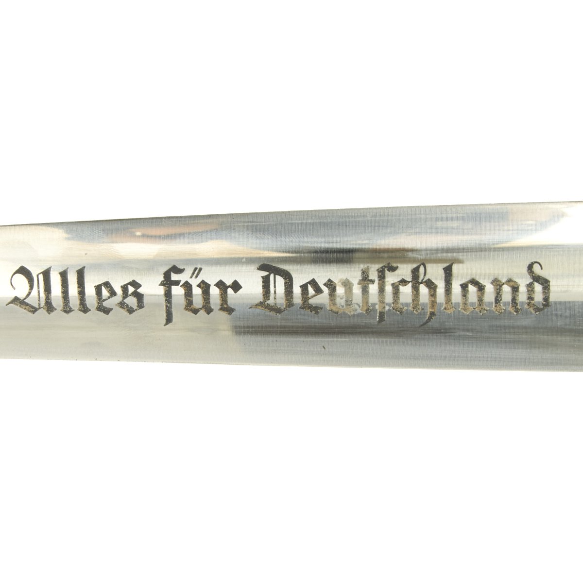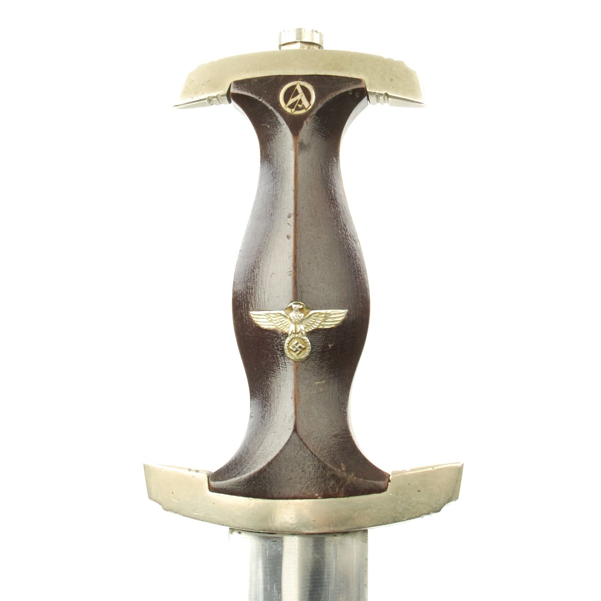 The blade was etched with the SA motto, Alles für Deutschland. Examples produced prior to 1935 were stamped with the German sector of the SA group on reverse lower crossguard. Later examples underwent standardization through the RZM ministry. These pieces were produced of cheaper plated zinc-base fittings and scabbards were simply painted brown.