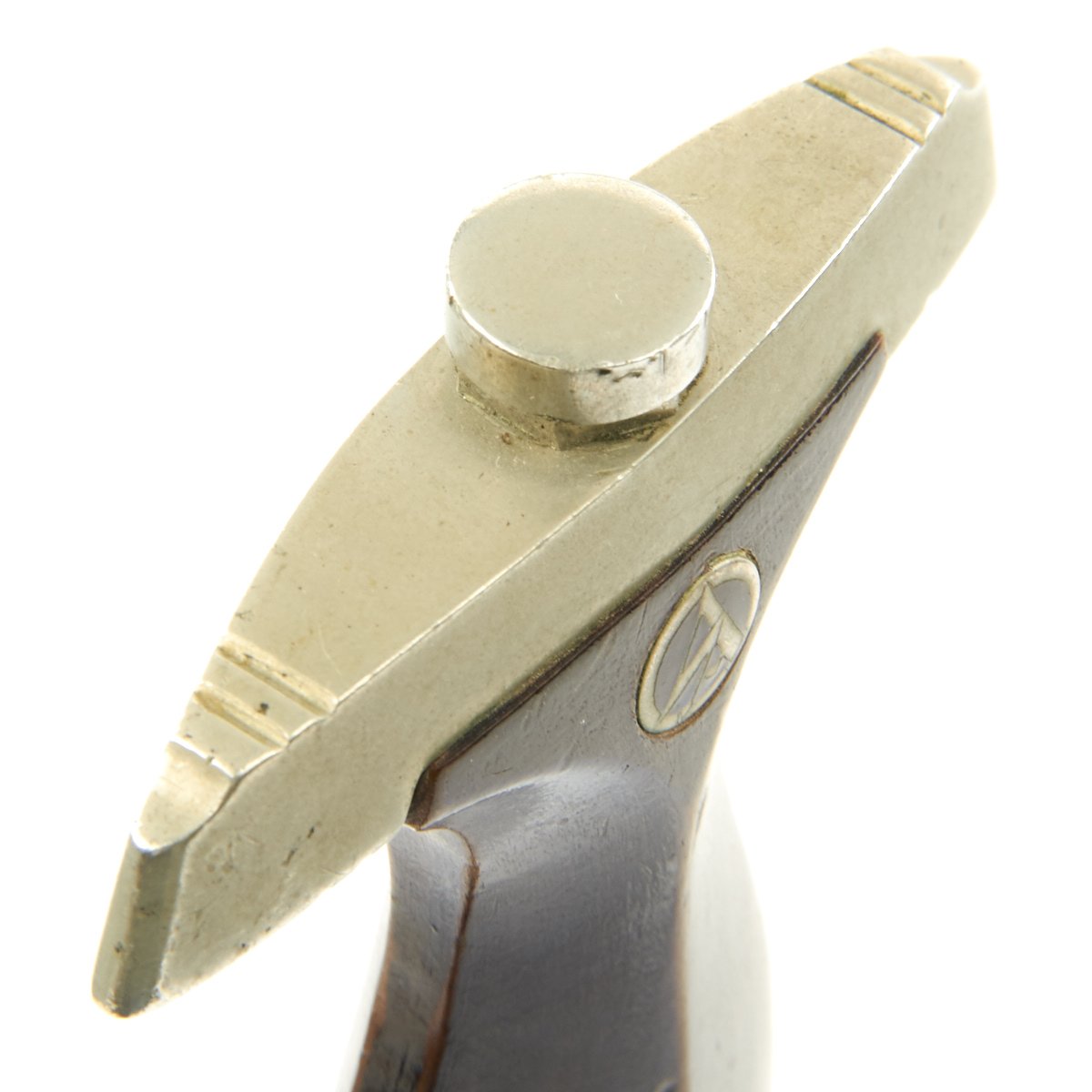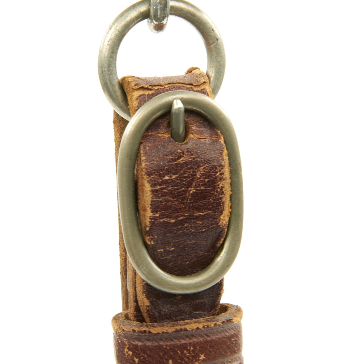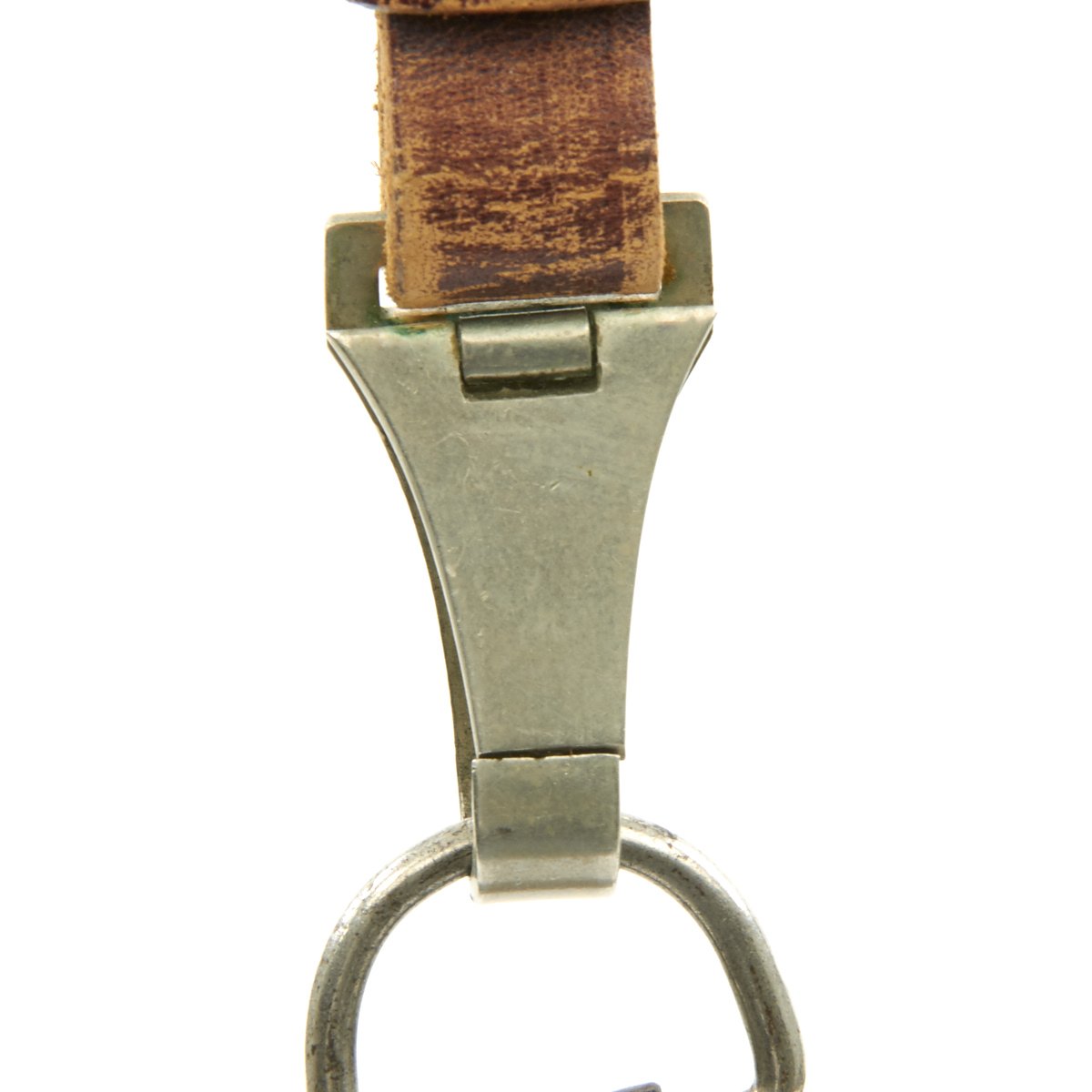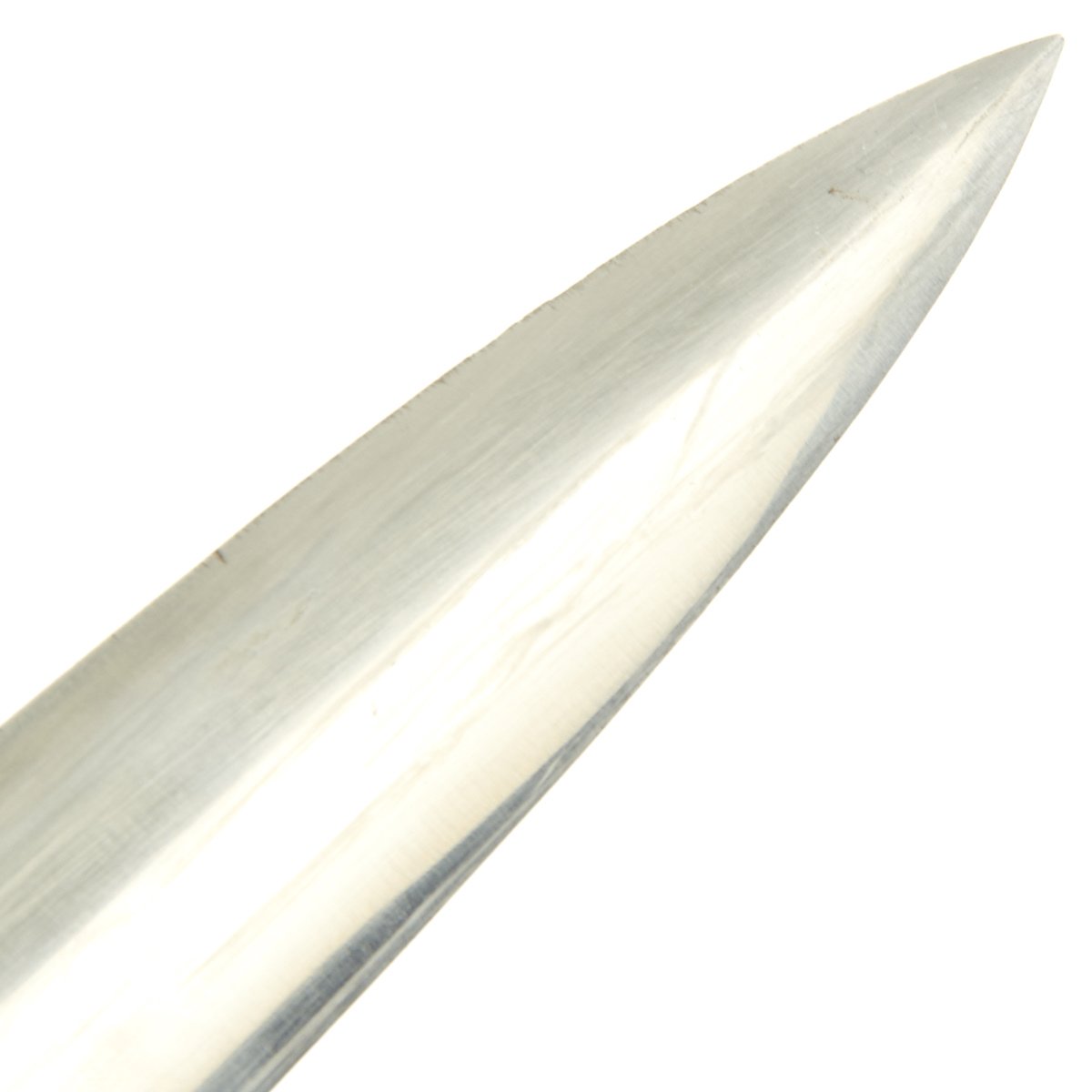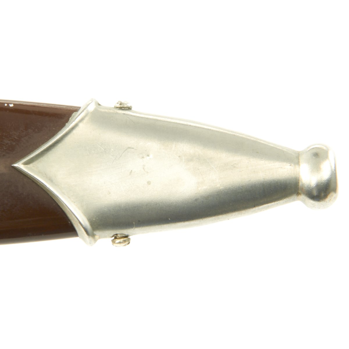 The scabbard shell is straight throughout and is the mid-war style, with a very nice brown enamel finish. Overall it is in good condition, but it was definitely arsenal re-worked at one point, probably replacing the shell and lower fitting. The upper fitting shows age, and is solid Nickel-Silver. The bottom mount actually appears to be polished aluminum due to the surface texture, and has a dent in the bottom of the drag. The throat nicely matches the crossguards and the screws for the top and bottom mounts are still present.
