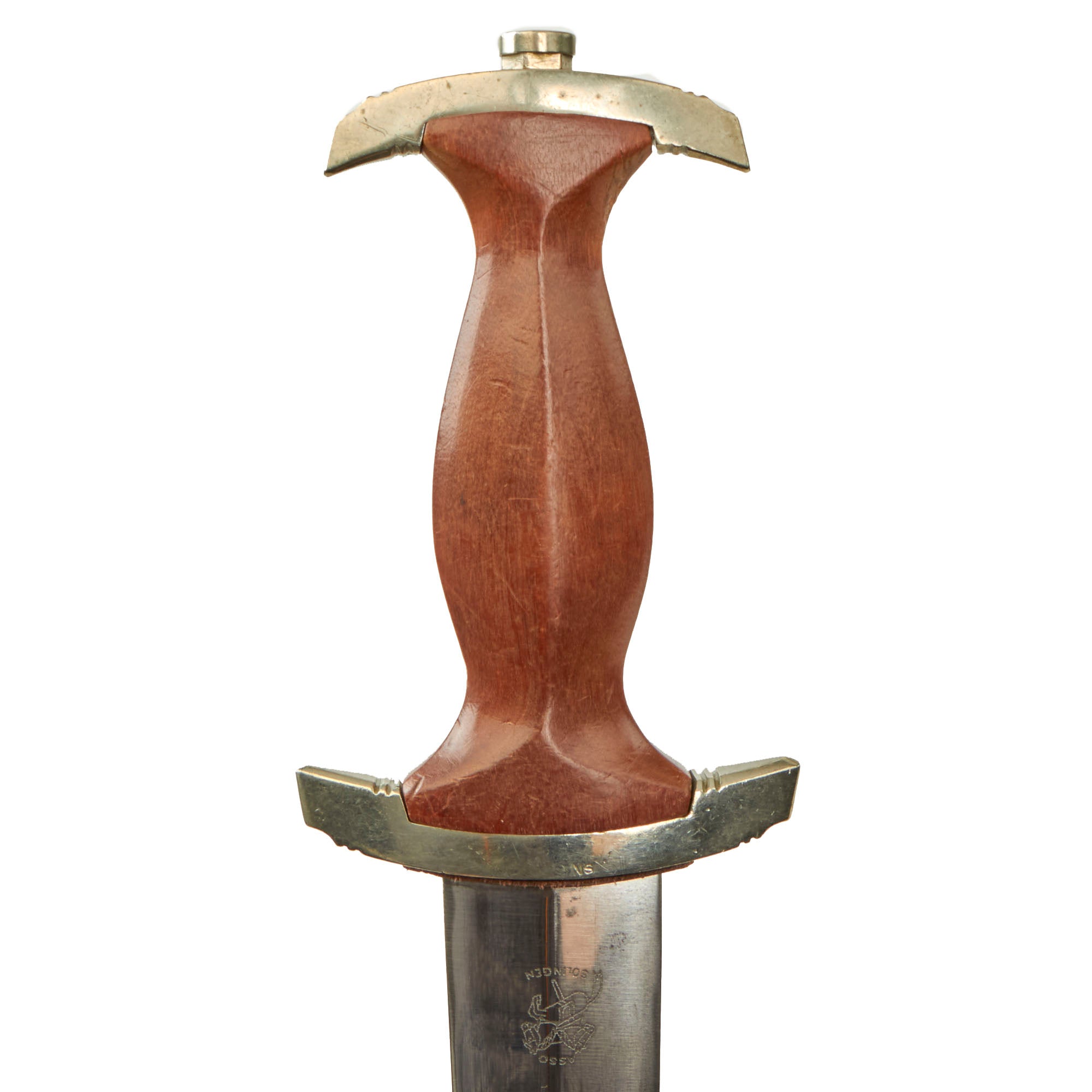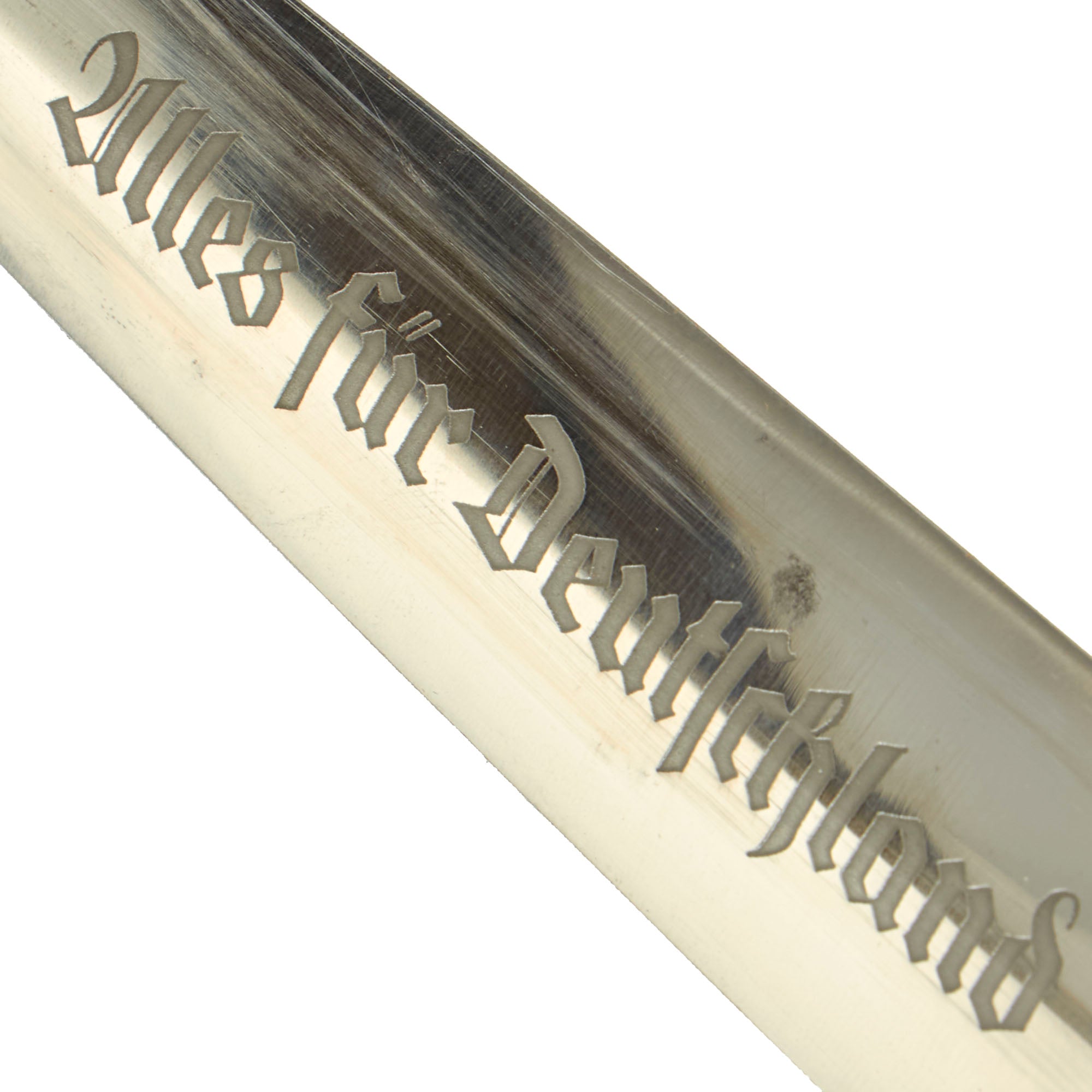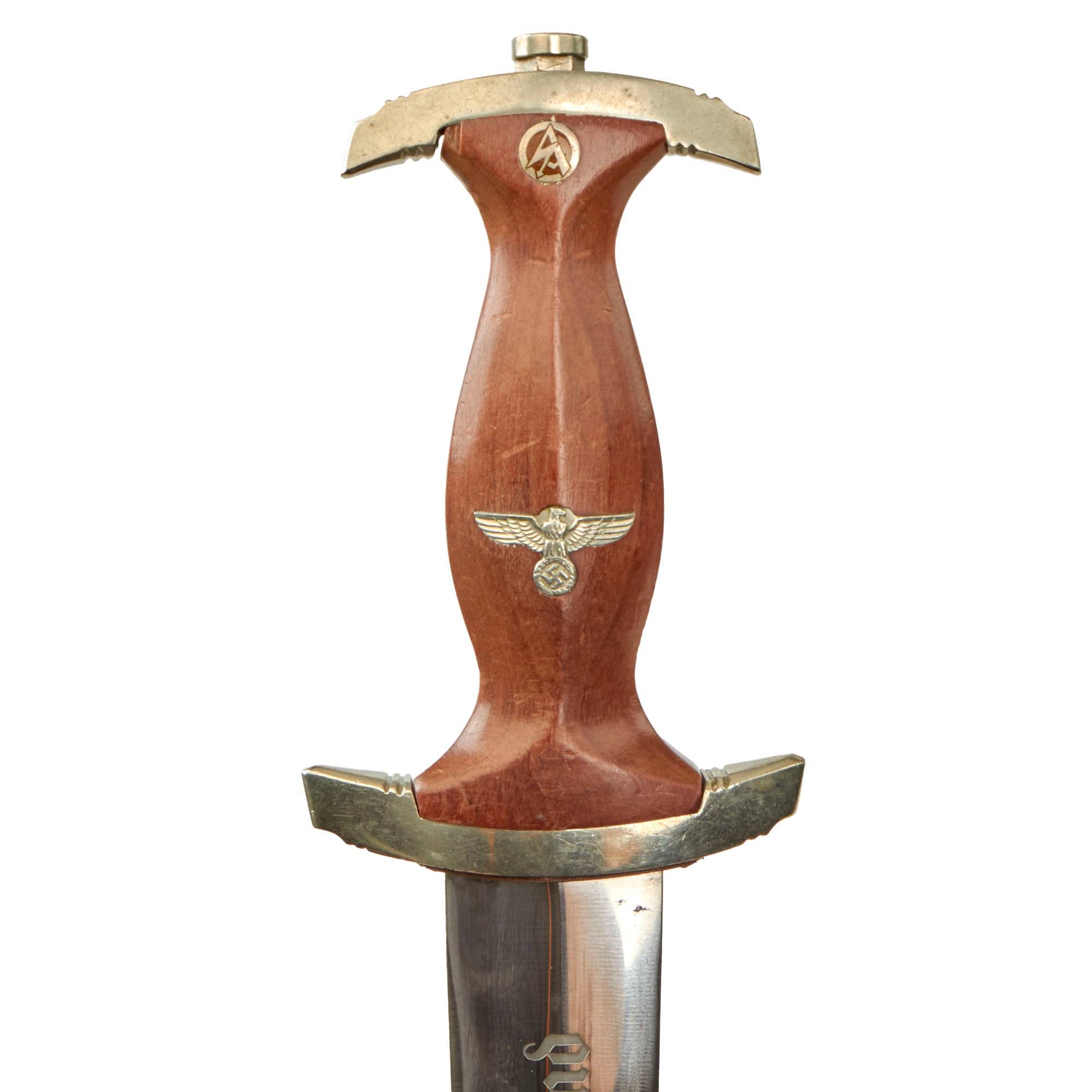 The blade was etched with the SA motto, Alles für Deutschland. Examples produced prior to 1935 were stamped with the German sector of the SA group on reverse lower crossguard. Later examples underwent standardization through the RZM ministry. These pieces were produced of cheaper plated zinc-base fittings and scabbards were simply painted brown.