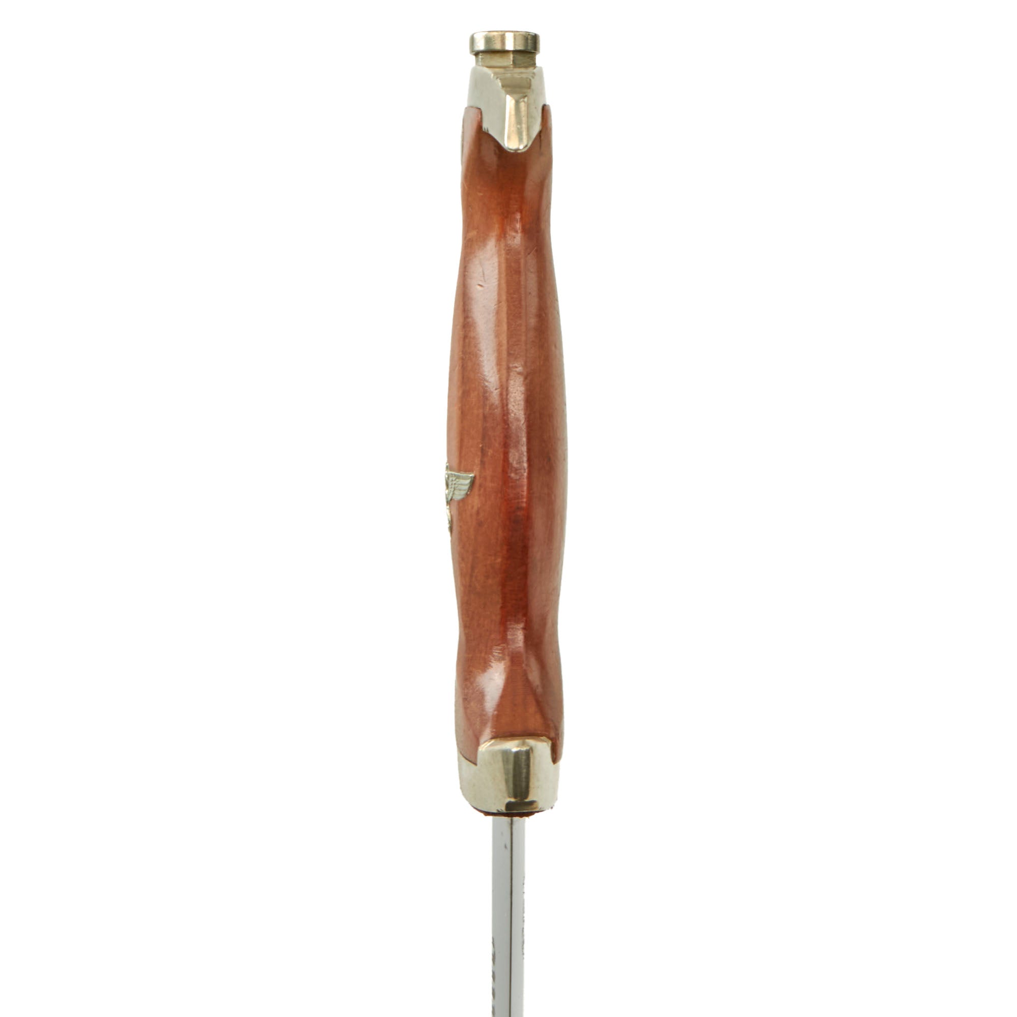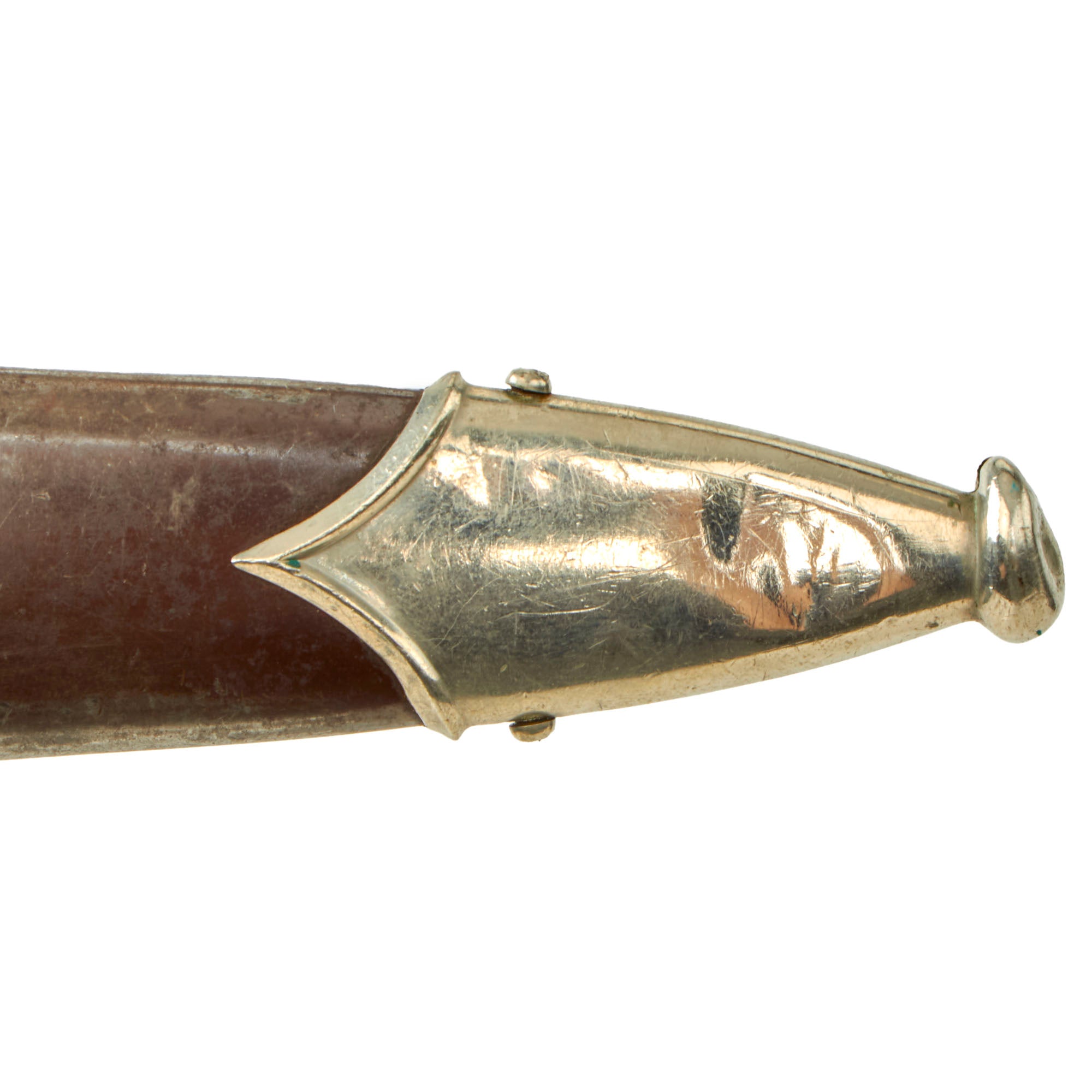 The scabbard shell is straight and dent free, unlike most that we see. It is the correct early-war style, with a brown "anodized" finish on the steel, which was then lacquered. This example has lost much of the lacquer, which has allowed the anodized finish to wear, and some oxidation to occur to the steel shell. The original finish is only well retained near the fittings, which is a fairly standard wear pattern, and has a great aged look. The upper and lower fittings are solid nickel silver, with a great lightly used look. The chape fitting at the end of the scabbard is dented in and split, as the nickel alloy is somewhat soft, a common thing to see. The throat nicely matches the crossguards, and all fittings have their original dome headed screws, which are in very good shape.