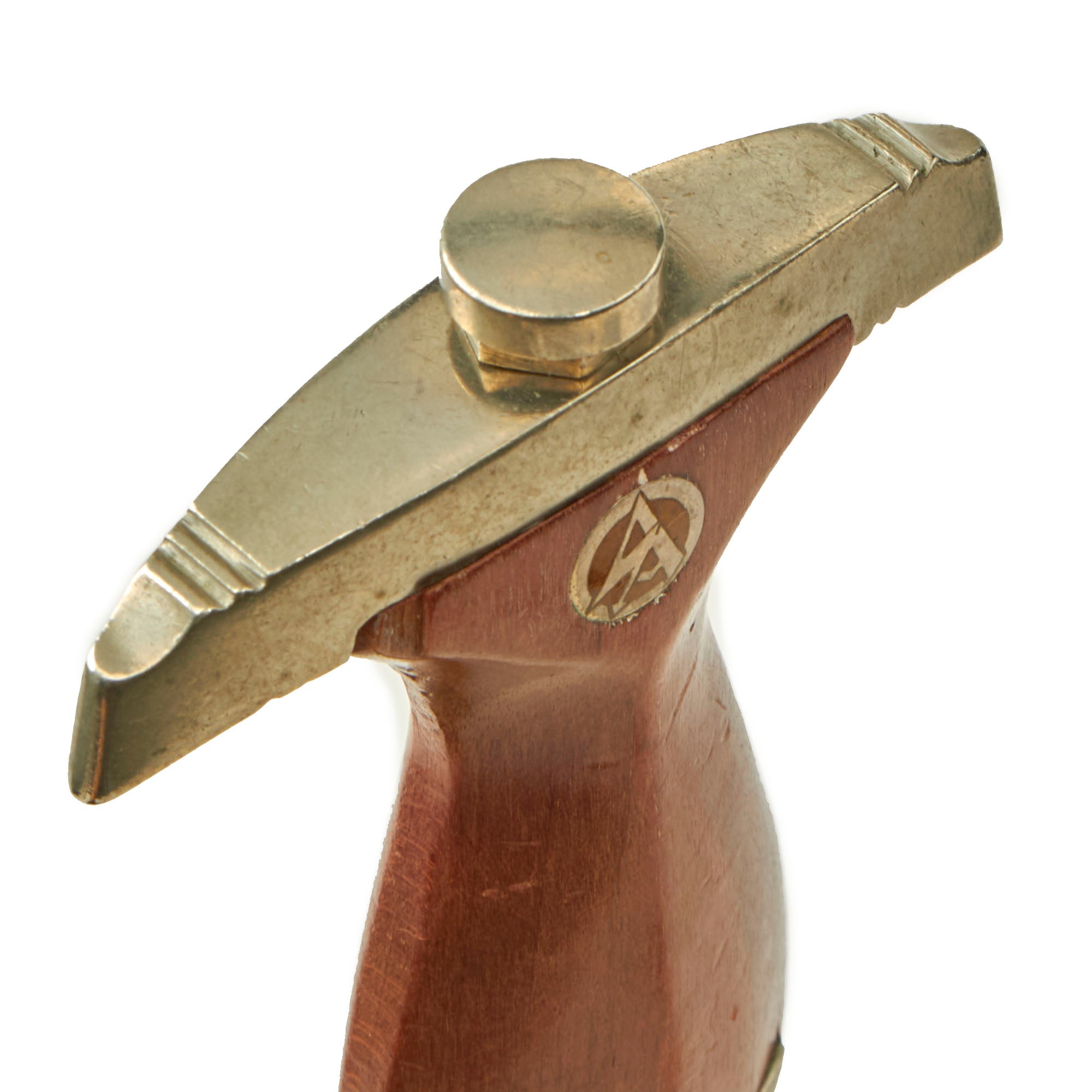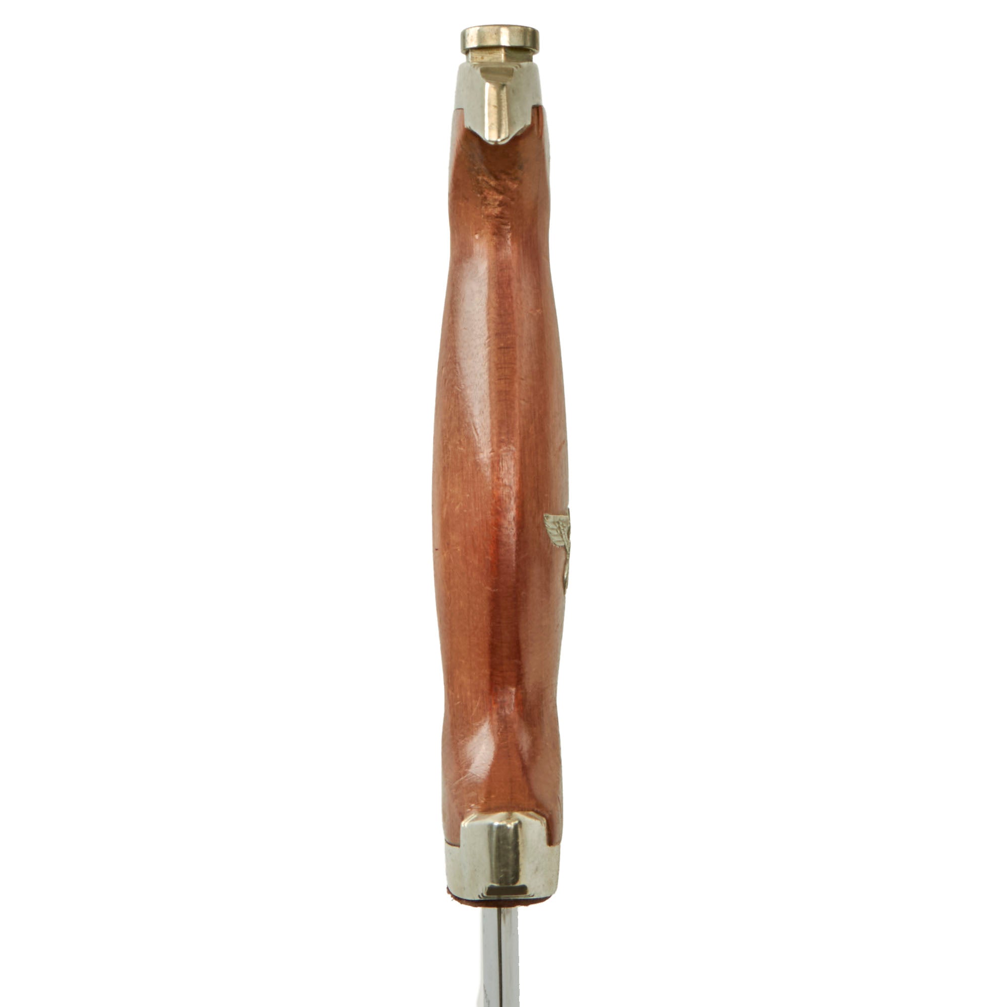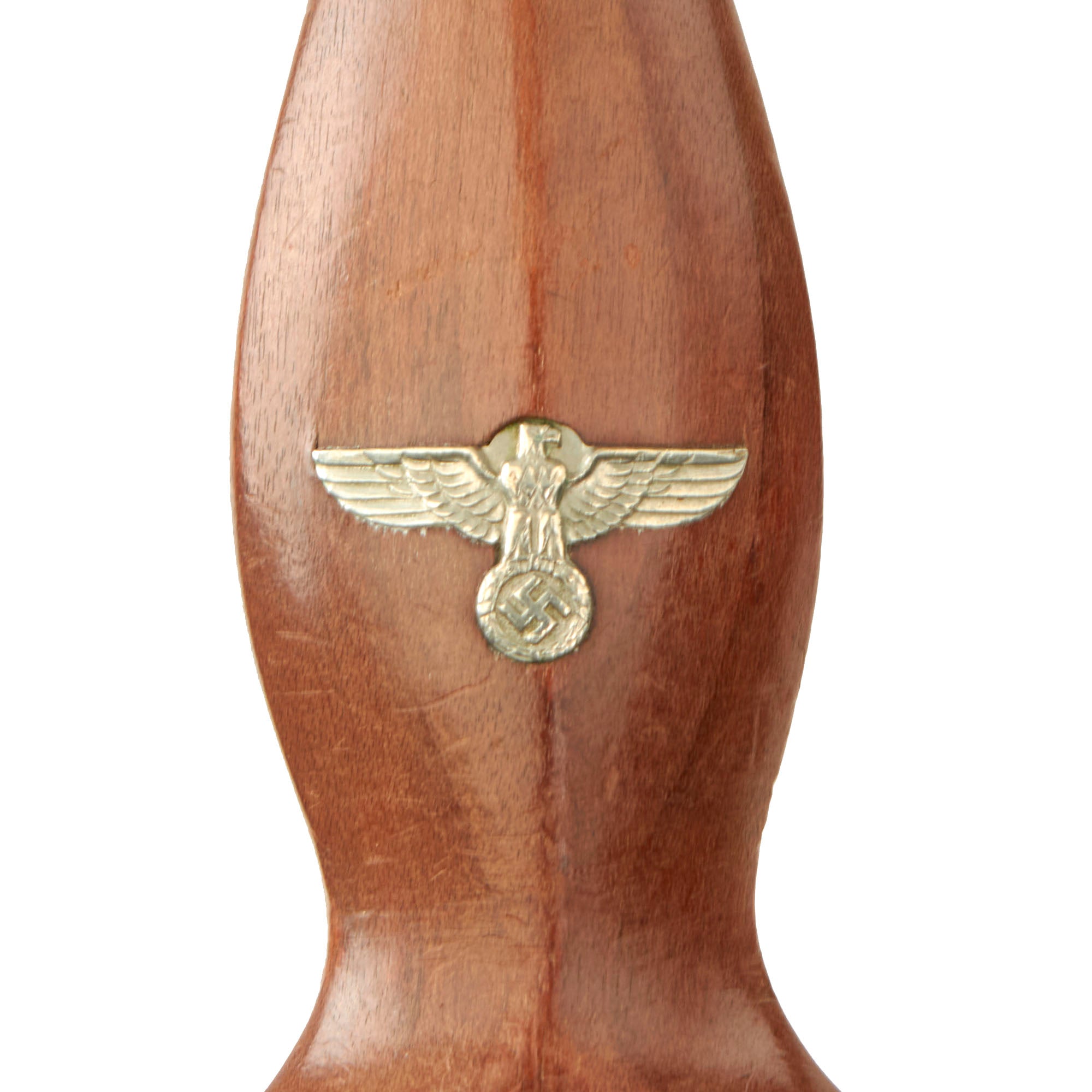 The grip is a fine product having a lovely mahogany color, with medium center ridge construction, showing only light wear with a few small pressure dents. The wood is still in very good condition, with some great color variation, and fits the cross guards nicely. There aside from a small chip by the pommel guard, there is no cracking or other missing wood. The pommel nut shows just a bit of turning on the hexagonal area, and the grip is still tightly secured, with no wiggle. The SA symbol button is nicely set, with the translucent enamel is fully intact, and the plating fully retained. The grip eagle is a fine example being the style with beak that points straight. It has just a bit of verdigris on it, showing that it is solid nickel alloy, and it has patinated nicely. The details are still there to the eagle to include the beak, breast feathering, wing feathering, talons, wreath and mobile swas (hook cross).
