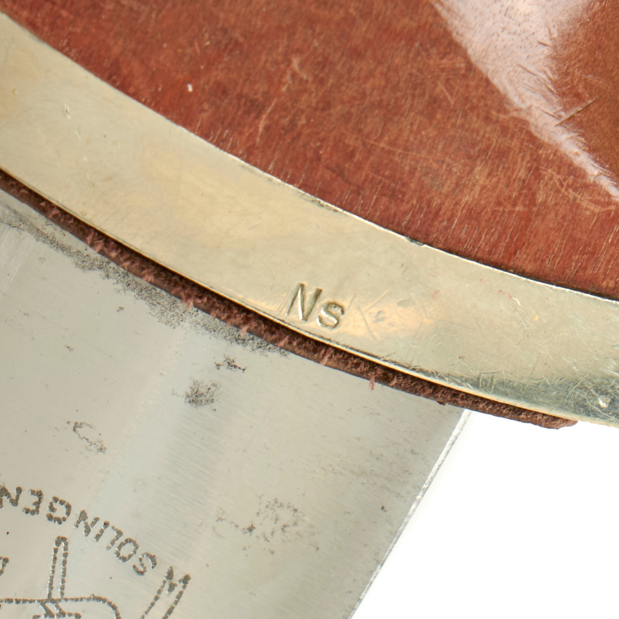 The dagger has solid nickel silver fittings throughout, and is a great example with a lovely look. The crossguards and tang nut are in very good condition throughout with all fittings having a nice lightly aged patina. There is just a bit of age to these mounts but there is no lifting anywhere, showing that they are solid and not plated. They show only light wear with just a bit of light denting and scratching, and do look to have been cleaned a bit over the years, however the accent grooves are still strong. The lower reverse guard is Gruppe/Gau marked Ns, for Niedersachsen (Lower Saxony) a district in north central Germany, with the principal city being Hannover. This feature was only seen on daggers produced 1935 and prior.