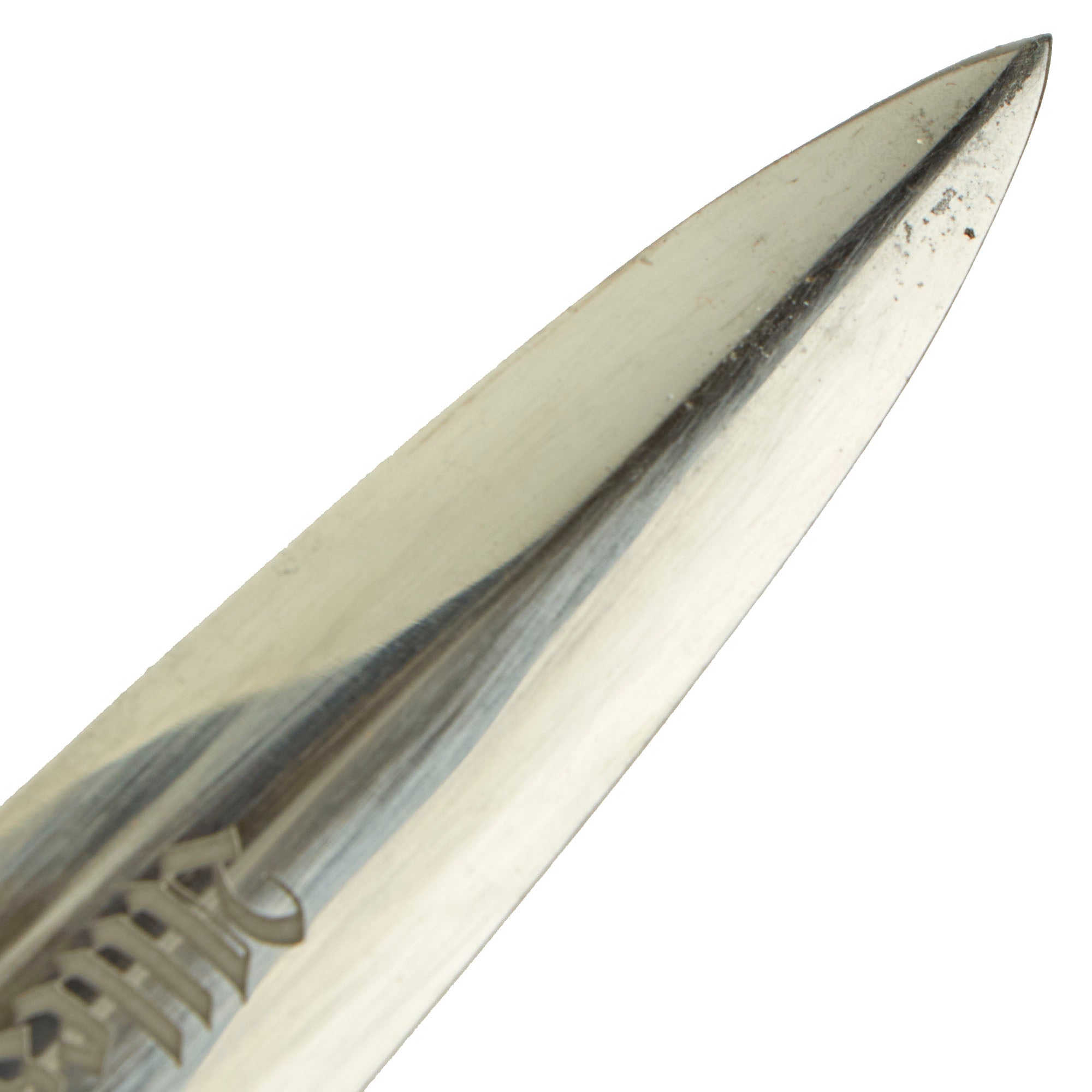 Prior to his "unmasking" as a traitor, Ernst Röhm was the leader of the SA. In 1934, he distributed approximately 100,000 SA daggers with his personal inscription on the reverse blade. These daggers were to honor individuals who had served with the SA prior to December, 1931. Other than the inscription, these pieces were identical to the standard M1933 SA dagger. After the Röhm purge, the inscription was ordered to be removed. Many examples were returned to the factory for grinding. Others were simply ground in the field by whatever means were available. Examples will occasionally be encountered with remnants of the original inscription remaining on the blade, but mostly none will remain. Some blades exist with an intact inscription, reflecting only the removal of the Röhm signature. Very very rarely is an example seen with a full, untouched inscription, as the holder would have surely risked a charge of treason.