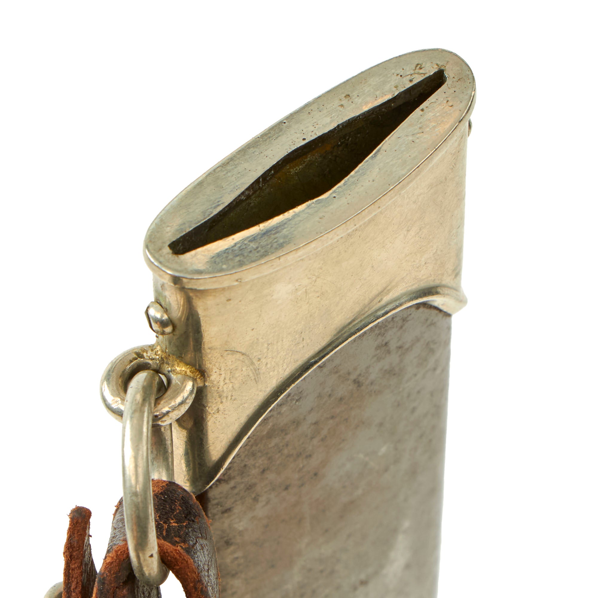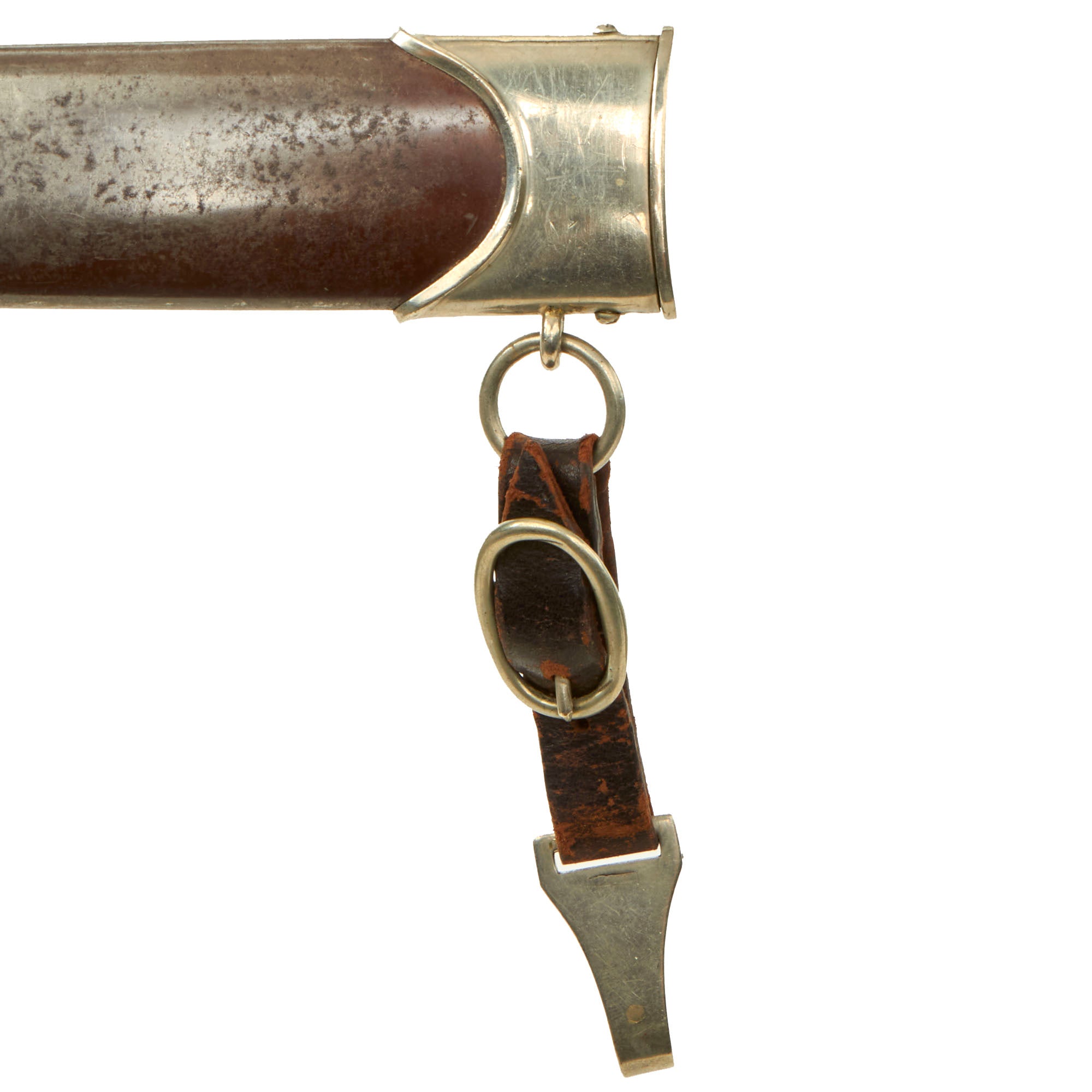 Attached to the hanger ring on the scabbard is a very nice early pattern belt hanger, with solid nickel hardware and dark brown or black finished leather. The leather is in good condition, showing a wear and cracking to the finish, but no tearing or other major damage. There is no maker marking we can see on the fully functional end clip.