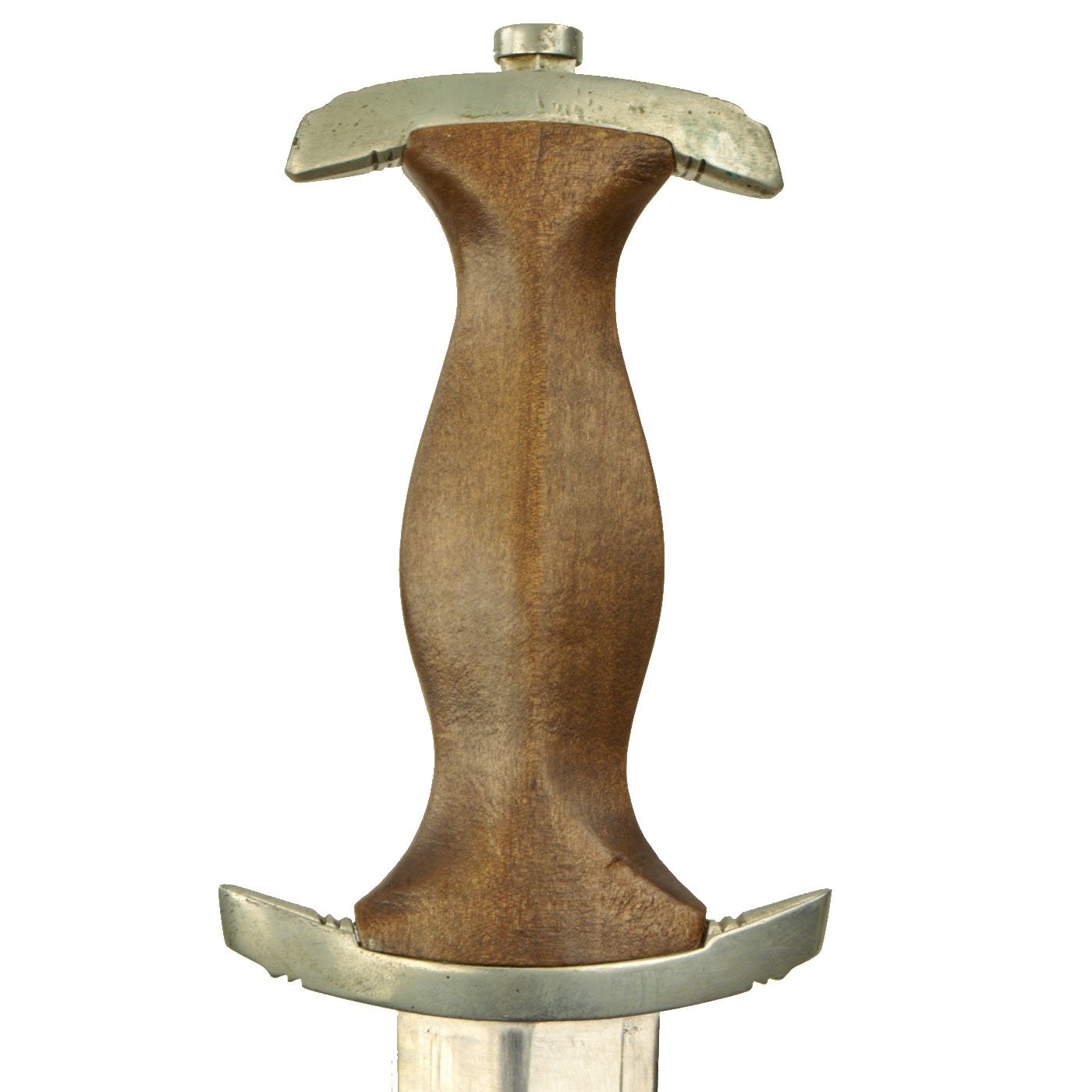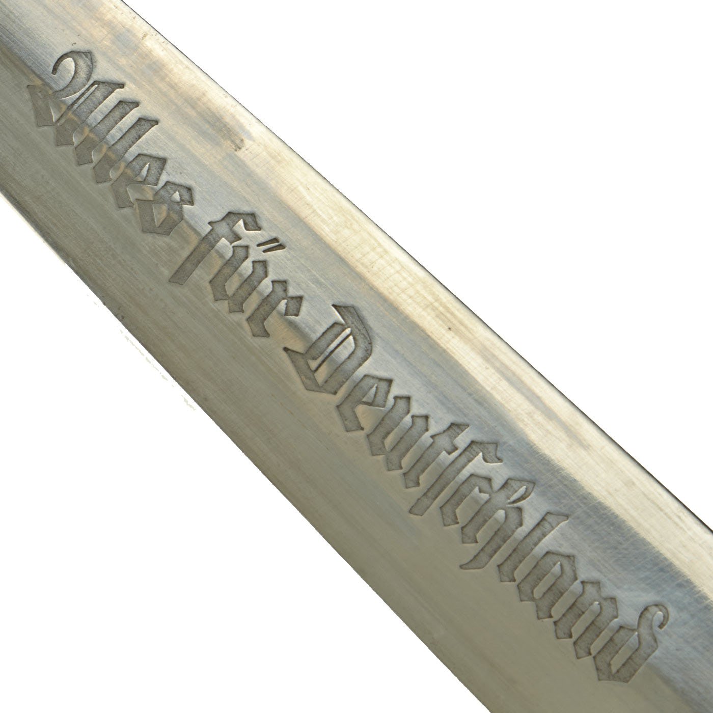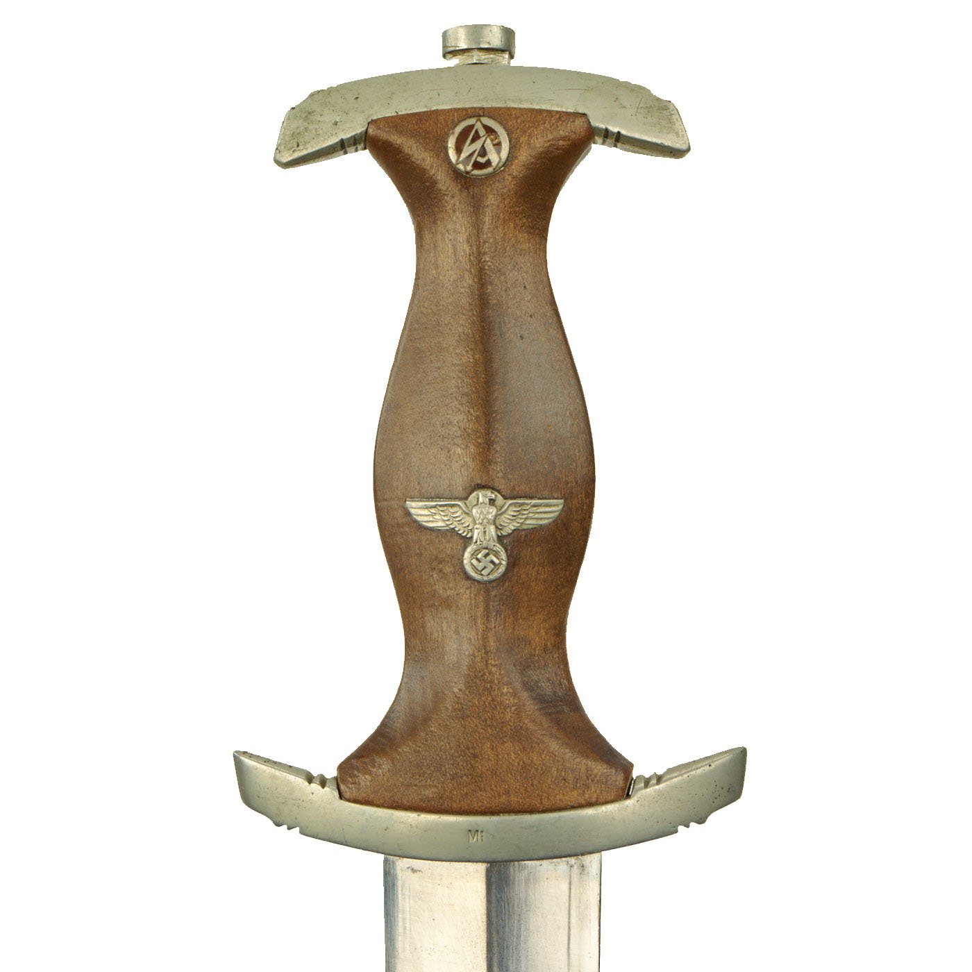 The blade was etched with the SA motto, Alles für Deutschland. Examples produced prior to 1935 were stamped with the German sector of the SA group on reverse lower crossguard. Later examples underwent standardization through the RZM ministry. These pieces were produced of cheaper plated zinc-base fittings and scabbards were simply painted brown.