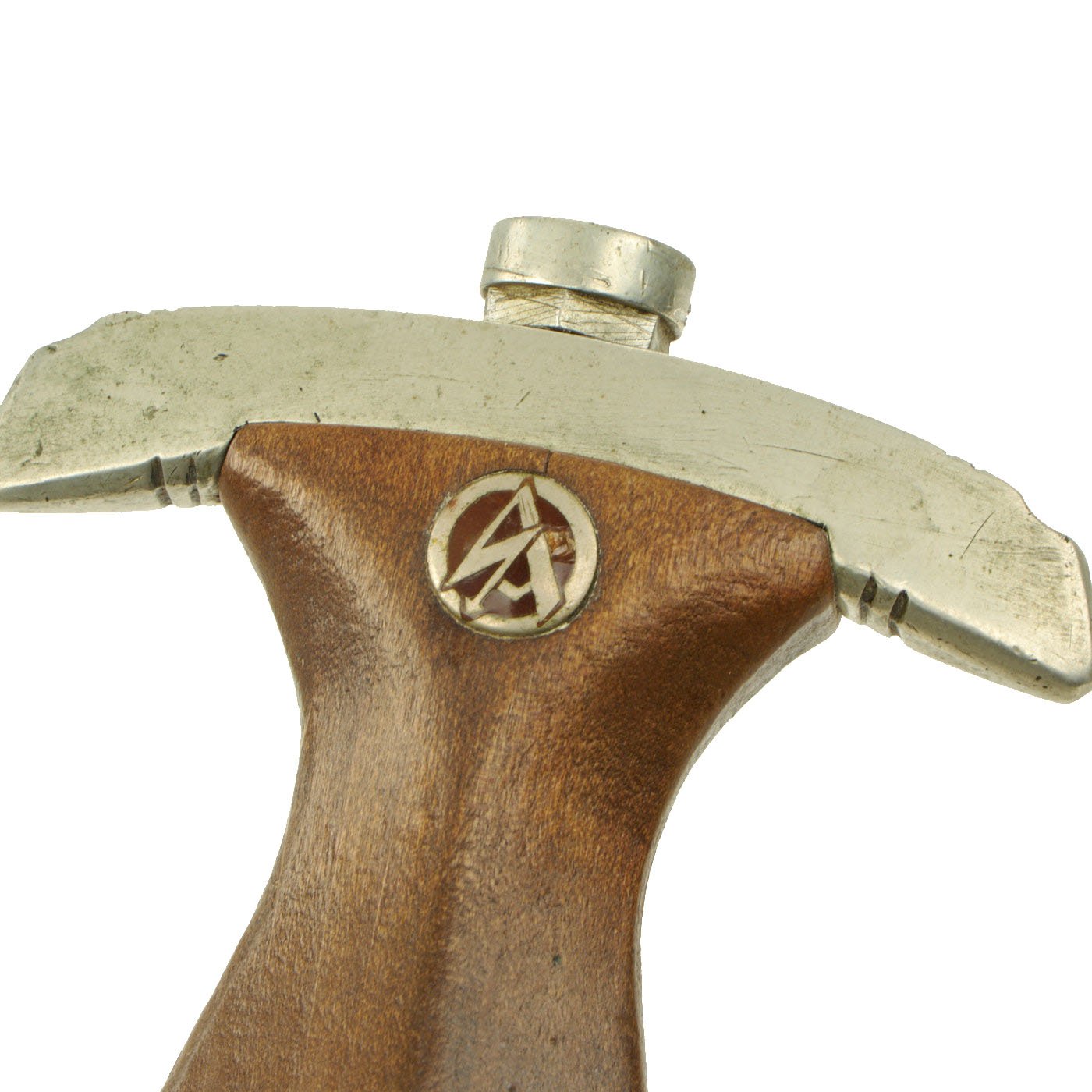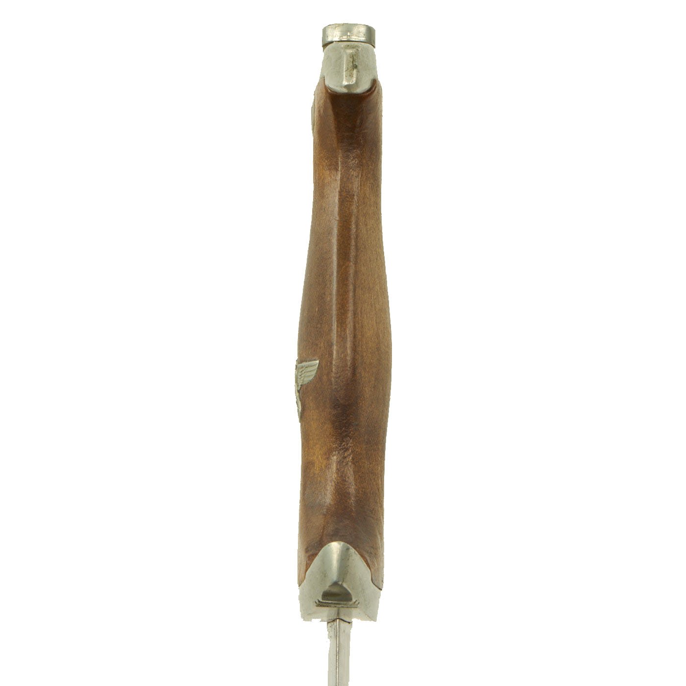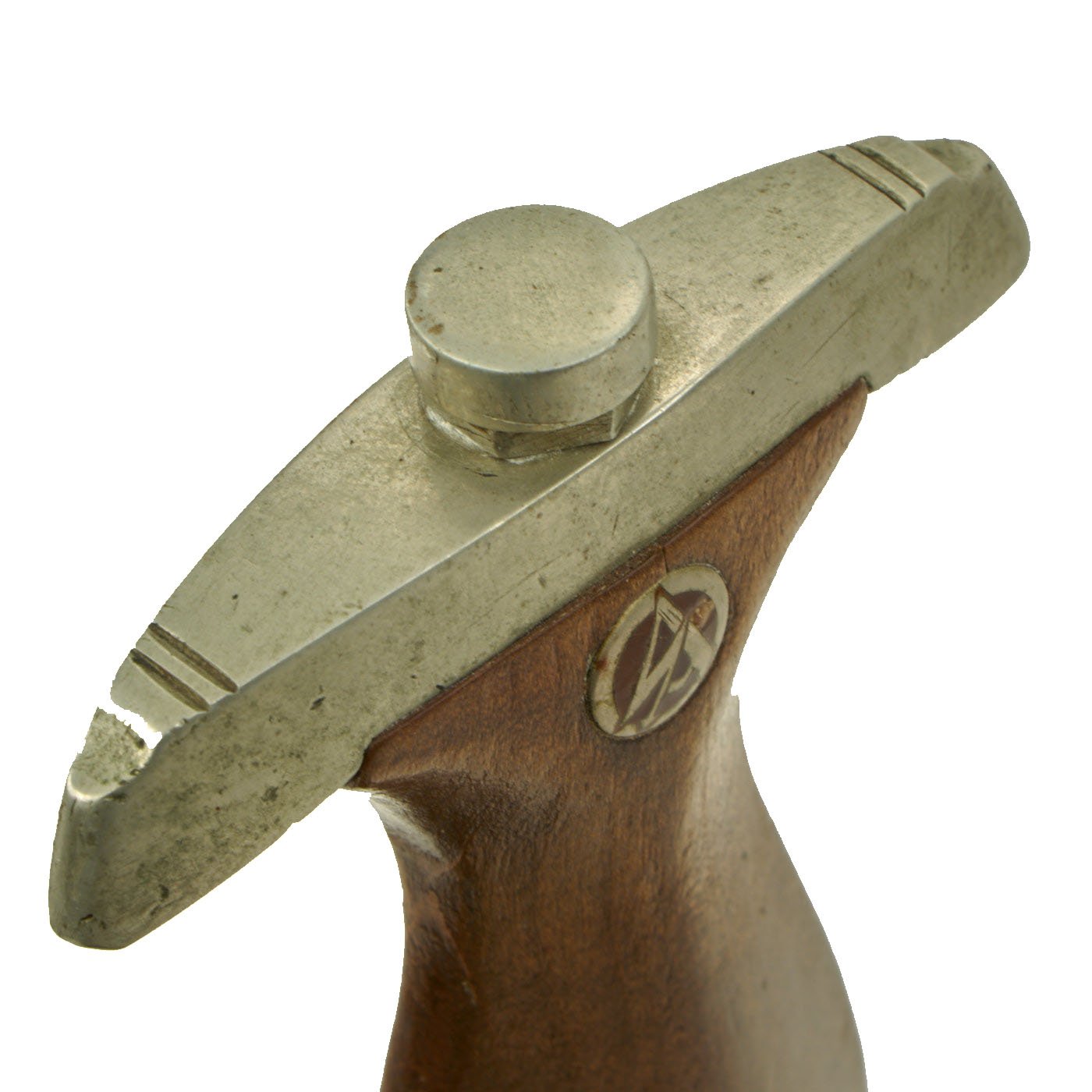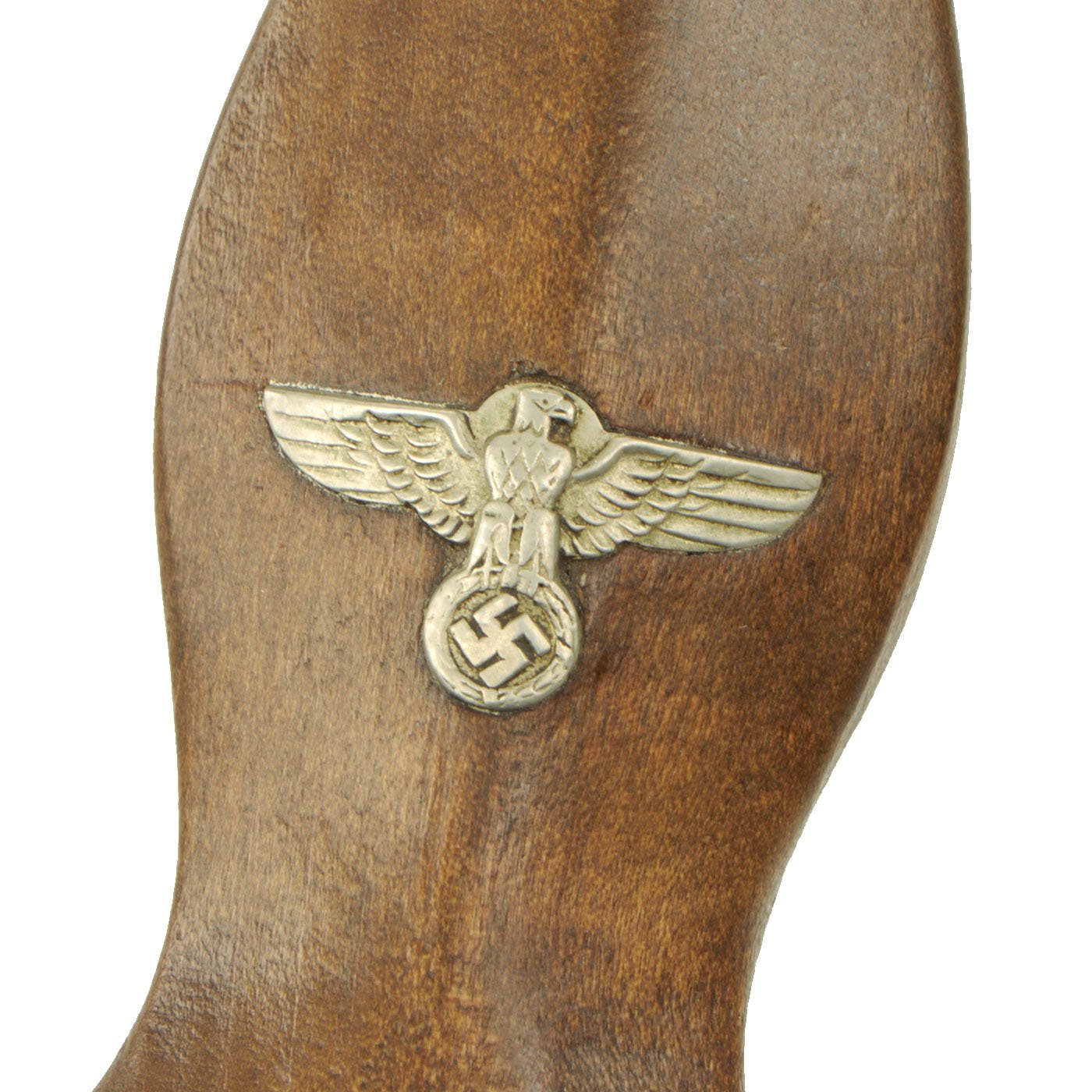 The SA symbol button is still nicely set, and still has much of the translucent enamel intact, though there is a chip, and the nickel plating is intact. The grip eagle is a fine example being the style with beak that points straight. It has just a bit of verdigris on it, showing that it is solid nickel alloy, and it has patinated nicely. The details are still there to the eagle to include the beak, breast feathering, wing feathering, talons, wreath and mobile swas (hook cross).