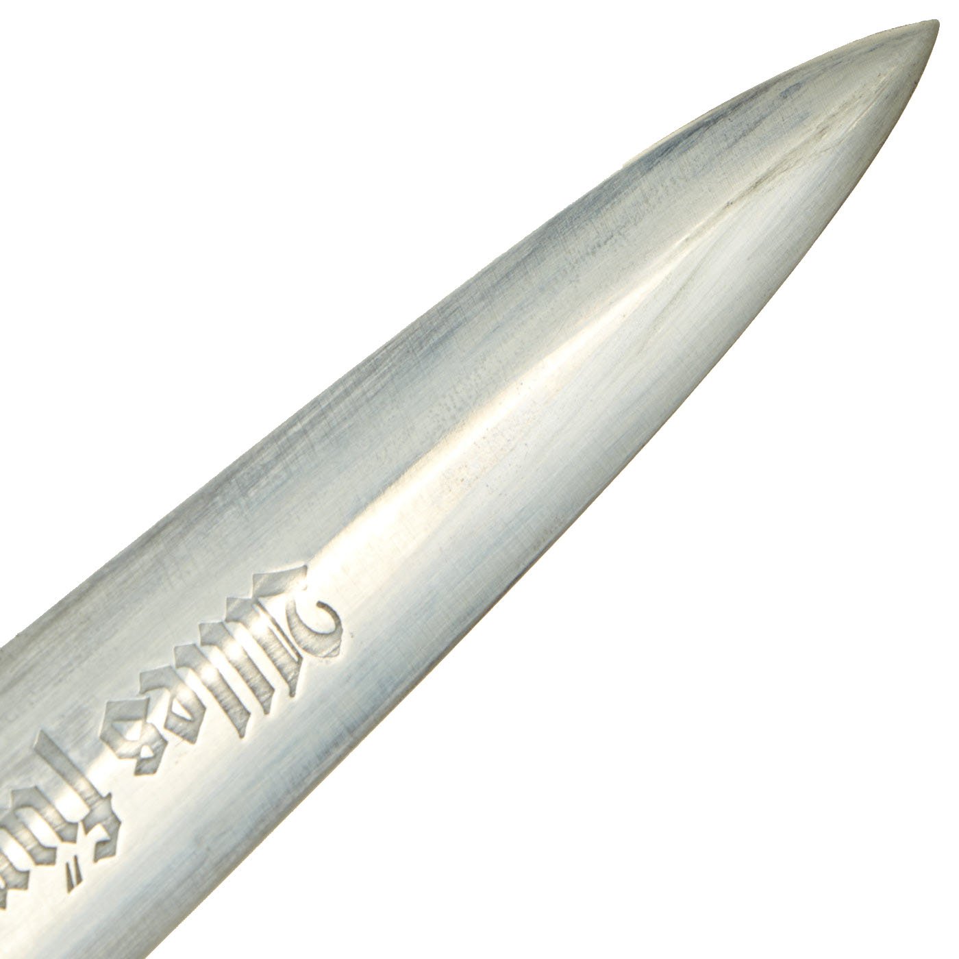 The blade on this example is quite nice, though it does show signs of having been re-polished, either at the factory or post war. The original factory crossgrain is removed, with the new polishing marks being more prominent. We do not see any evidence that this is a "Ground Röhm" dagger, though the possibility is always there. The blade still has the correct factory blunt edges, with no signs of sharpening. The acid-etched Alles für Deutschland (Everything for Germany) SA motto is present, but the polishing has made the edges a bit rounded, and the factory darkening is mostly worn away.