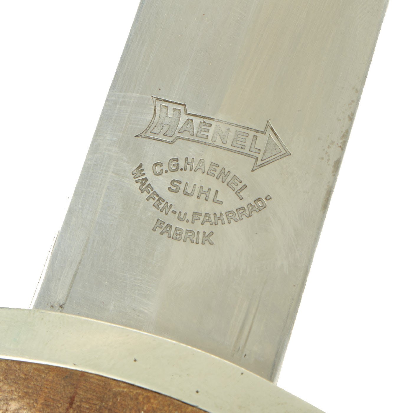Towards the ricasso there is the maker name and logo of C.G. Haenel, Waffen- und Fahrradfabrik AG (Weapons and Bicycle Factory), located in Suhl, Thuringia, which is clear: