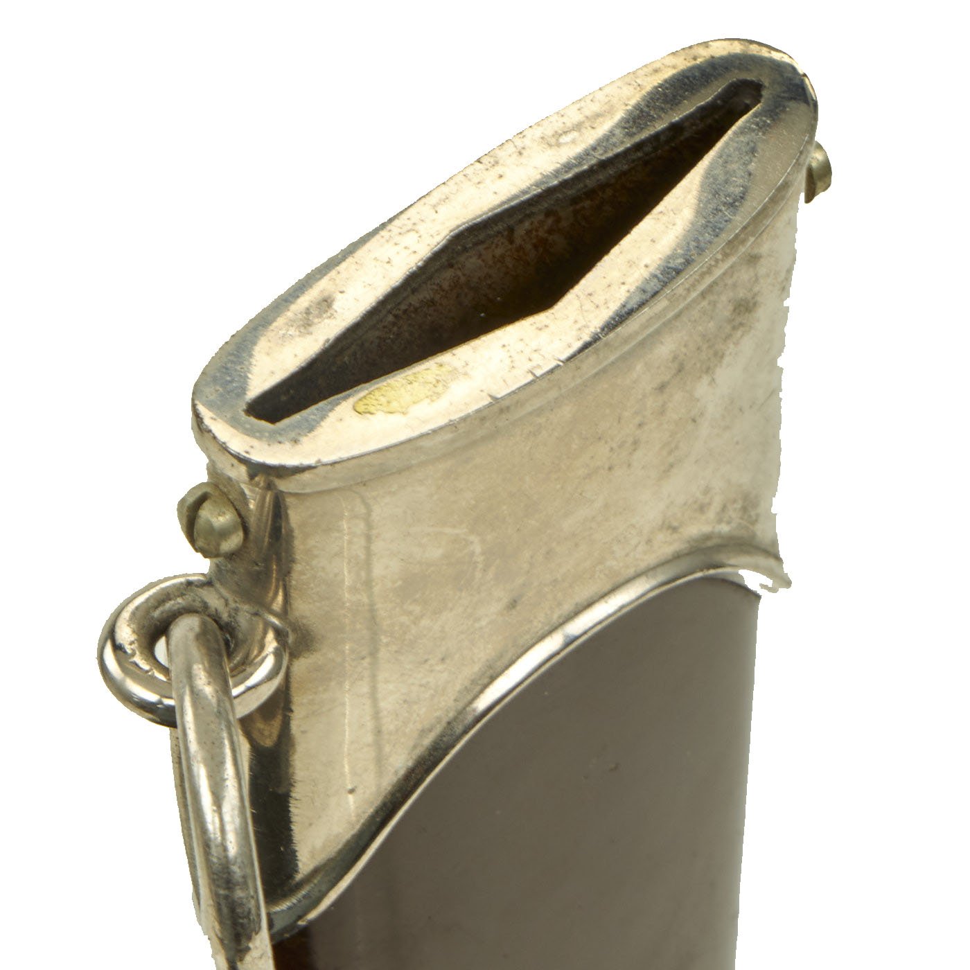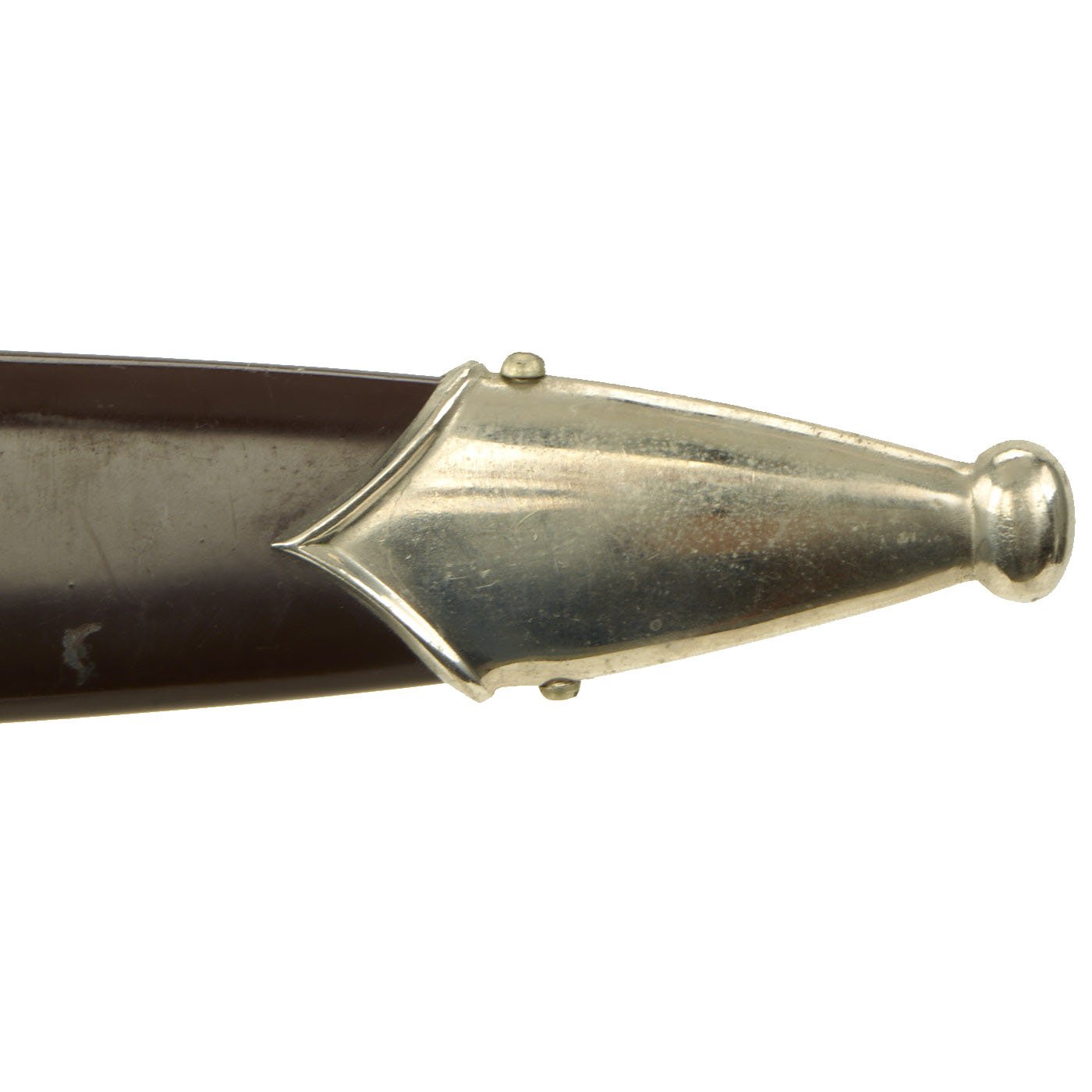 The scabbard shell is straight throughout and has very good original brown enamel paint. It has just a bit of scuffing and the usual crazing in the finish, with only small areas of finish loss. The scabbard shell is equipped with fine matching nickel-plated steel mounts. These mounts are in very good condition overall, with only light plating wear. There is some very light denting of the ball on the chape, which is typical, even with the harder steel alloy. They nicely match the crossguards and are complete with all four dome head screws.