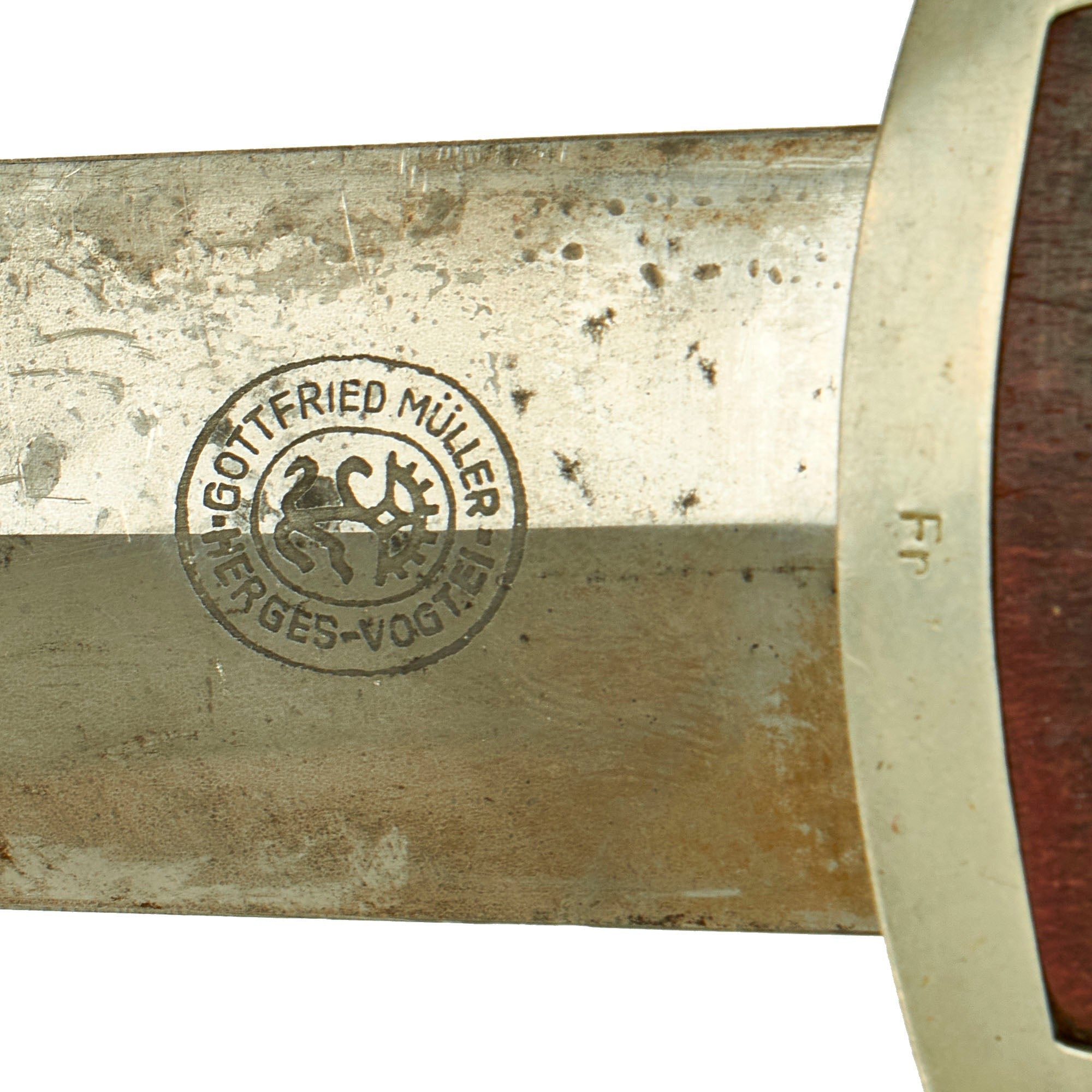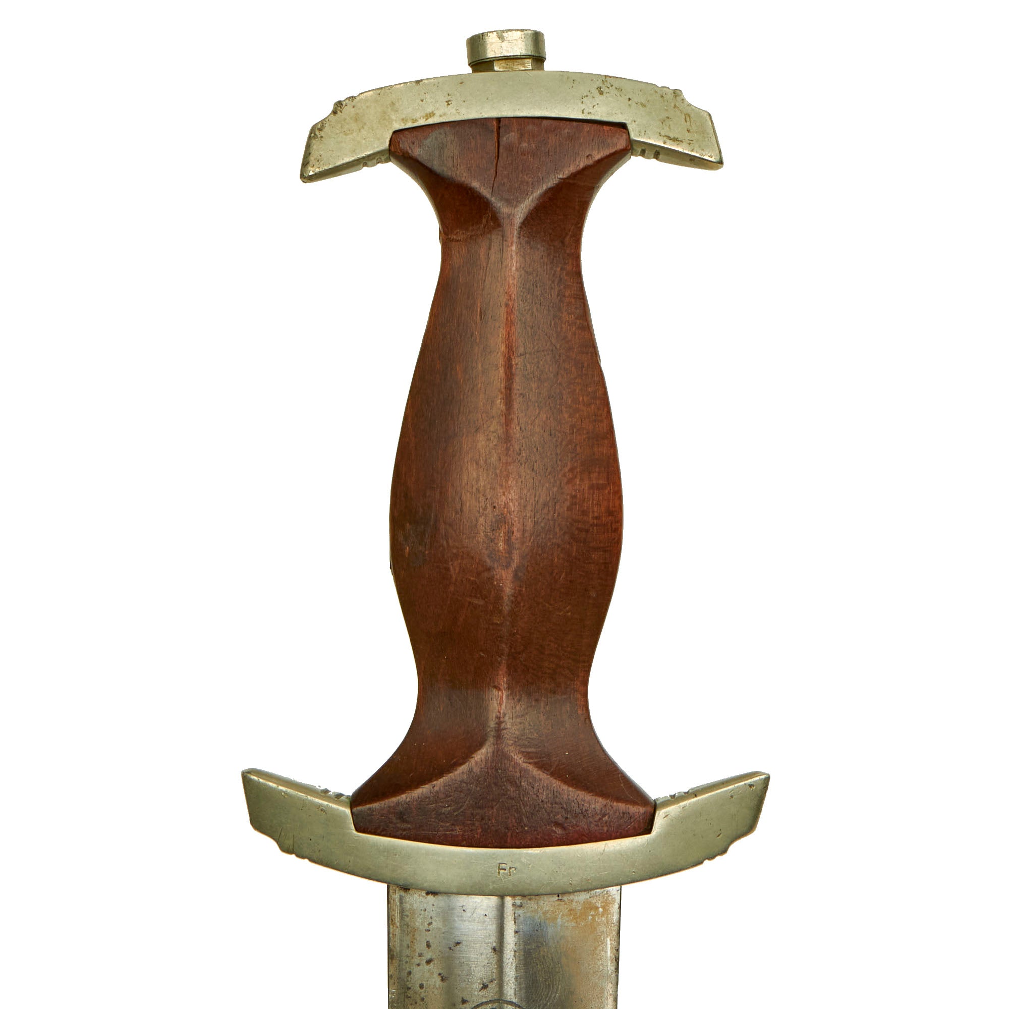 The dagger has solid nickel silver fittings throughout, and is a very nice example. The crossguards and tang nut are in very good condition throughout with all fittings having a nice lightly aged patina. There is some age to these mounts but there is no lifting anywhere, showing that they are solid and not plated. They show only light wear with just a bit of light denting and scratching. The pommel guard however must have taken a blow at some point, as it is now tilted due to the tang itself being bent by the securing nut. The lower reverse guard is Gruppe/Gau marked Fr, for Franken, a district in west central Germany, with the principal cities being Nürnberg (Nuremberg) and Suhl. This feature was only seen on daggers produced 1935 and prior.