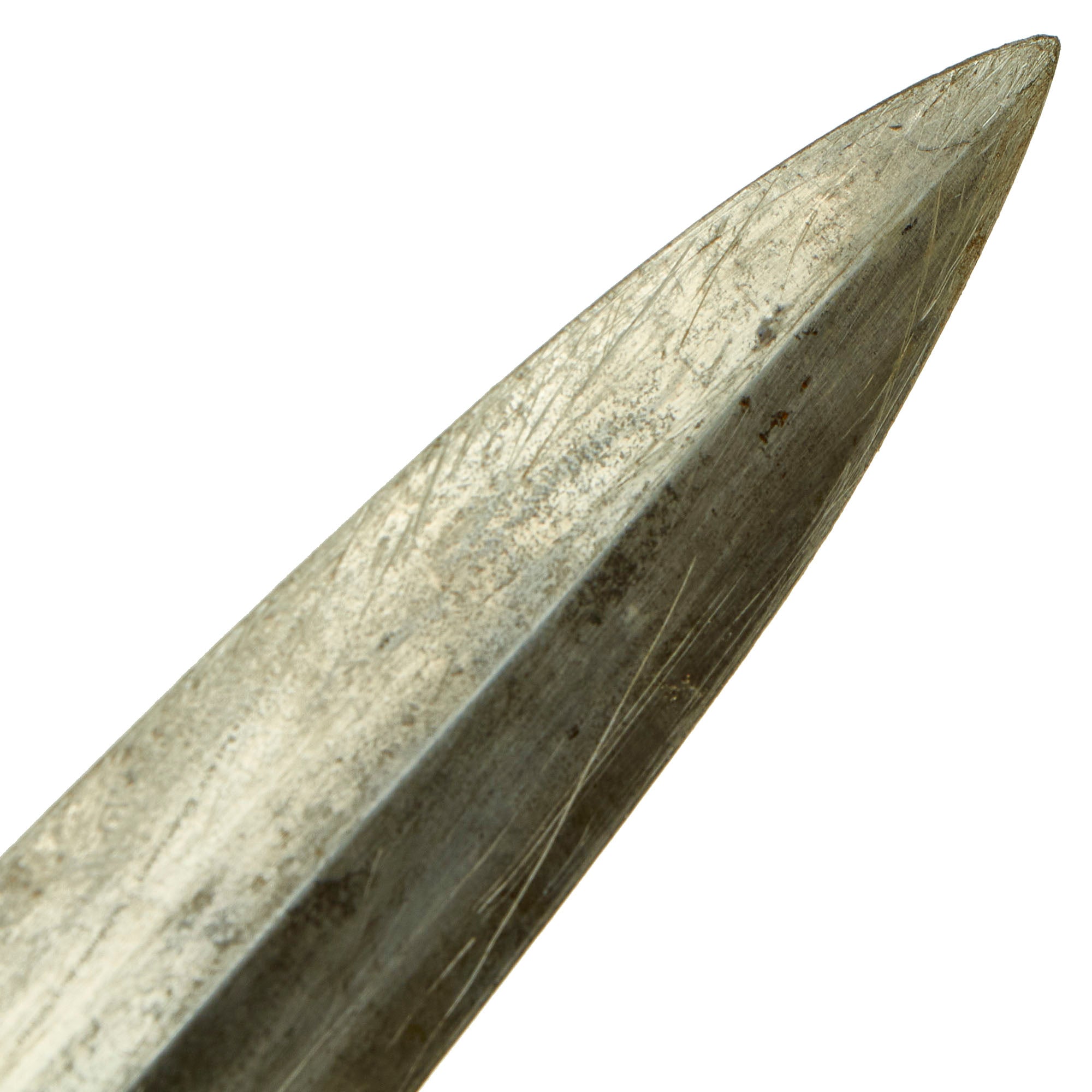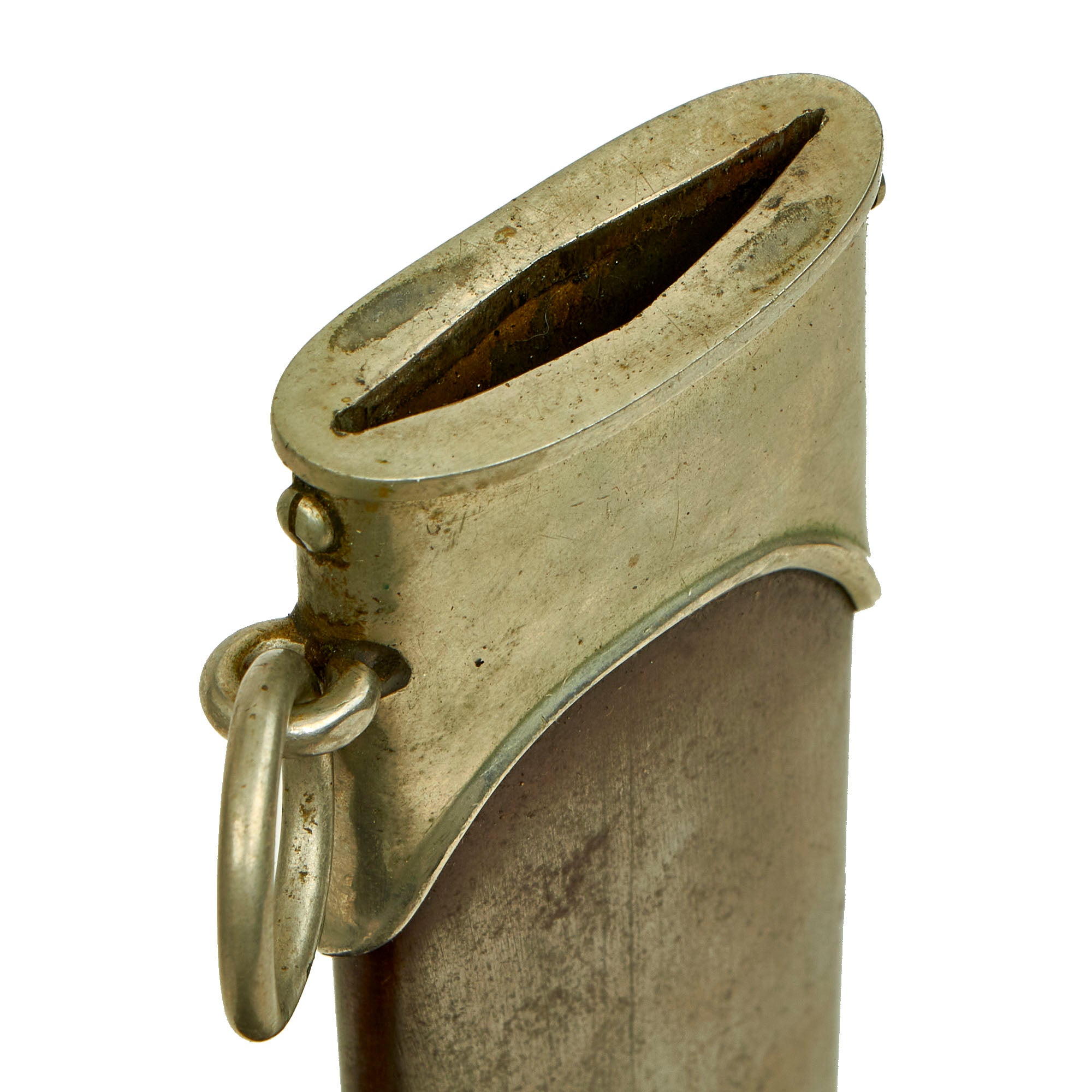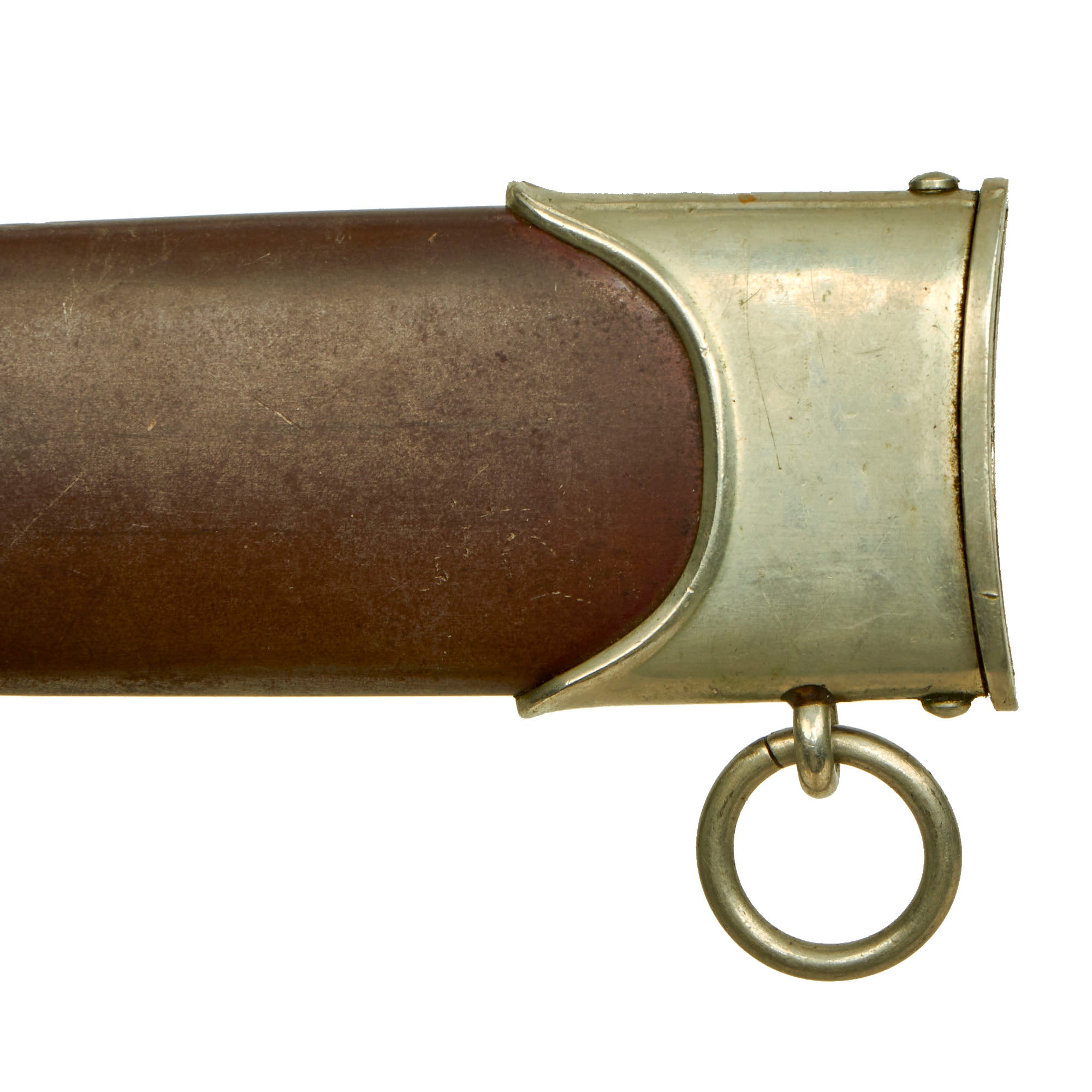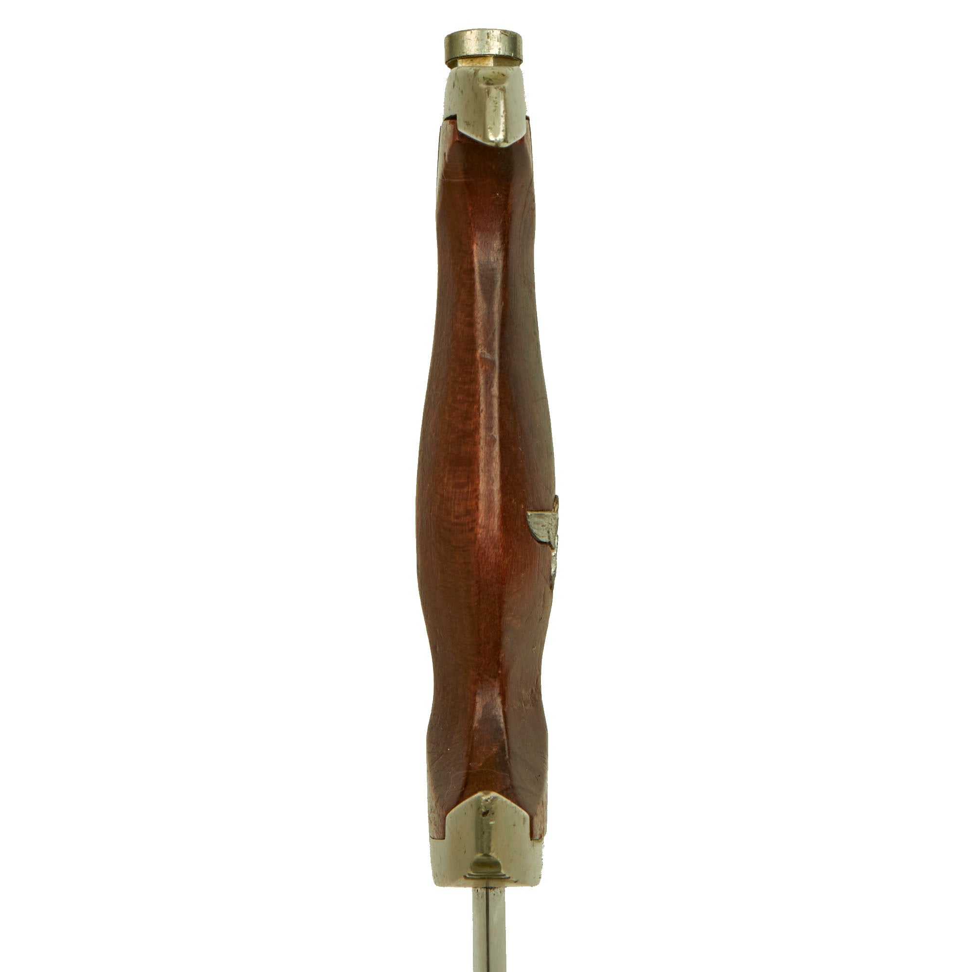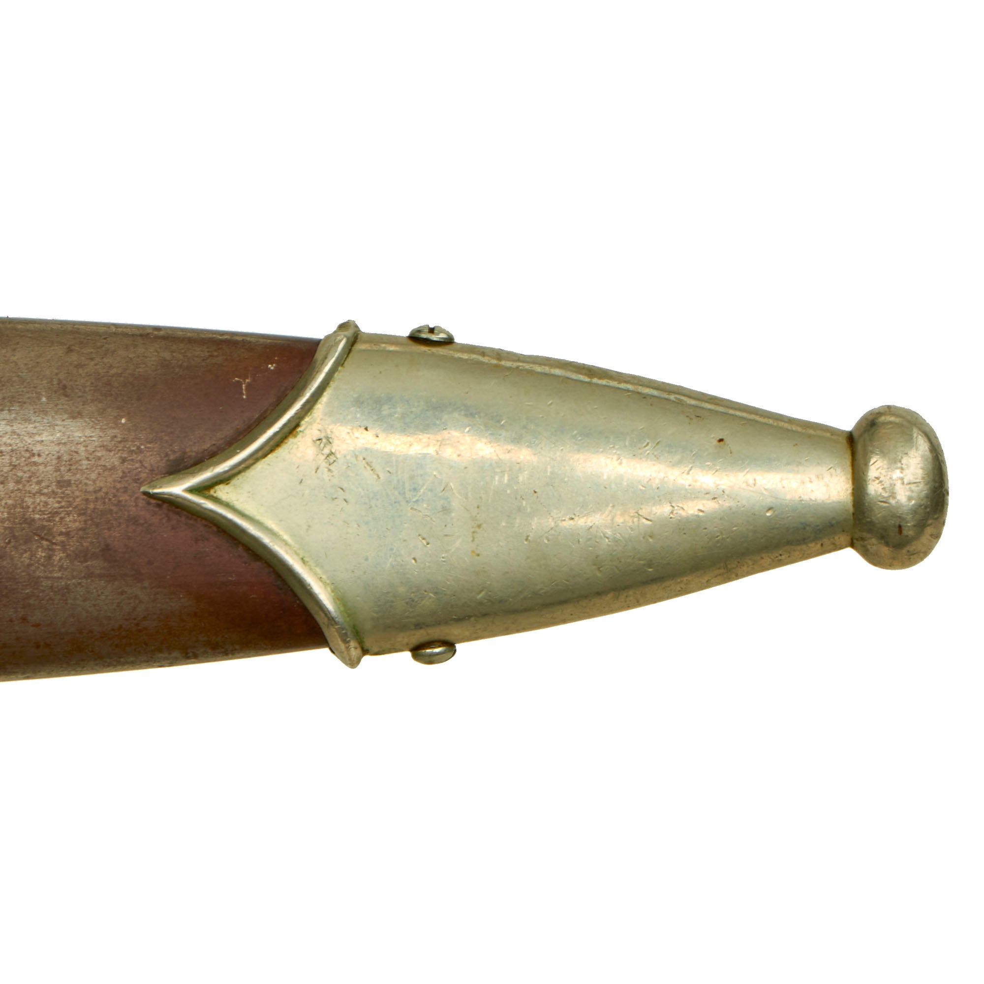 The scabbard shell is straight throughout and is the early-war style, which were produced with a brown "anodized" finish on the steel, which was then lacquered. This example has lost almost all of the lacquer finish, with traces left near the fittings. However it still retains lots of the original anodized finish, and this is definitely one of the better examples we have seen, with no dents on the body we can see. The upper and lower fittings are solid nickel silver, with a great look and some dents and scratches showing typical wear. The chape is lightly dented at the end, though not split, as the nickel alloy is somewhat soft, making this a common thing to see. The throat nicely matches the crossguards, and all fittings have their original dome headed screws.