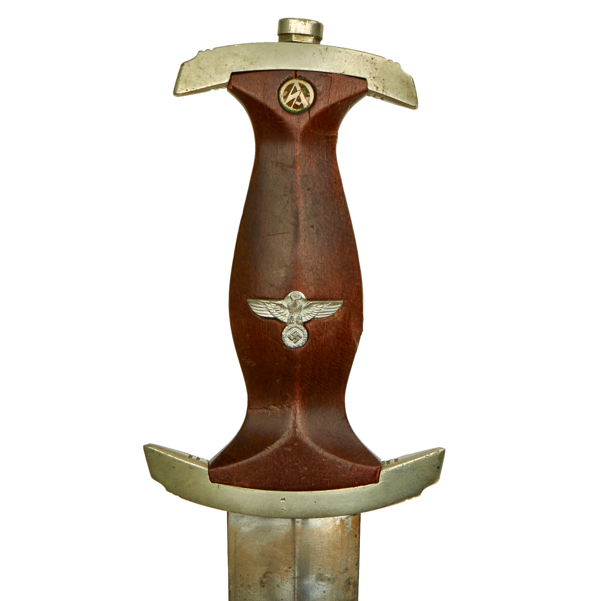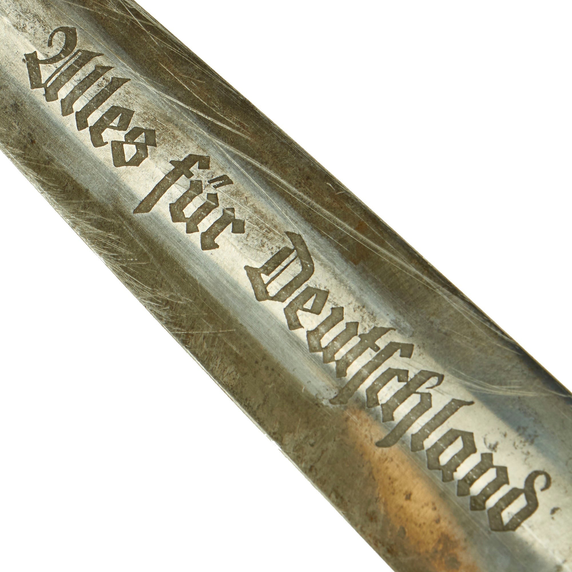 The blade was etched with the SA motto, Alles für Deutschland. Examples produced prior to 1935 were stamped with the German sector of the SA group on reverse lower crossguard. Later examples underwent standardization through the RZM ministry. These pieces were produced of cheaper plated zinc-base fittings and scabbards were simply painted brown.