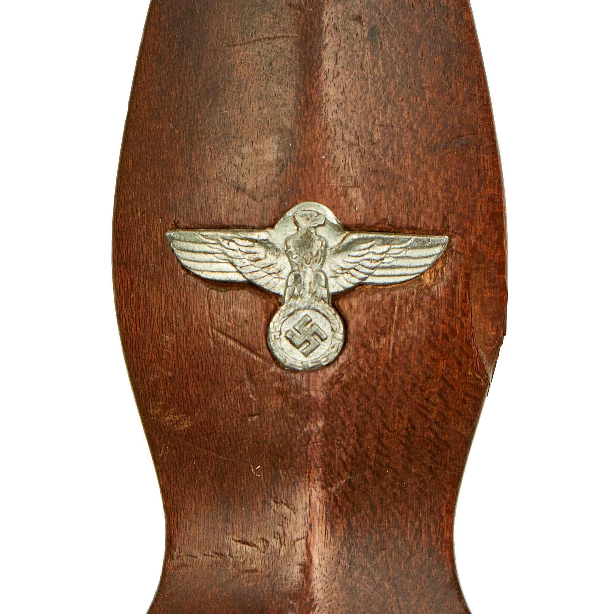The SA symbol button is still present, but the damage to the pommel has moved it slightly an enlarged the inlet. It still has most of the plating, now oxidized with some verdigris, and the translucent enamel is cracked, probably retained at 50%. The grip eagle is a fine example being the style with beak that points straight. It looks to be made from zinc, and does show some wear. However most of the details are still there, including the beak, breast feathering, wing feathering, talons, wreath and mobile swas (hook cross).