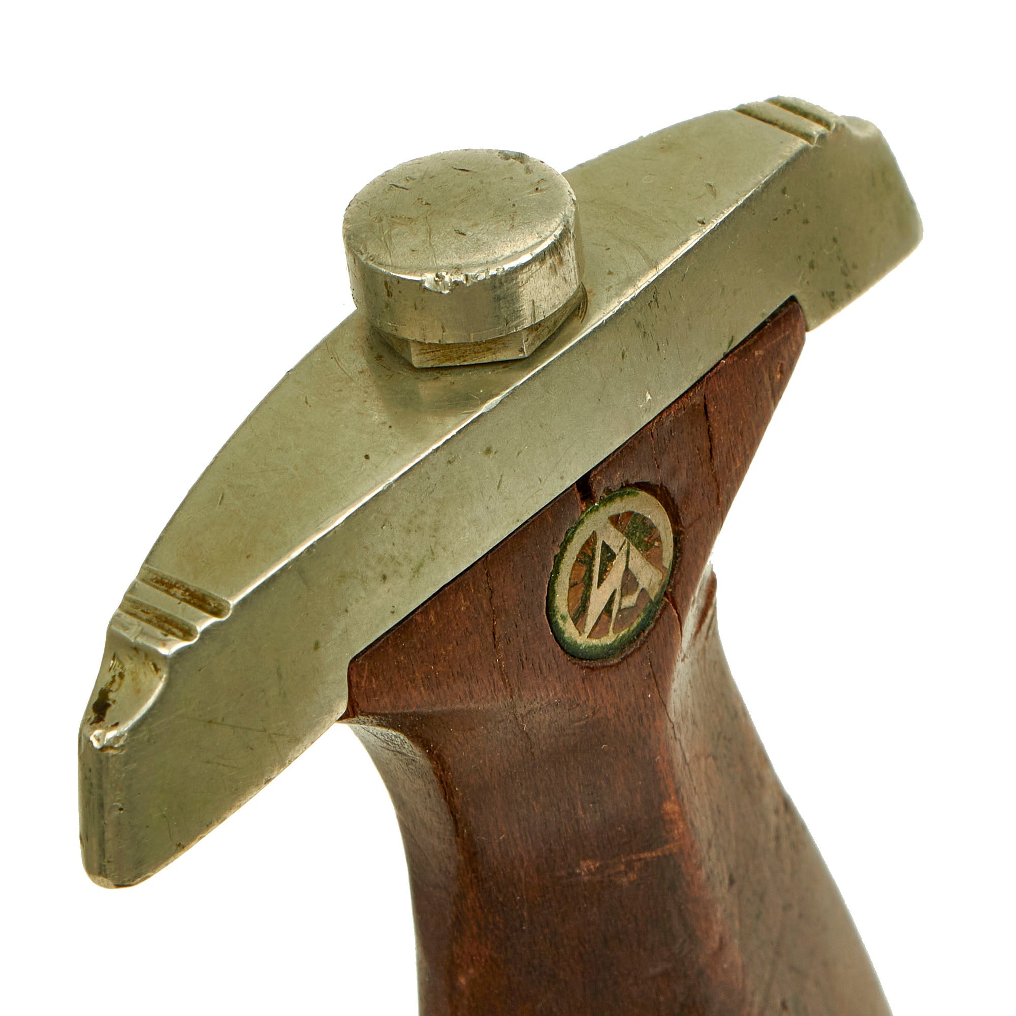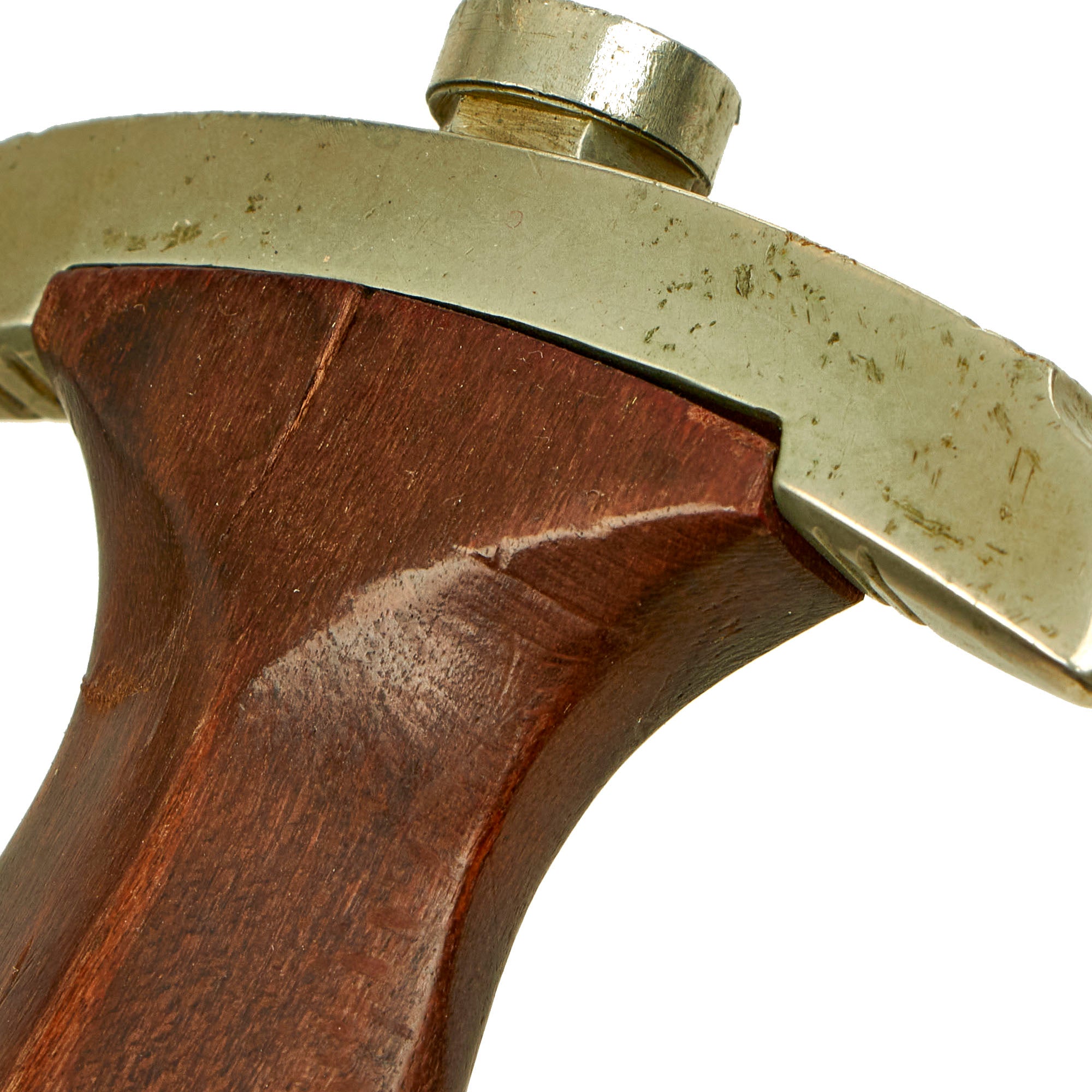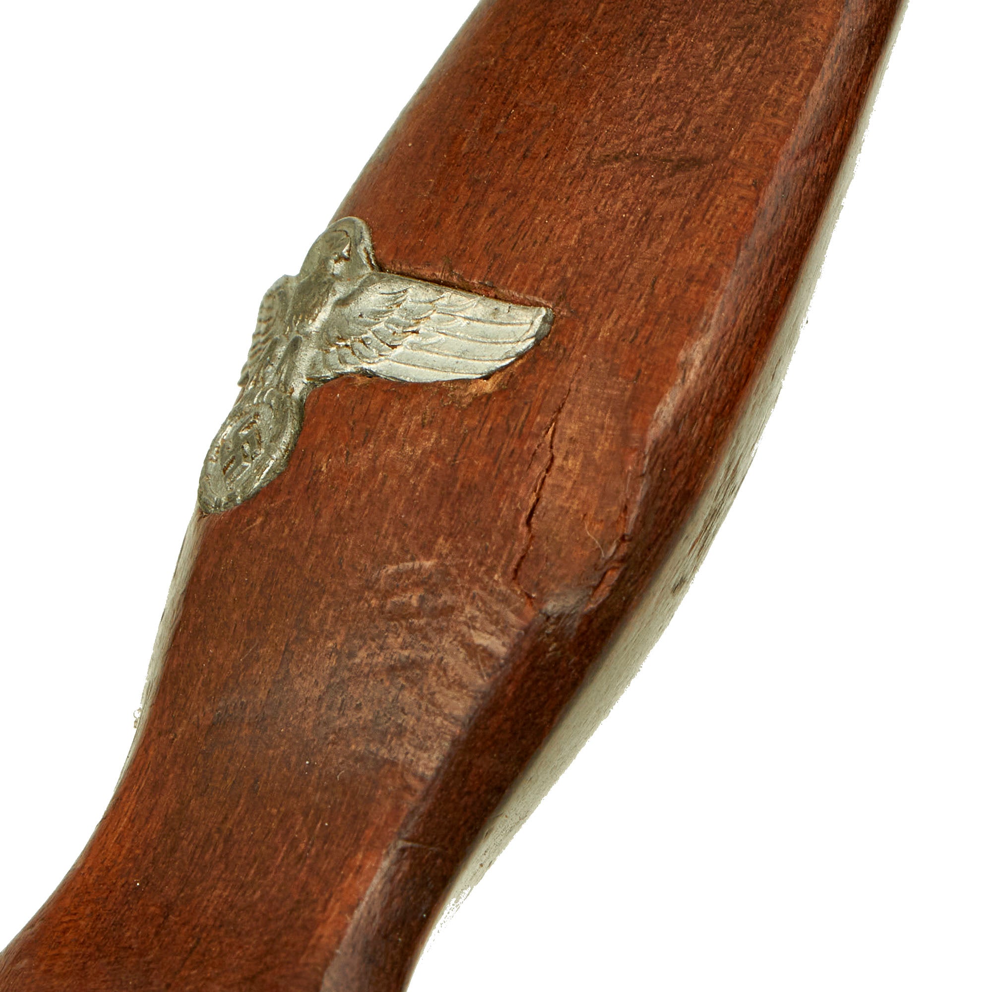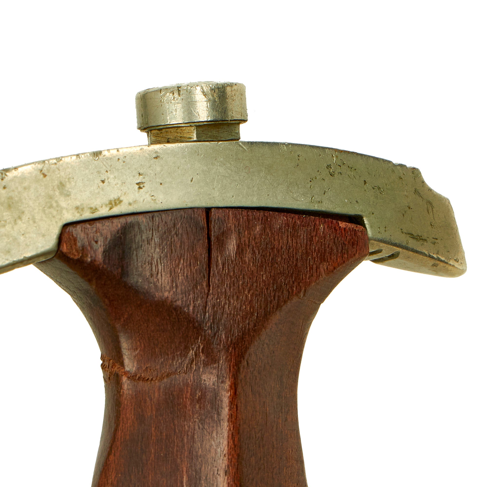 The grip is a fine product having a lovely dark reddish brown color, with medium center ridge construction, showing the expected wear from service. It is cracked and slightly deformed on one side by the pommel guard, due to the blow it must have taken, which pushed the guard into the wood. Otherwise, it is in good condition and fits the crossguards nicely, though there is a hairline crack between the pommel and the inlaid emblem. The pommel nut does show some turning on the outside, and the grip is still tightly secured, with no wiggle.