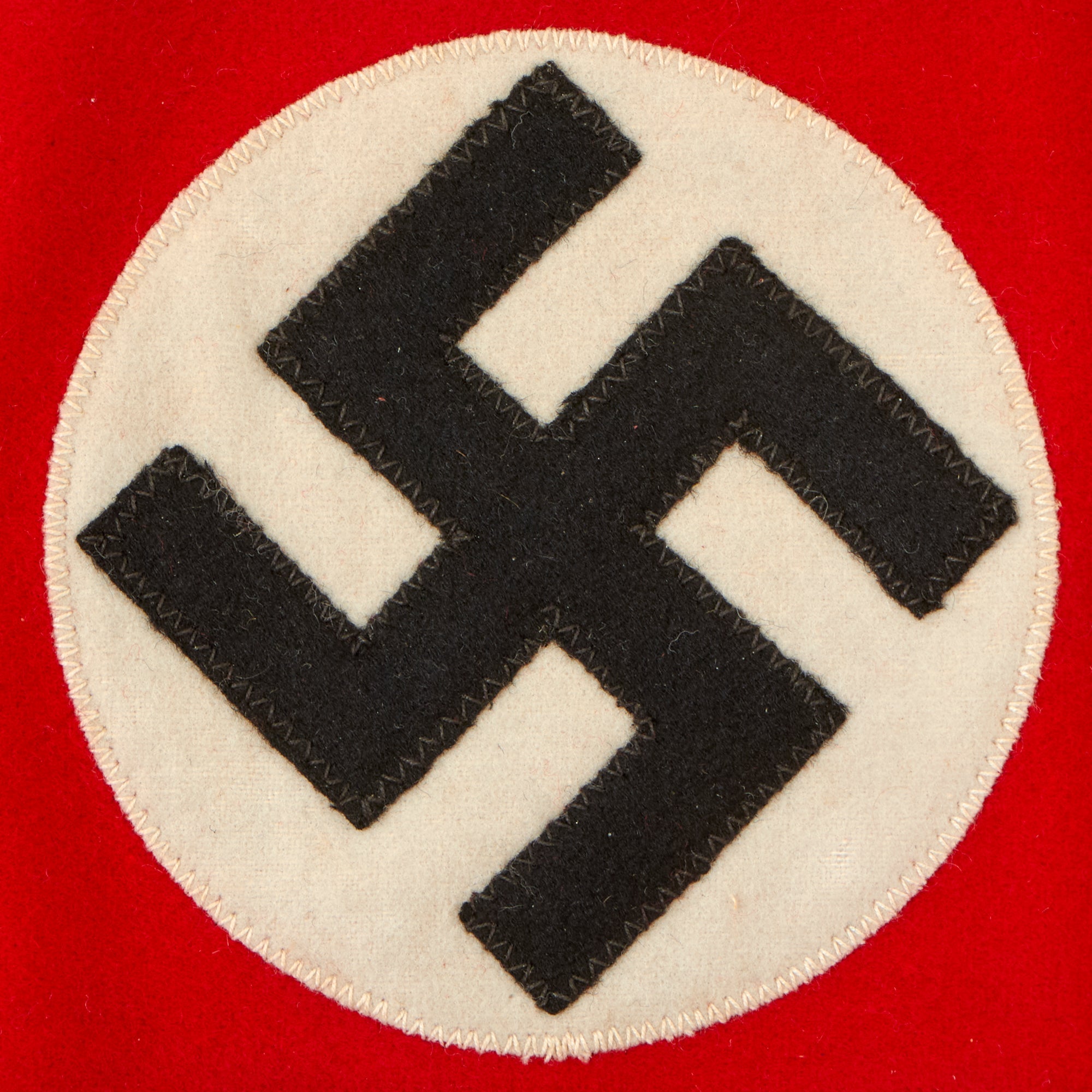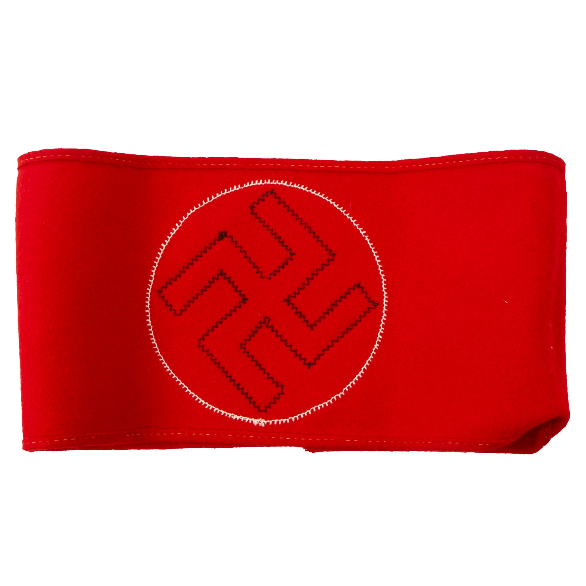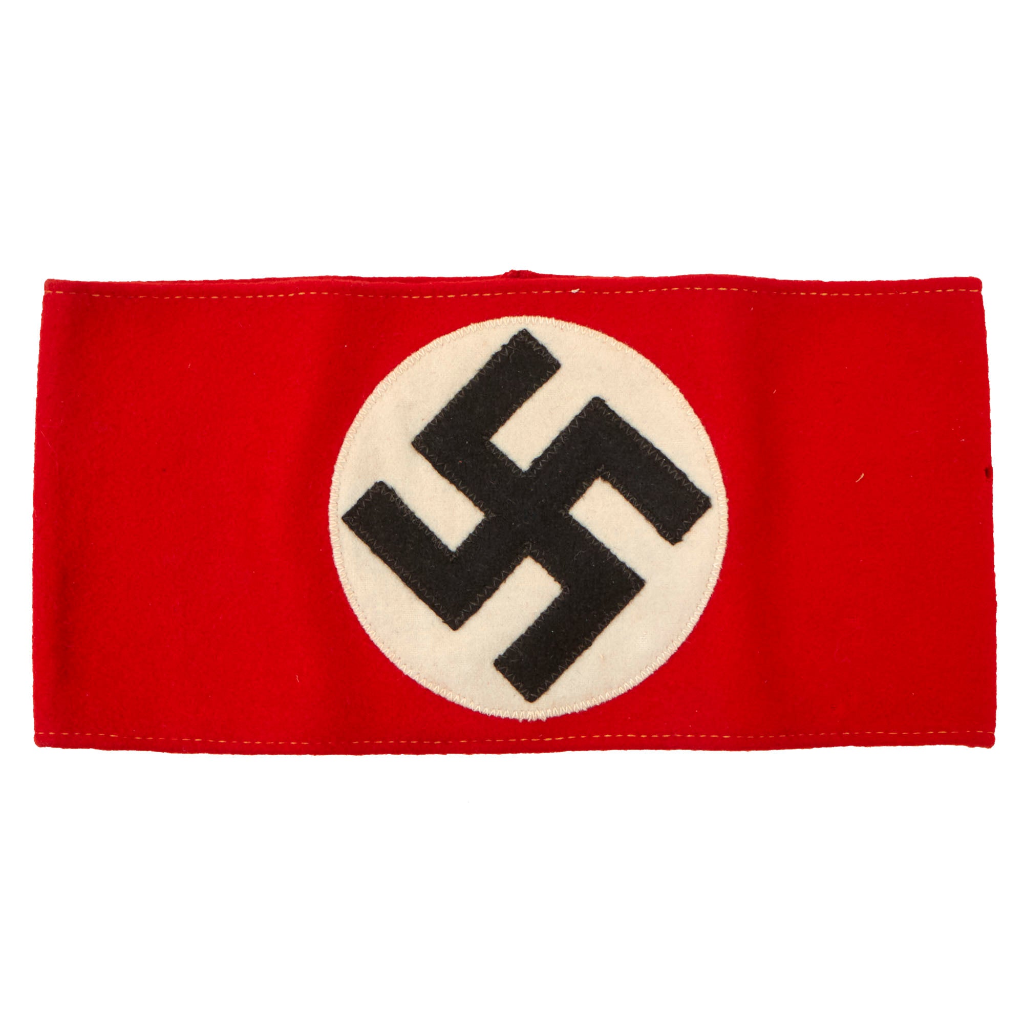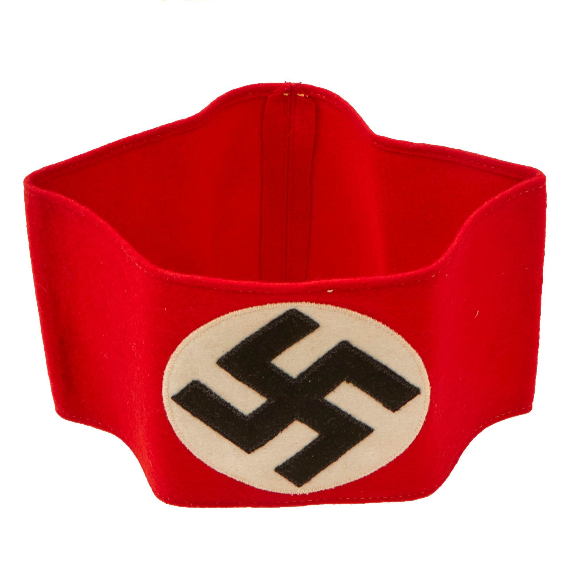 Original Item: Only One Available. This is a very good condition early war high quality SA wool Ärmelbinde (Armband) with multi-piece construction. It looks to be made entirely from wool, and features a white circle with a single piece cutout black Swas (Hook Cross) patch sewn to it, which is stitched onto the red backing. The edges of the armband are finely stitched indicating a very high quality production. Measures approximately 17 1/2" x 4 1/8", and is stitched together in the back. This longer length of armband was often used on the overcoats worn by the SA.