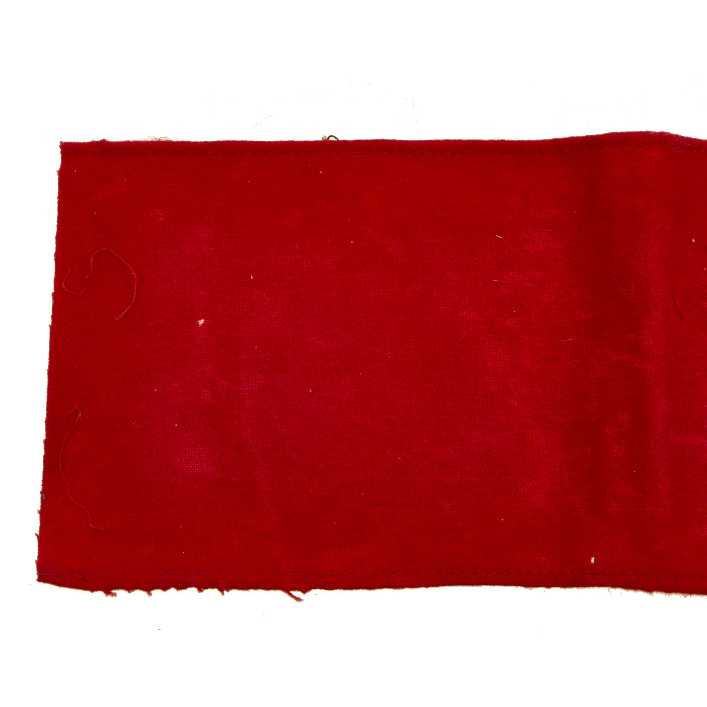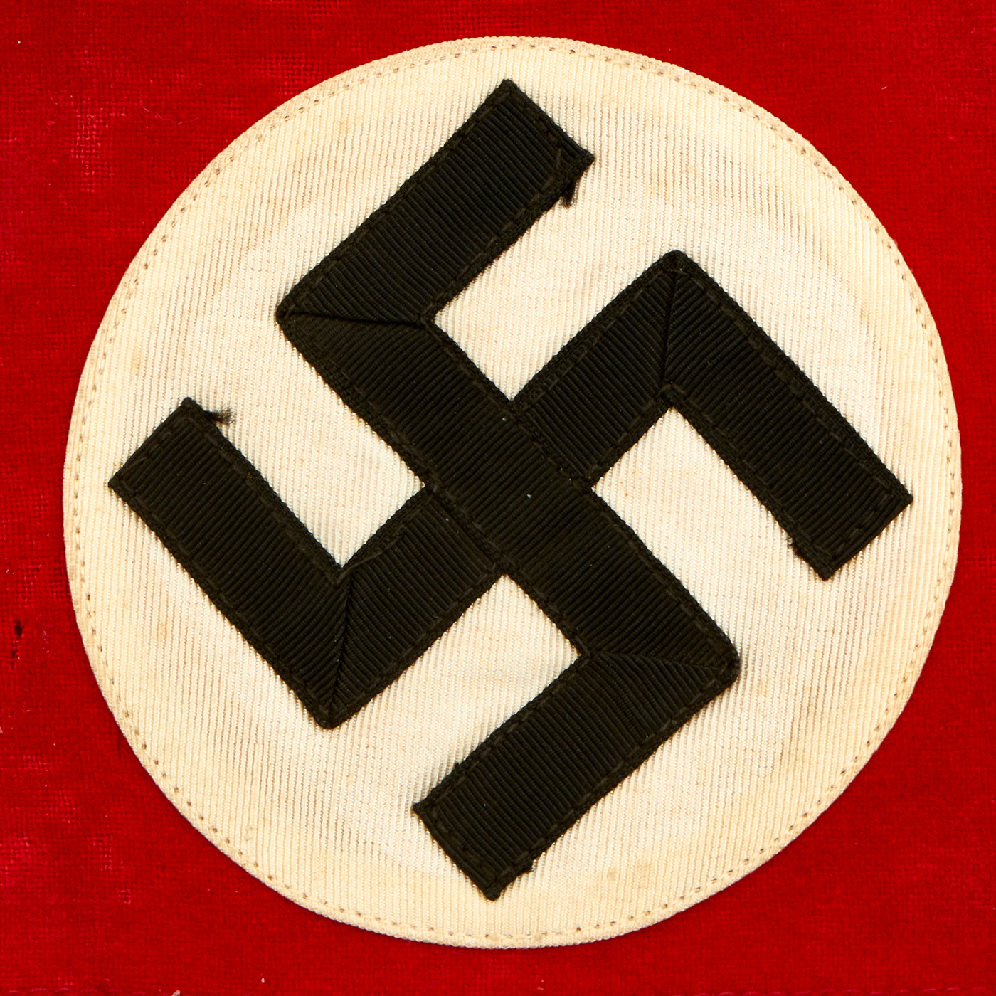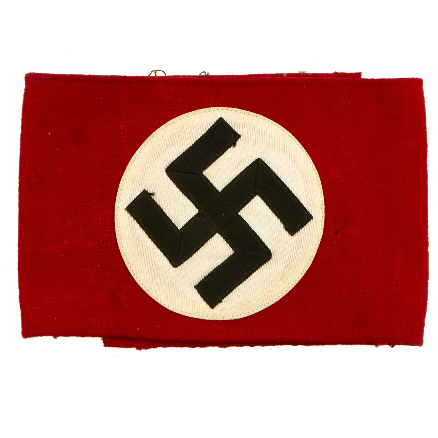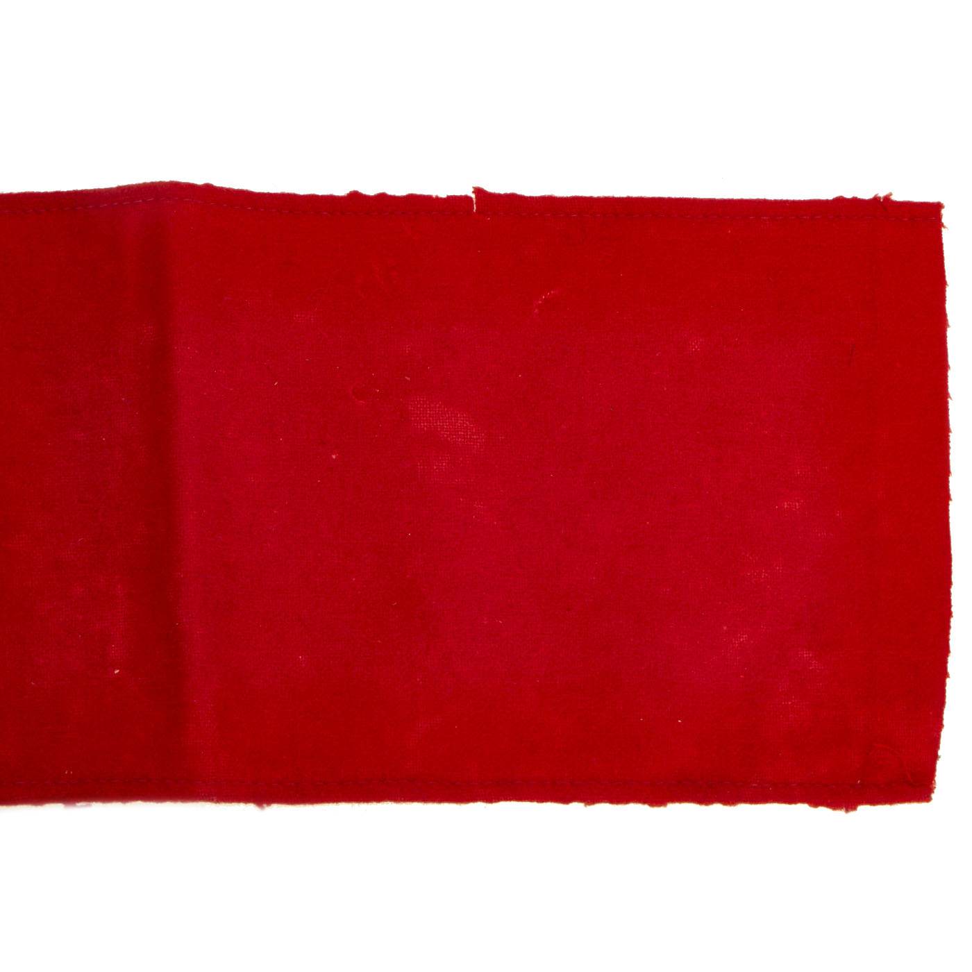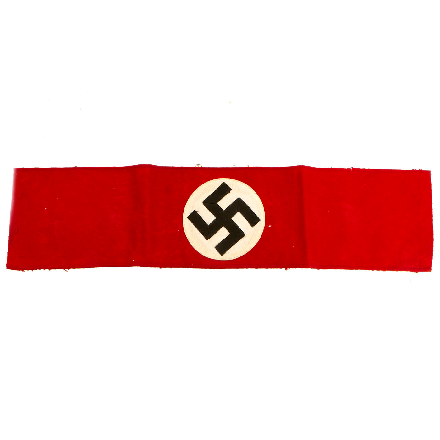 Original Item: Only One Available. This is an excellent worn condition, early war high quality SA wool armband with multi-piece construction. Featuring a moire material white circle with a black Swas (swas) patch, which is stitched onto the wool backing. Edges of arm band are finely stitched indicating a very high quality production. Measures 19" x 4.25", and has never sewn together at the end but appears to have been cut, perhaps when being removed from a uniform. The top also has dark bronze colored thread remnants, another indication that this was worn.