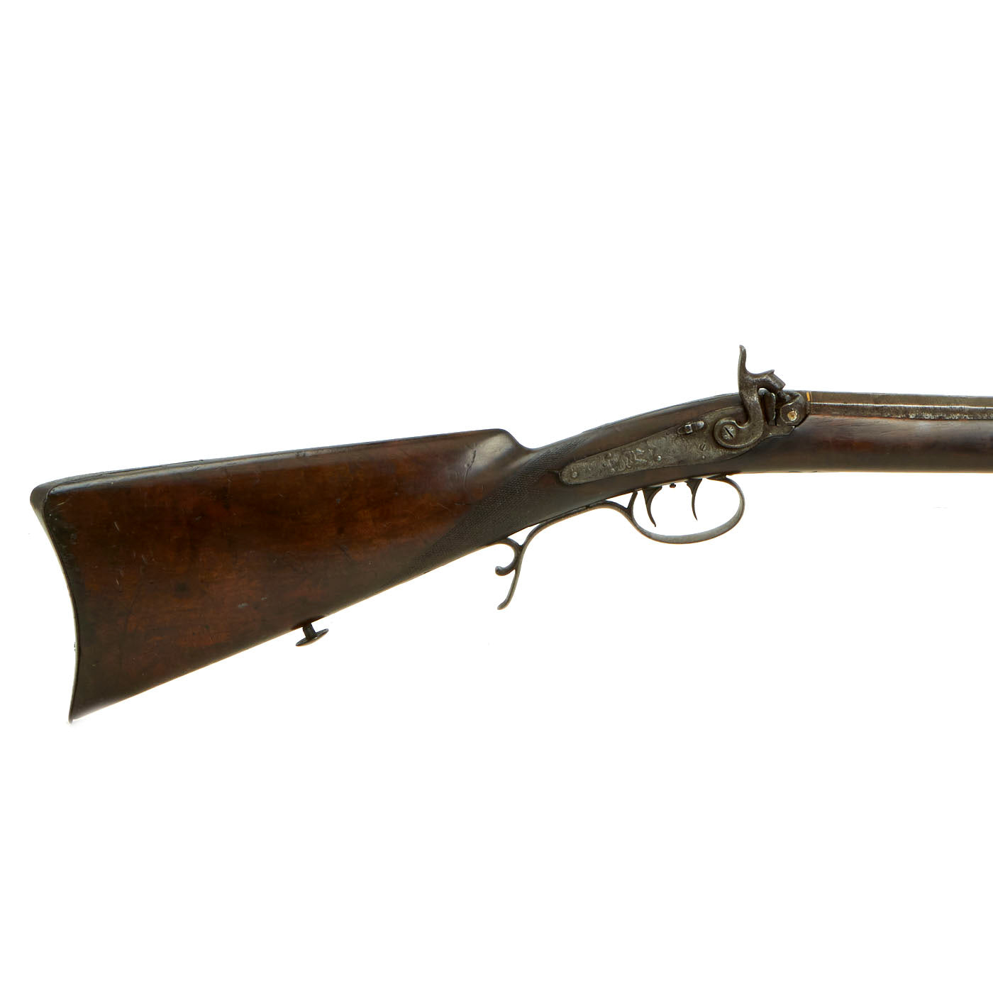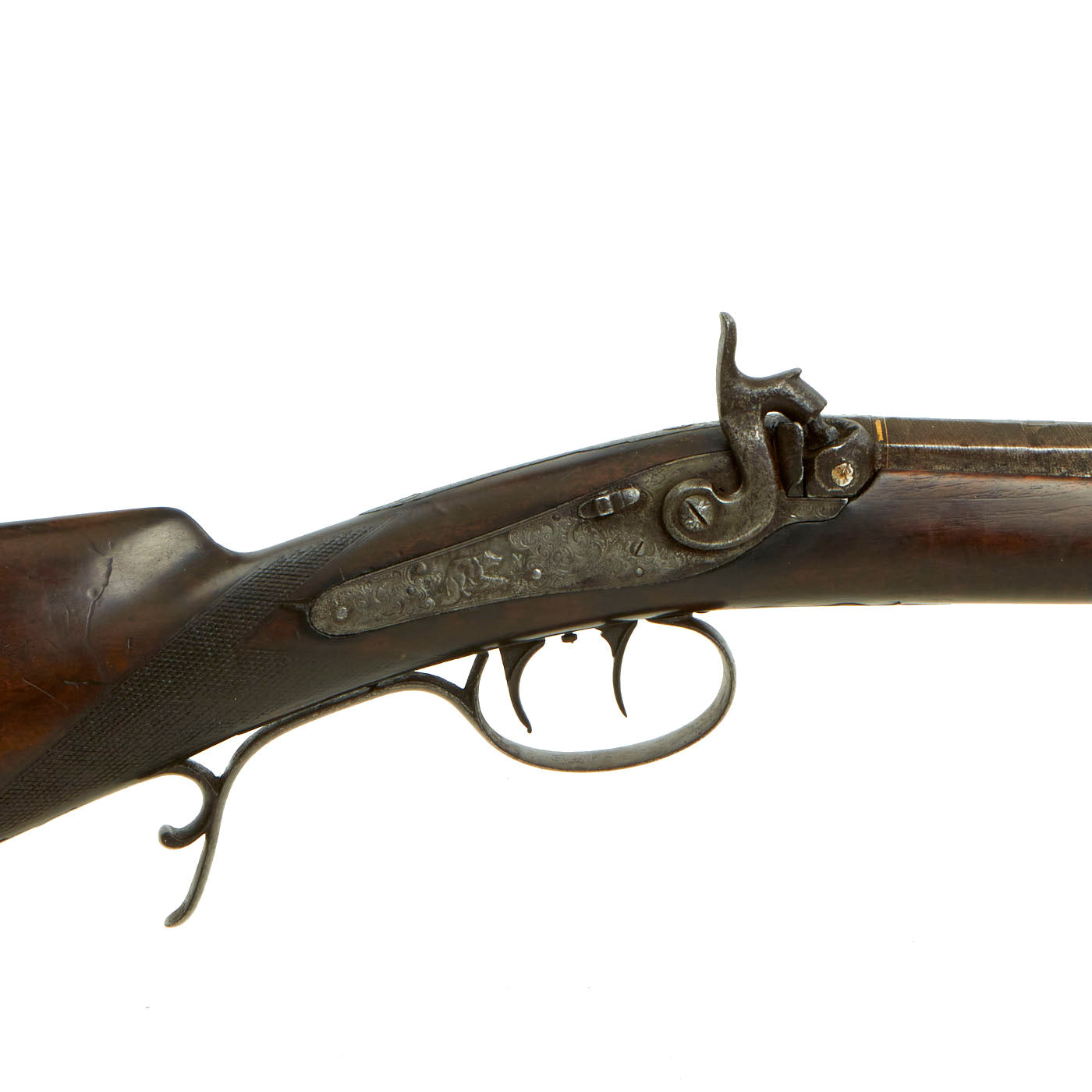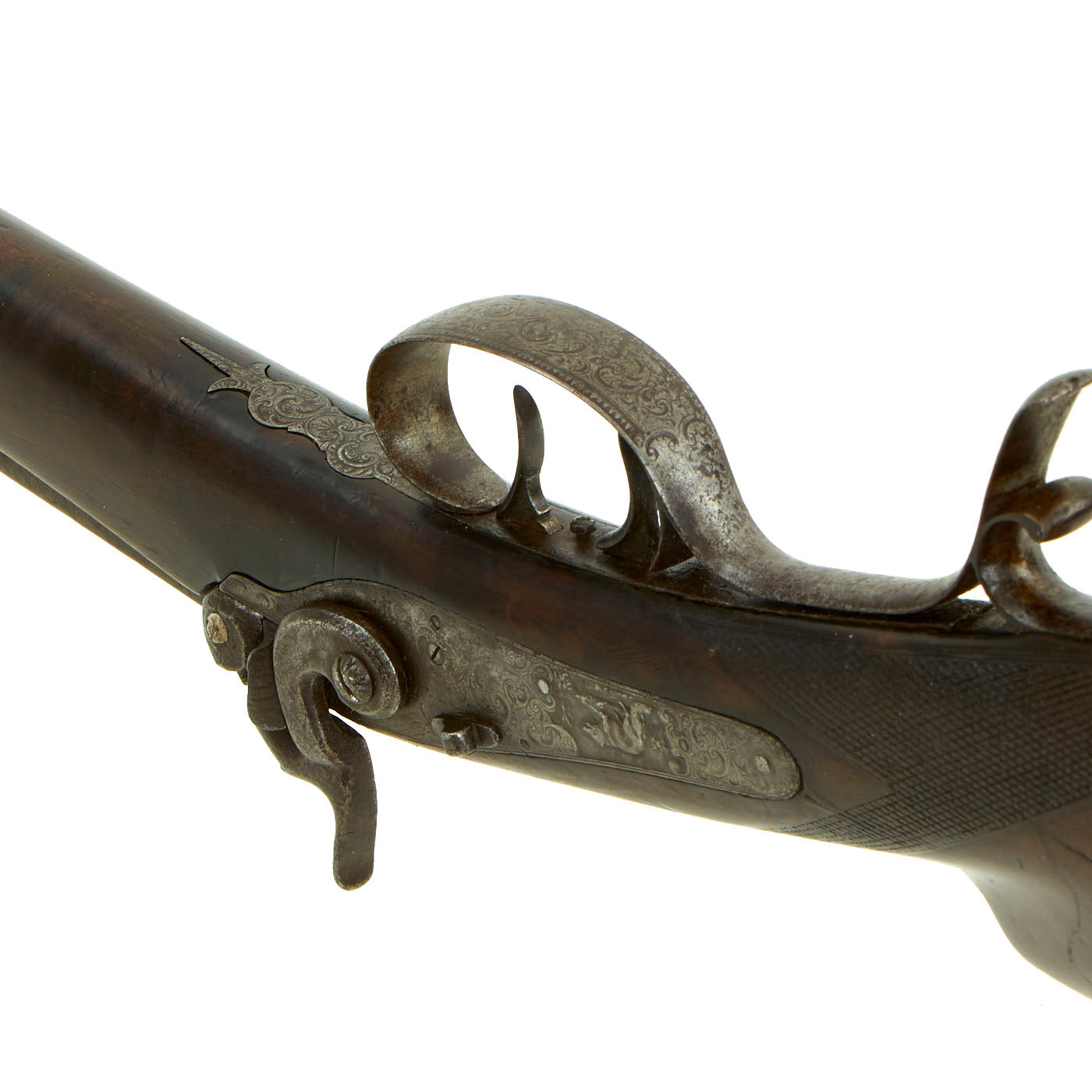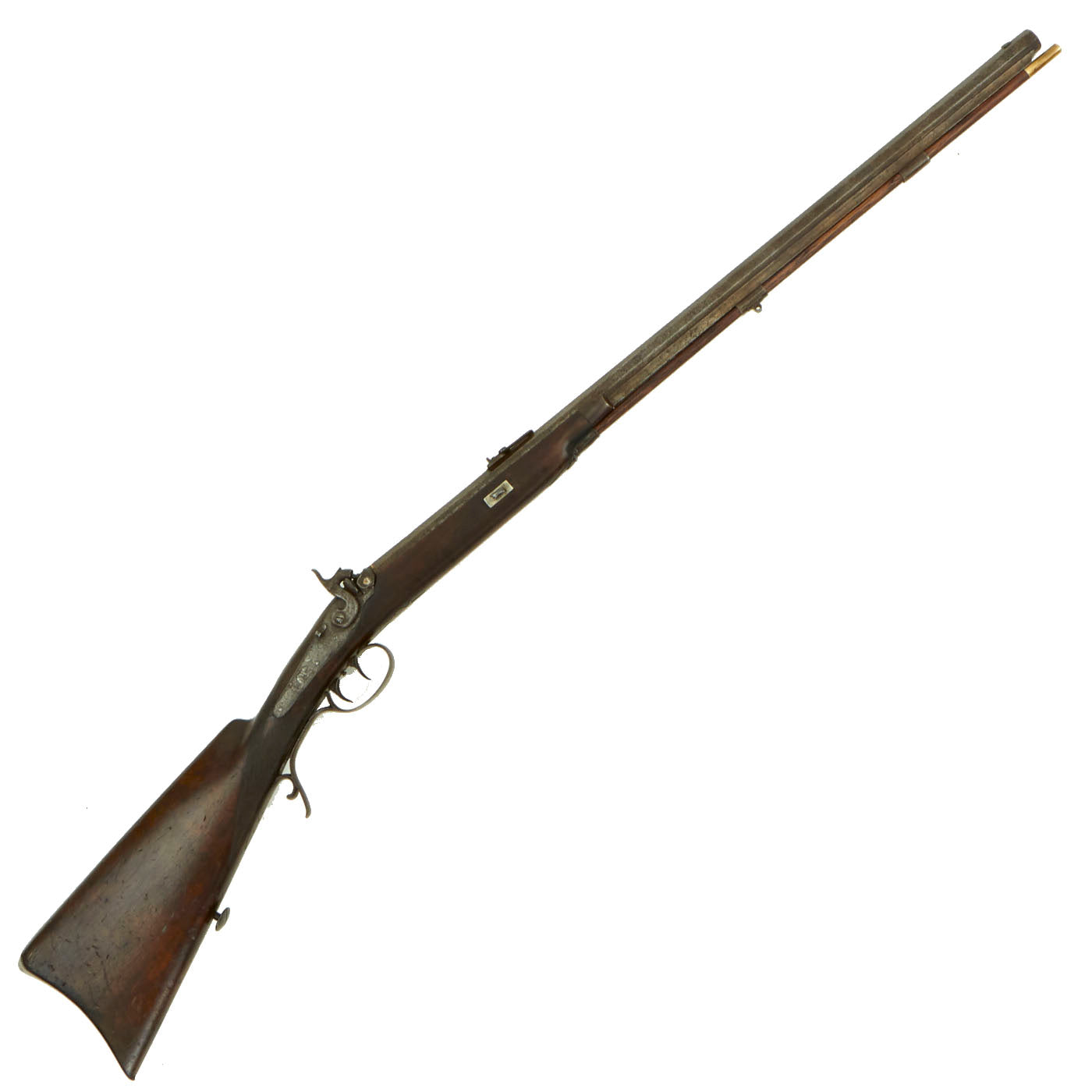 Original Item: Only One Available. This is a very nice little hunting rifle in approximately .43 caliber, made in the typical German 19th century design. The butt plate, barrel tang and lock plate fully decorated with sculpting and engravings. The lock appears to depict a wolf at bay, and the barrel tang a Stag at rest. It features all iron mounts, which are all ornately engraved. It measures 44 1/2 inches in overall length, with a very nice 28 inch long octagonal barrel, which is maker marked on the top: