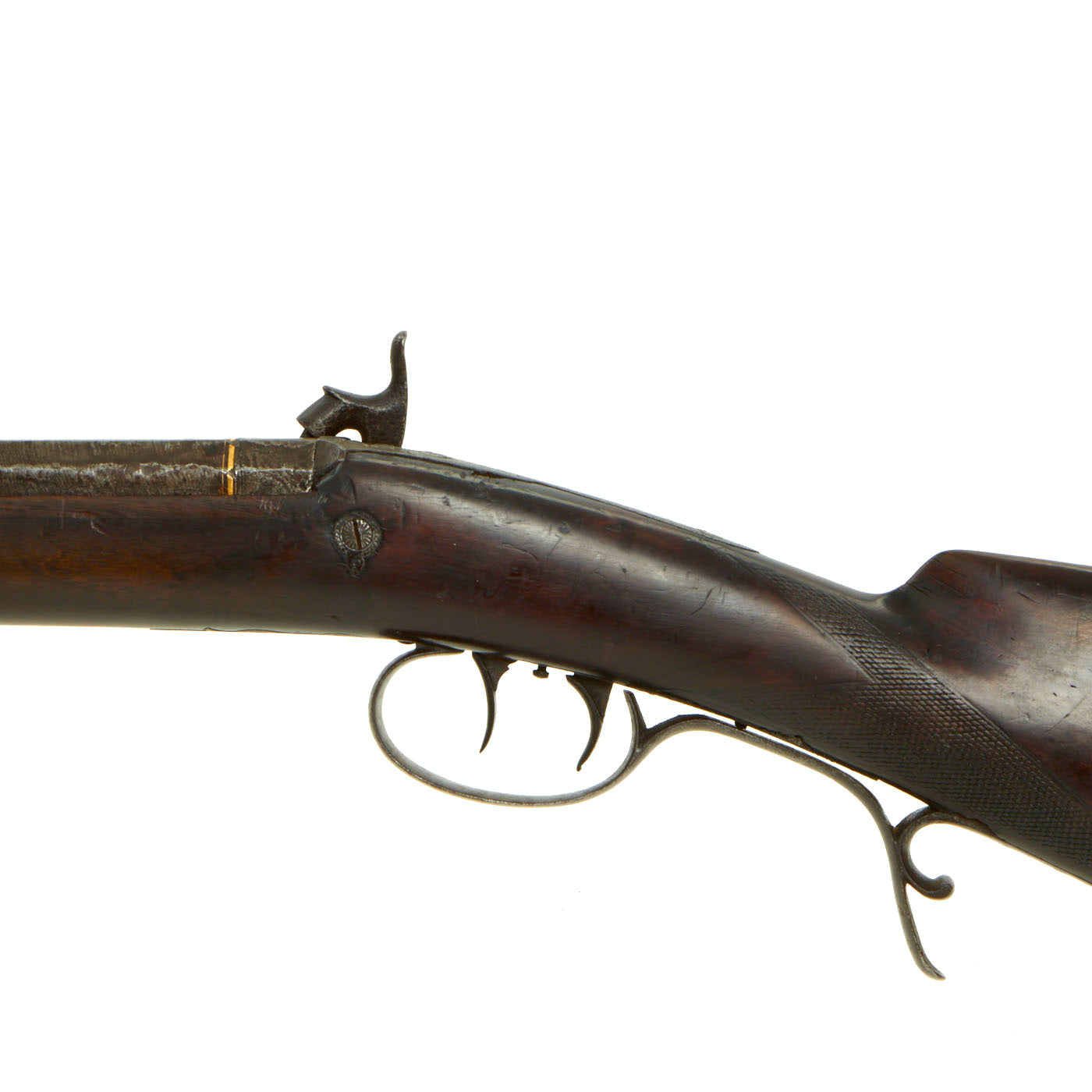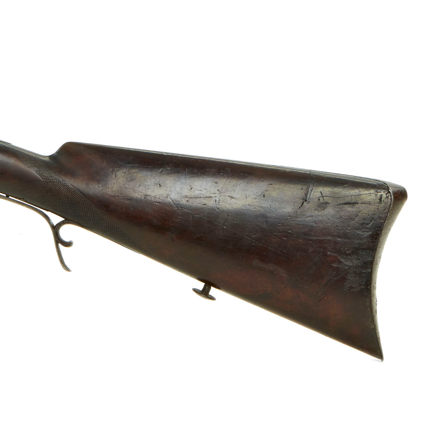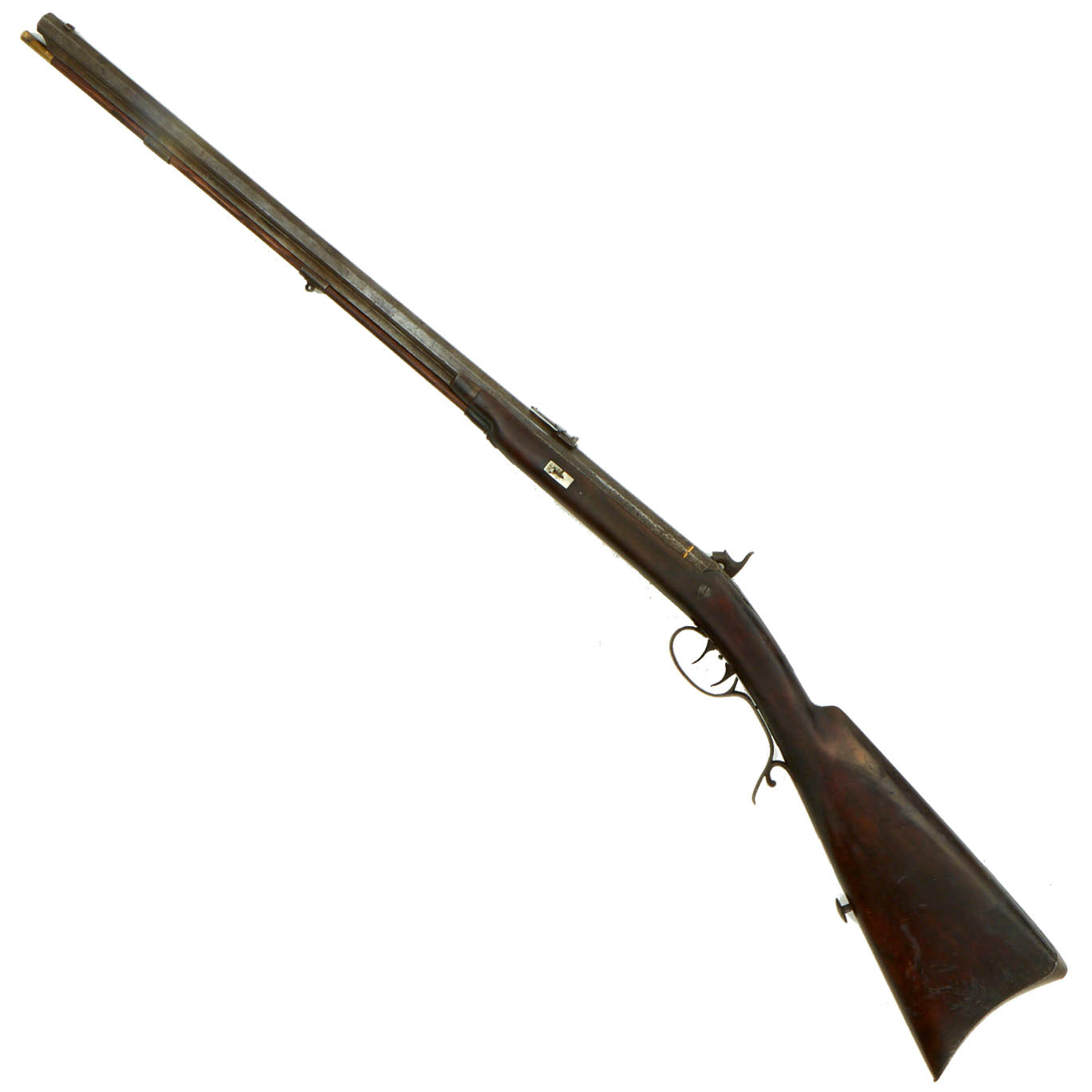 Original Item: Only One Available. This is a very nice little hunting rifle in approximately .43 caliber, made in the typical German 19th century design. The butt plate, barrel tang and lock plate fully decorated with sculpting and engravings. The lock appears to depict a wolf at bay, and the barrel tang a Stag at rest. It features all iron mounts, which are all ornately engraved. It measures 44 1/2 inches in overall length, with a very nice 28 inch long octagonal barrel, which is maker marked on the top: