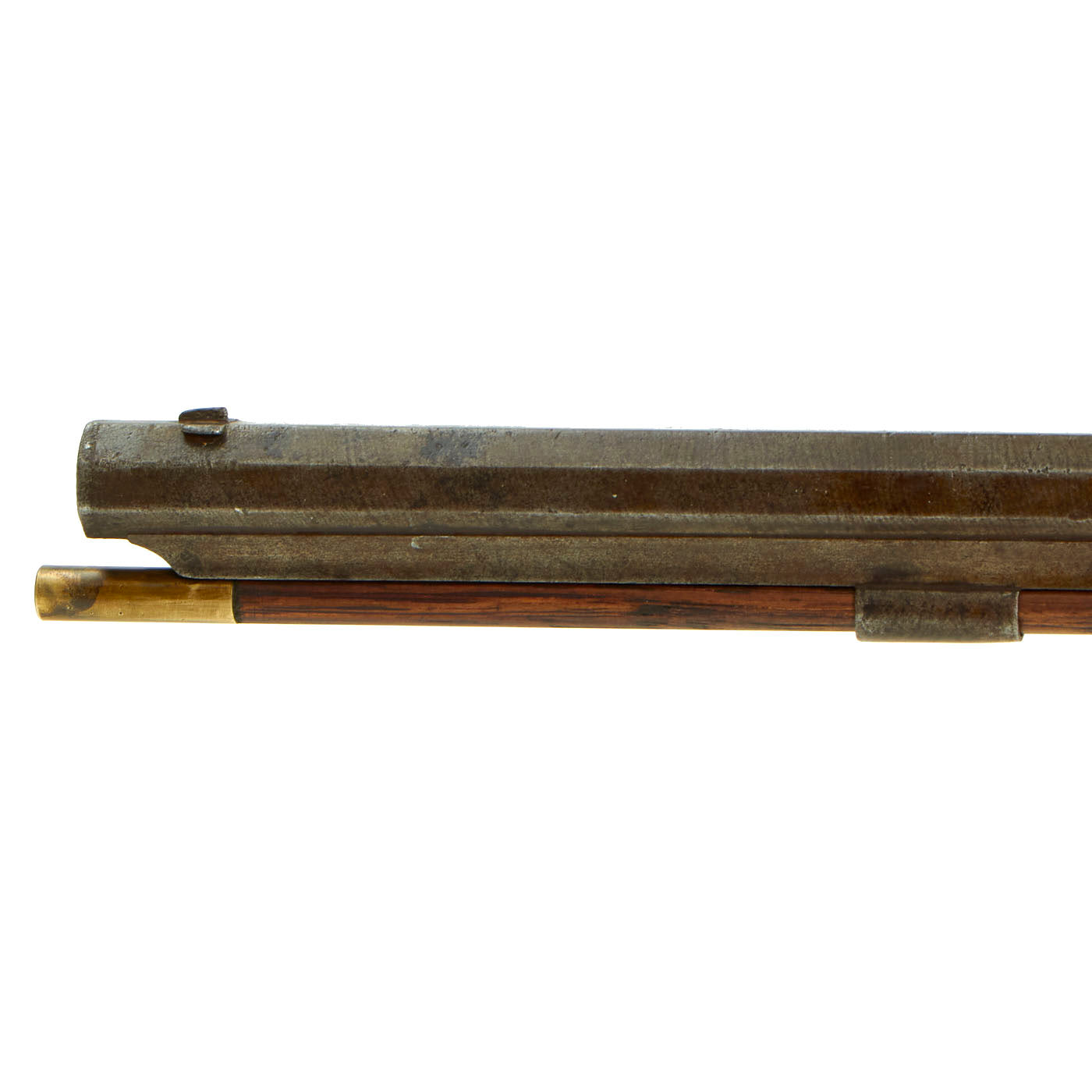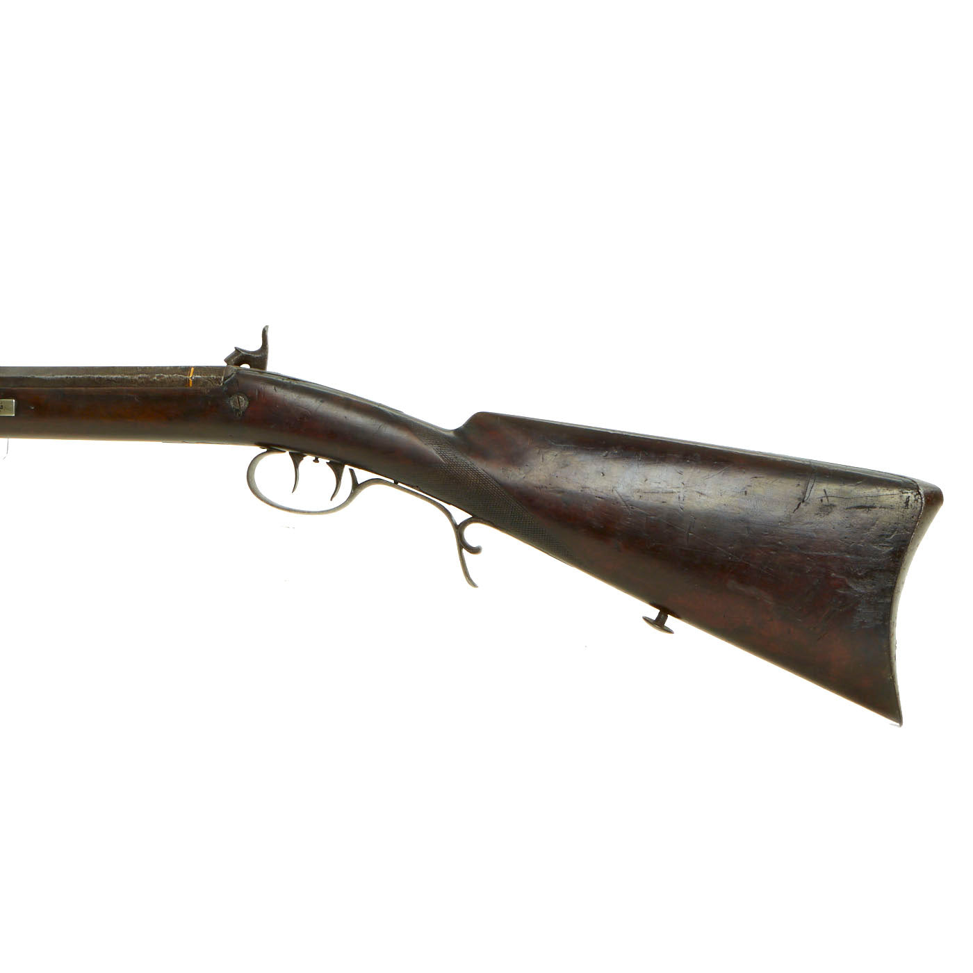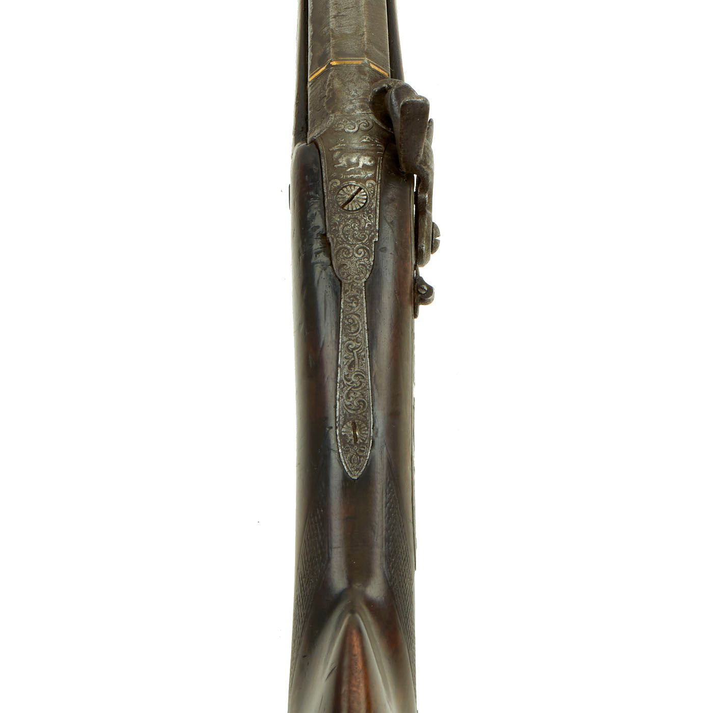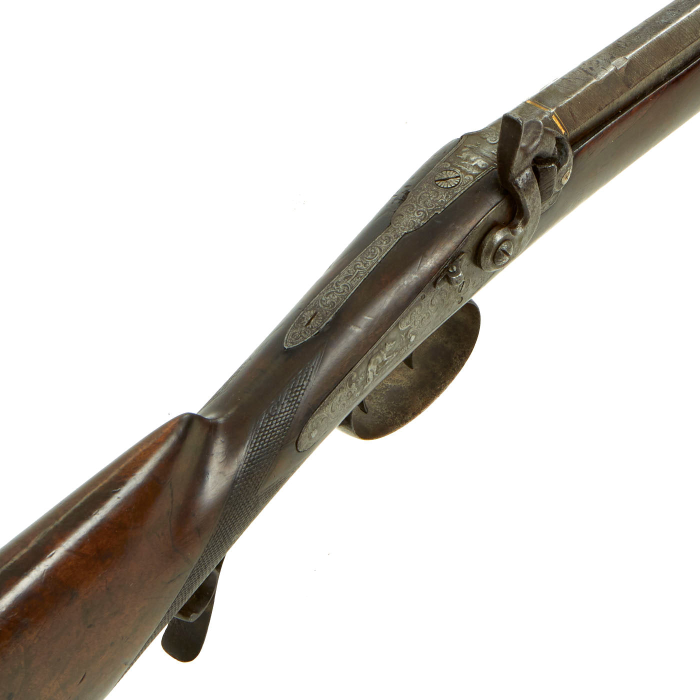 Original Item: Only One Available. This is a very nice little hunting rifle in approximately .43 caliber, made in the typical German 19th century design. The butt plate, barrel tang and lock plate fully decorated with sculpting and engravings. The lock appears to depict a wolf at bay, and the barrel tang a Stag at rest. It features all iron mounts, which are all ornately engraved. It measures 44 1/2 inches in overall length, with a very nice 28 inch long octagonal barrel, which is maker marked on the top: