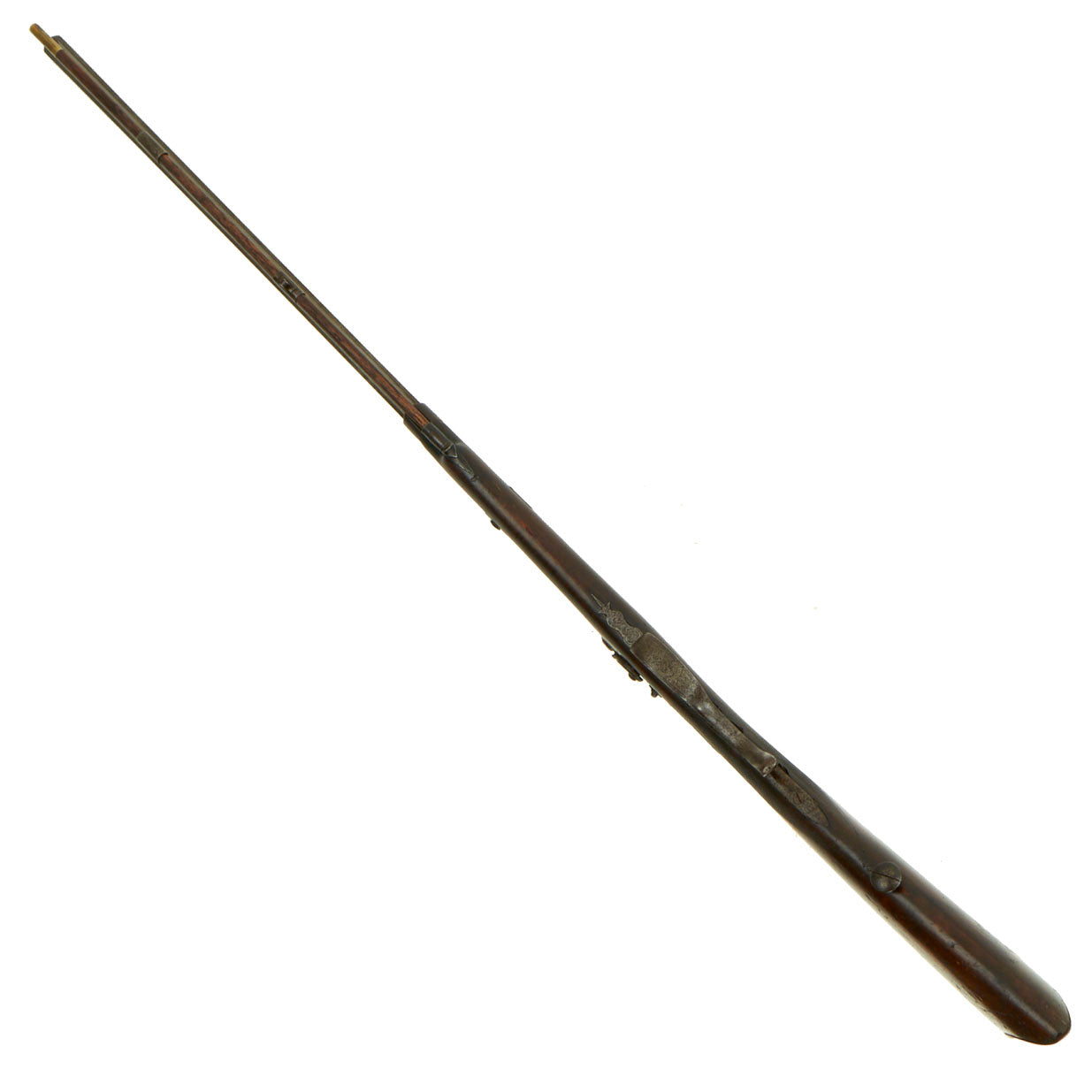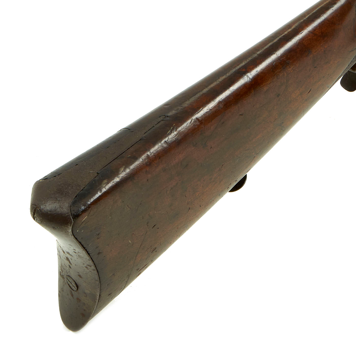 The bore is in good condition, with with clear rifling and a bright finish on the lands, while the grooves show fouling and oxidation. There is a simple wooden cleaning rod with a threaded brass tip installed, which is mainly for display. It has a very nice rear ladder sight and standard front blade sight, both of which look to be original.