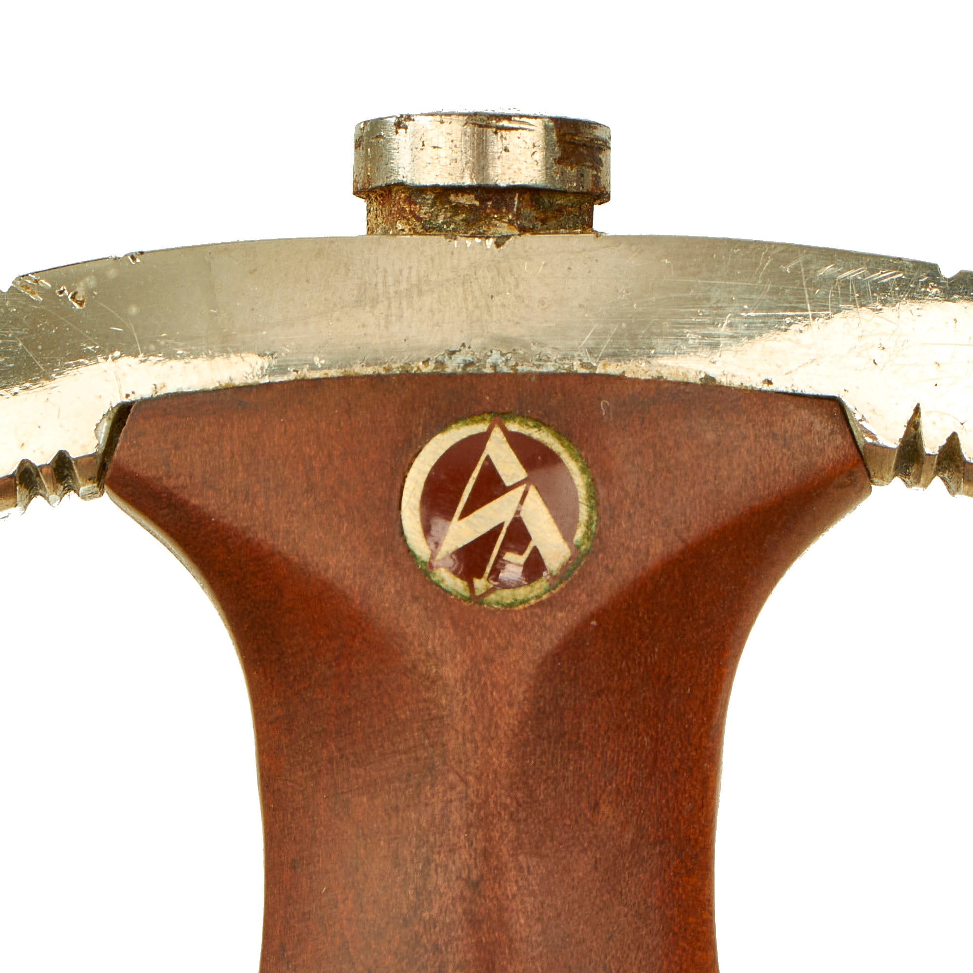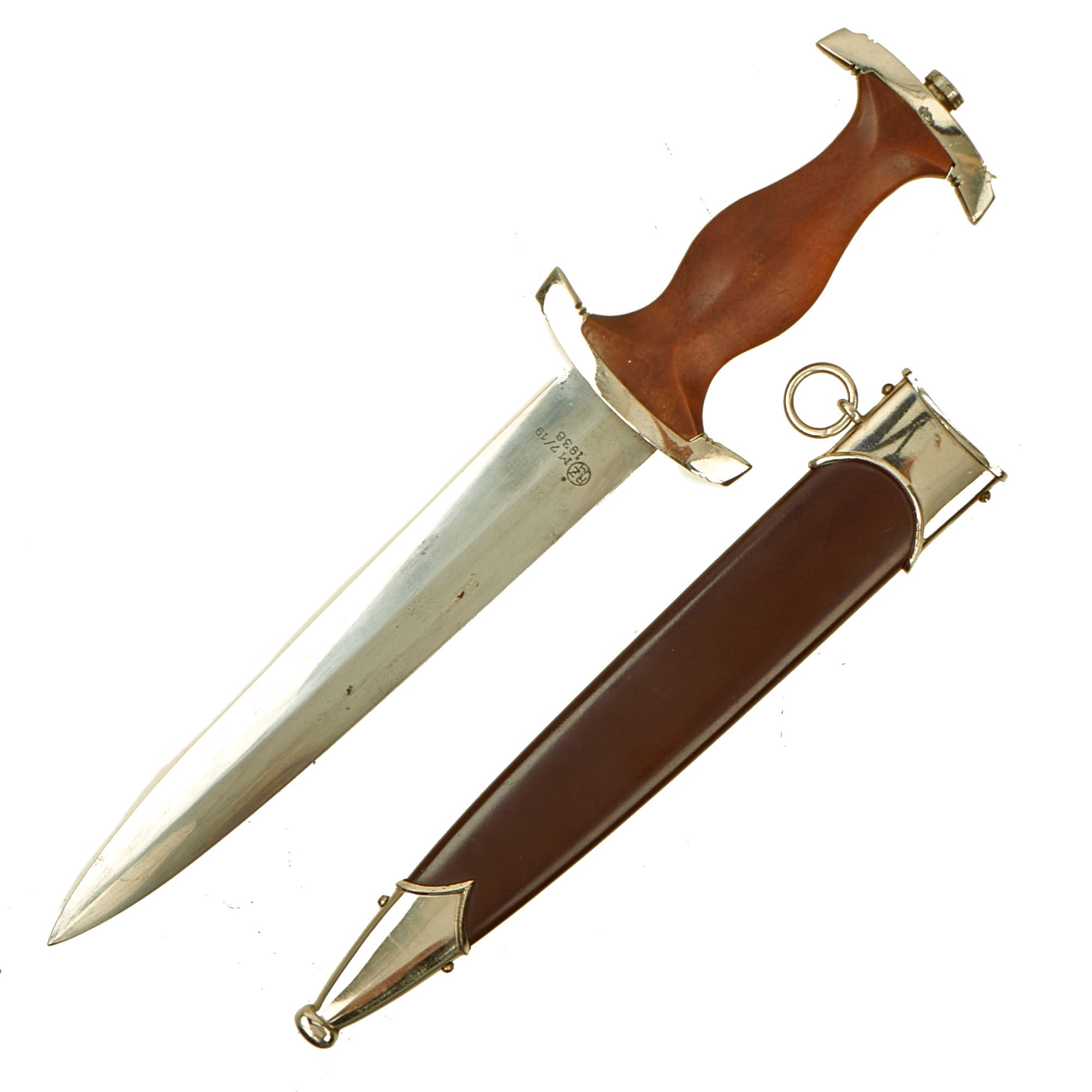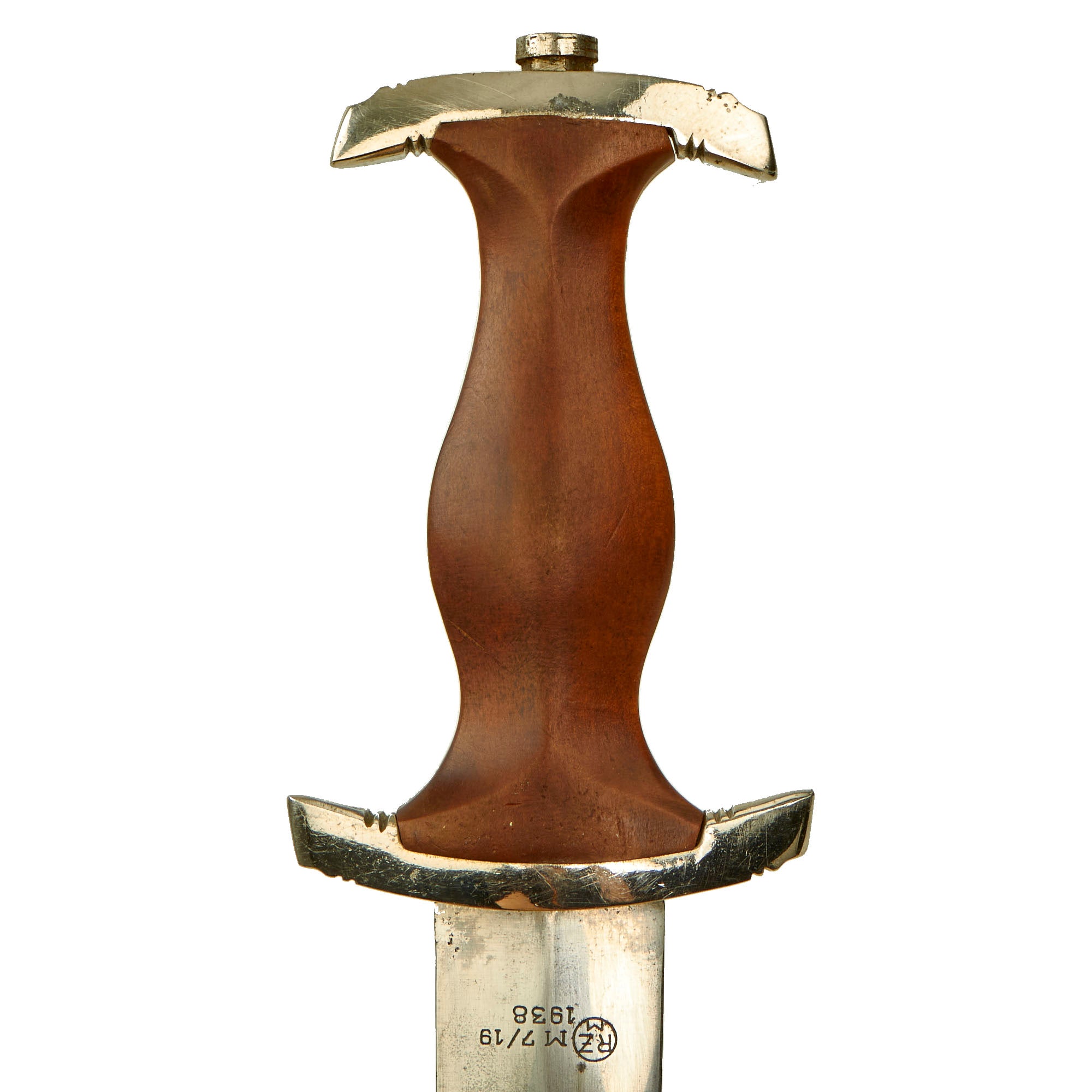 Original Item: Only One Available. This excellent condition Pre-War period produced SA Dagger has nickel-plated fittings throughout. The cross guards and tang nut are nickel plated zinc alloy, and have almost all of the plating intact, with just a bit of lifting on the rear of the pommel guard. There is also some very minor oxidation where the grip wood meets the guards, which is typical. There is not any major chipping or dents in the fittings, just the usual effects of age.