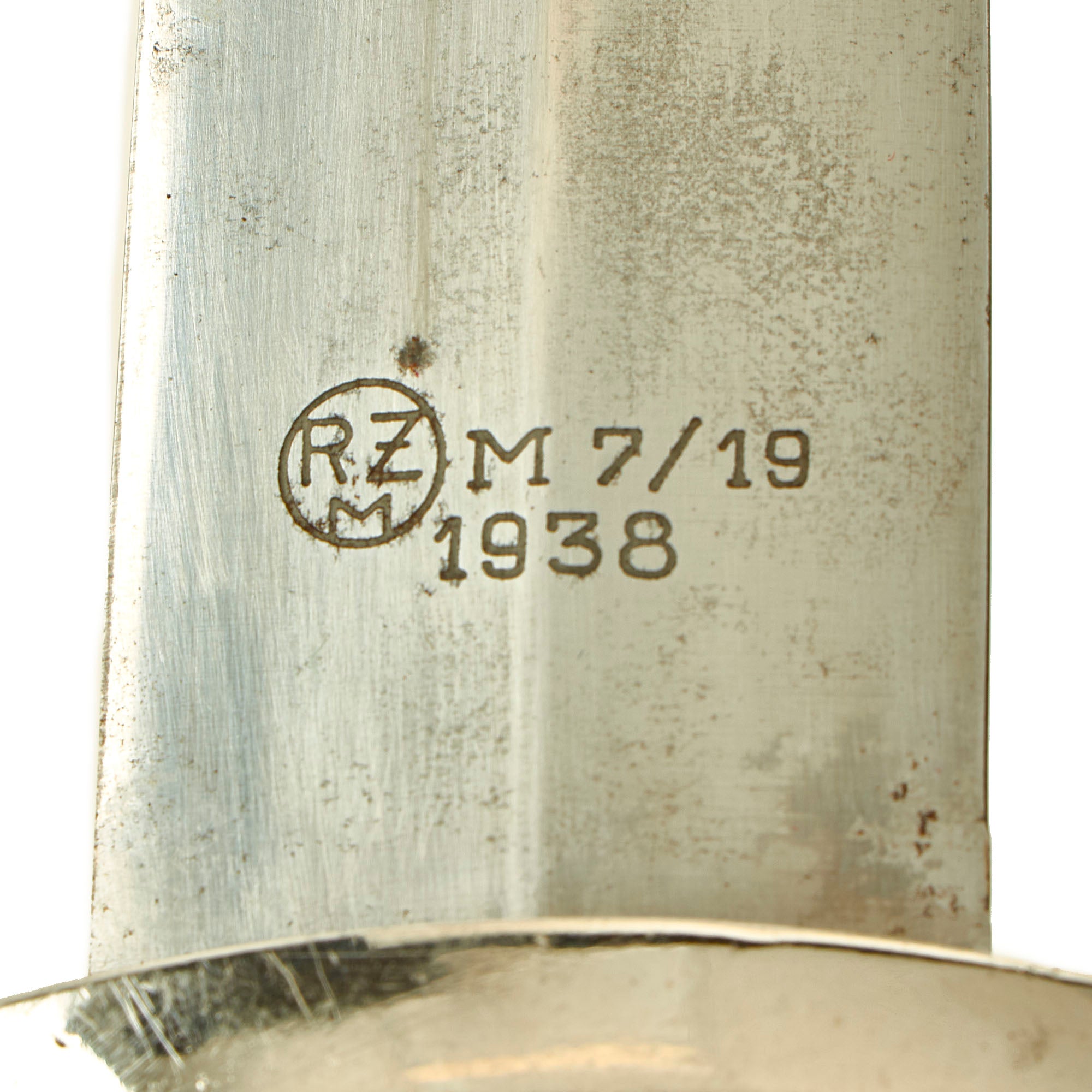 The Reichszeugmeisterei, or RZM, was was based at the Brown house in Munich and NSDAP party headquarters in Berlin. The RZM ensured that the manufacturers of military items were consistent in design, quality of materials and other characteristics of the items. It also defined standards of design, manufacturing and quality and published an authoritative color chart for textiles. The M7 in the code stands for knives/daggers, contractor 19 stands for firm Eduard Wüsthof.