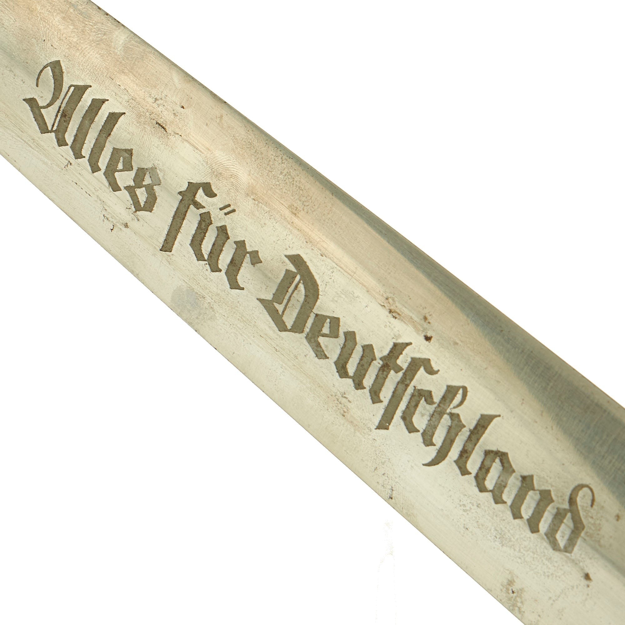 The blade was etched with the SA motto, Alles für Deutschland. Examples produced prior to 1935 were stamped with the German sector of the SA group on reverse lower crossguard. Later examples underwent standardization through the RZM ministry. These pieces were produced of cheaper plated zinc-base fittings and scabbards were simply painted brown.