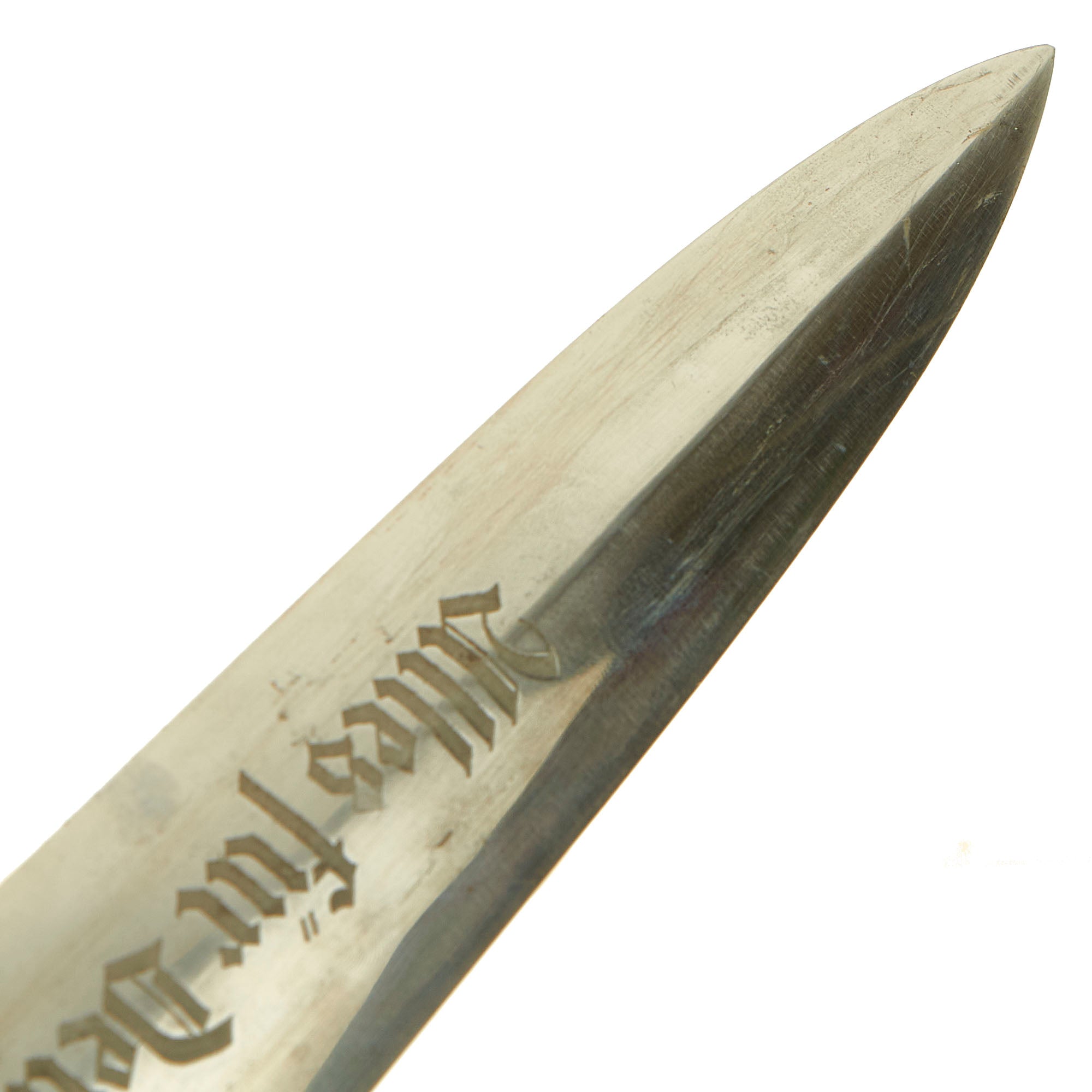 Prior to his "unmasking" as a traitor, Ernst Röhm was the leader of the SA. In 1934, he distributed approximately 100,000 SA daggers with his personal inscription on the reverse blade. These daggers were to honor individuals who had served with the SA prior to December, 1931. Other than the inscription, these pieces were identical to the standard M1933 SA dagger. After the Röhm purge, the inscription was ordered to be removed. Many examples were returned to the factory for grinding. Others were simply ground in the field by whatever means were available. Examples will occasionally be encountered with remnants of the original inscription remaining on the blade, but mostly none will remain. Some blades exist with an intact inscription, reflecting only the removal of the Röhm signature. Very very rarely is an example seen with a full, untouched inscription, as the holder would have surely risked a charge of treason.