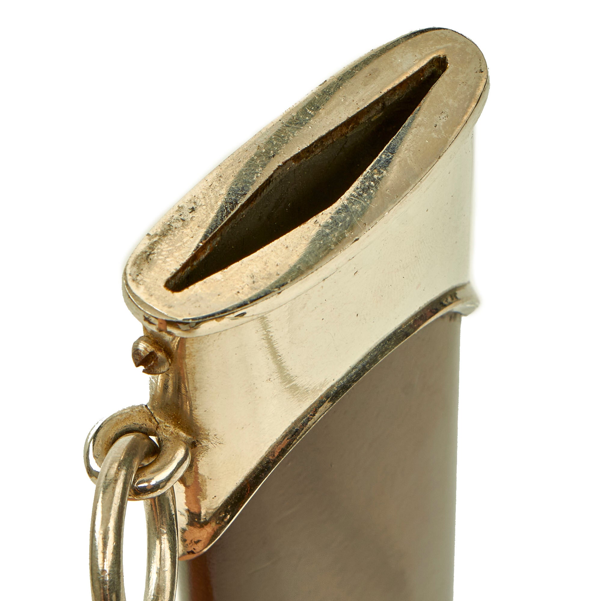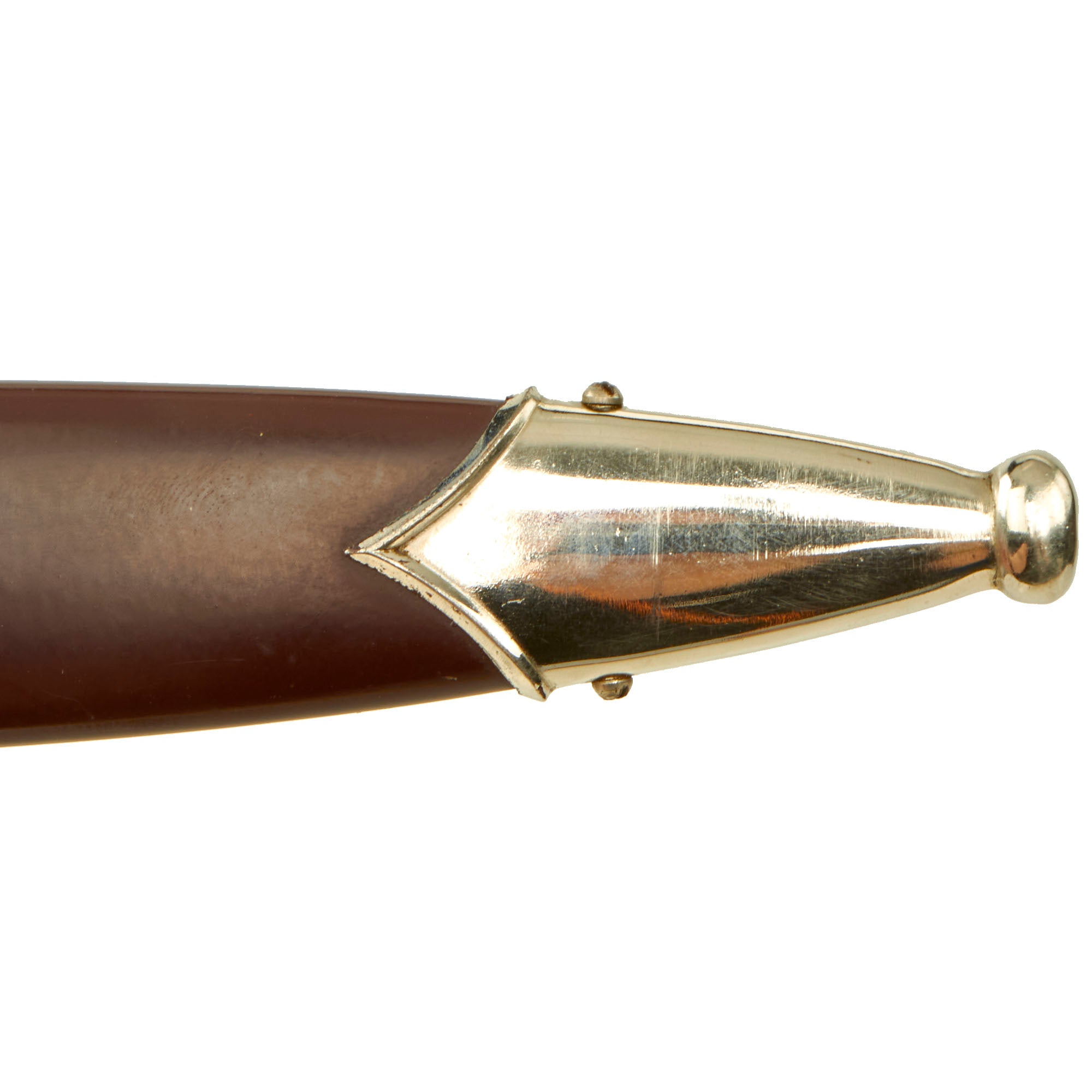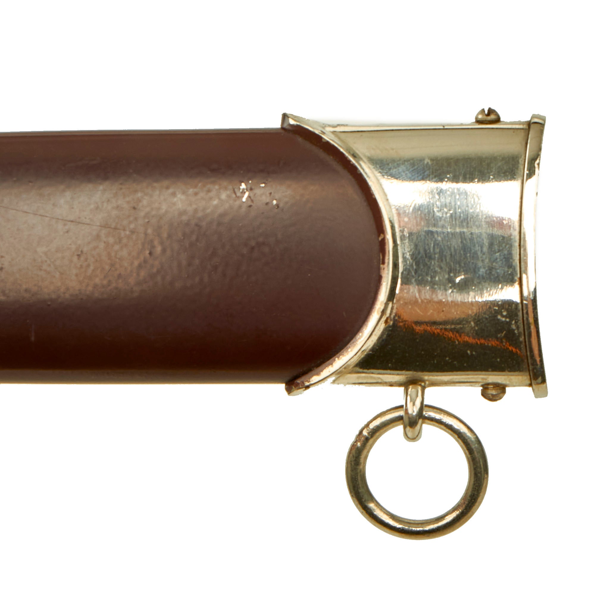 The scabbard shell is straight throughout and has excellent original brown enamel paint. It has a bit of scuffing, as well as a few small scratches and chips, however it does not look to have had any alterations during its time in service, which must have been very short. The scabbard shell is equipped with fine matching nickel-plated steel mounts. These mounts are in very good condition overall, with only a little denting to the lower ball. They nicely match the crossguards and are complete with all four dome head screws. This really is a nice solid scabbard.