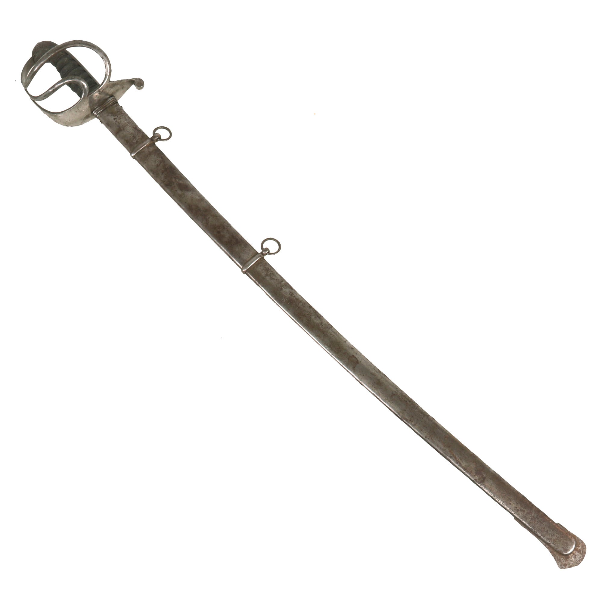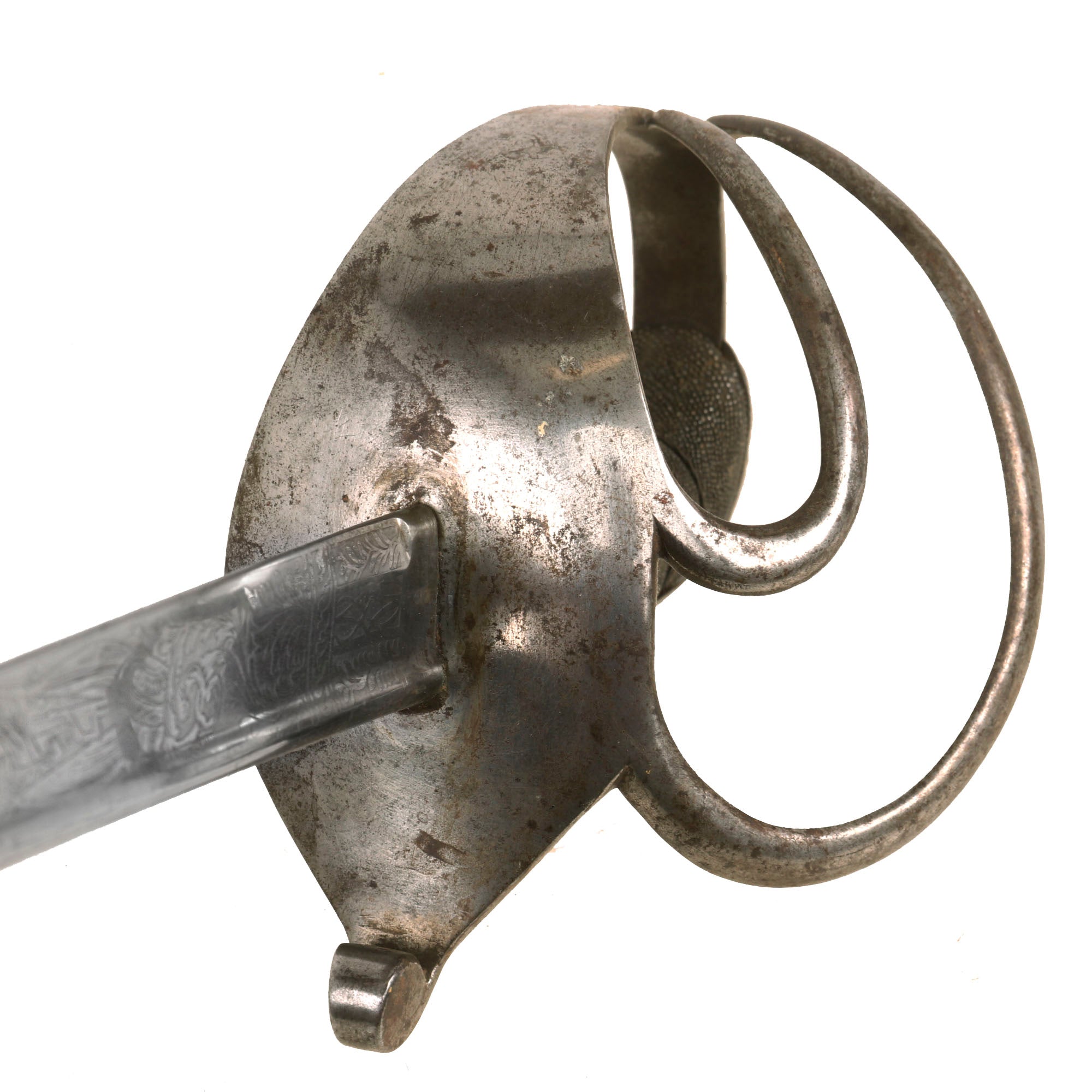 Original Item. Only One Available. This is an extremely scarce Model of 1849 Prussian Mounted Infantry Officer’s saber with its original scabbard. The sword is beautifully maker-marked on the spine for the Peter Daniel Lüneschloss Waffen-Fabrik company in Solingen. These sabers are rare enough on their own without the scabbard, but this example retains its original scabbard, which is also in great shape.