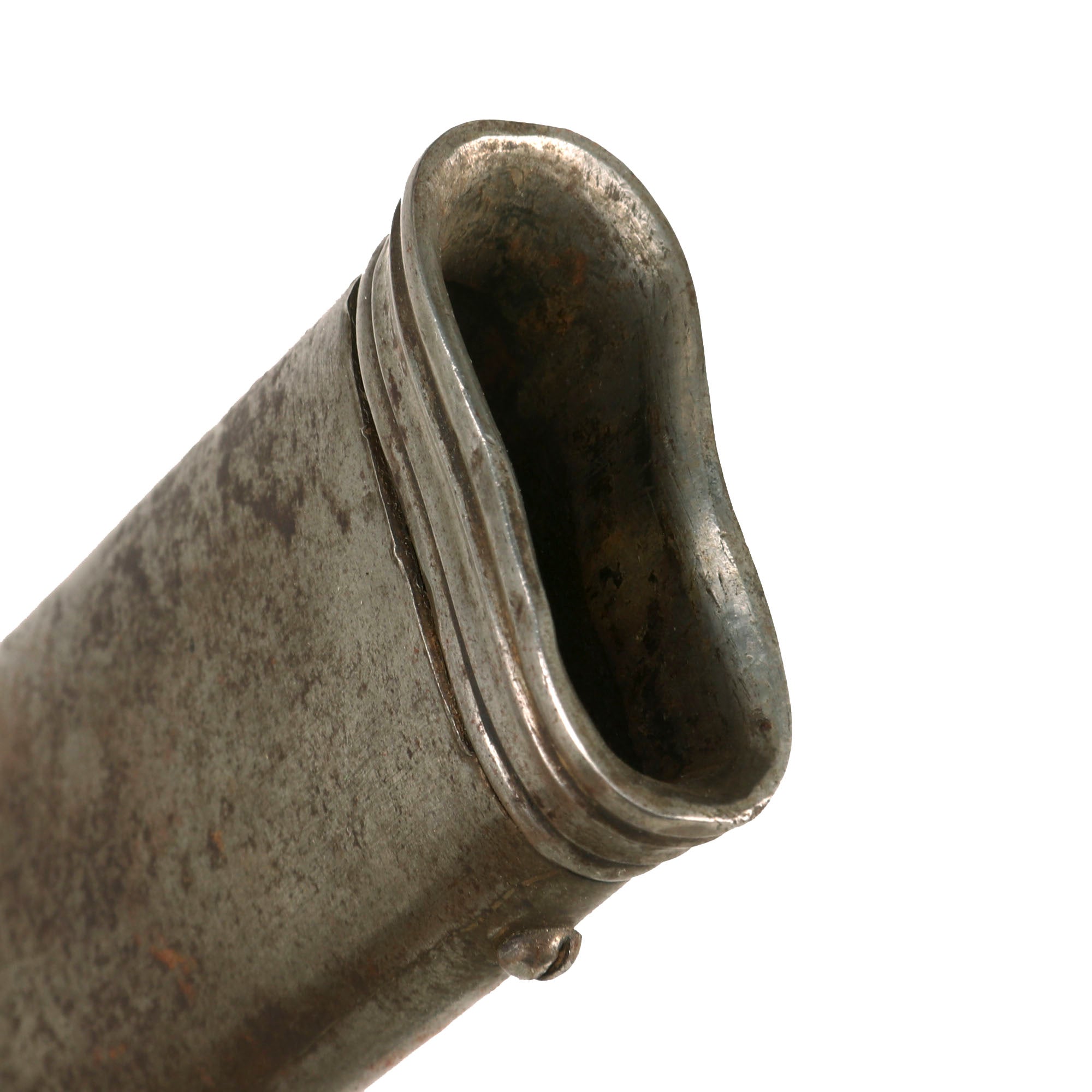The scabbard is in good shape with about 50% of its paint retained, the rest covered by oxidation. The mouth of the scabbard has been pinched to allow it to hug the blade tighter. It retains its two hanging rings.