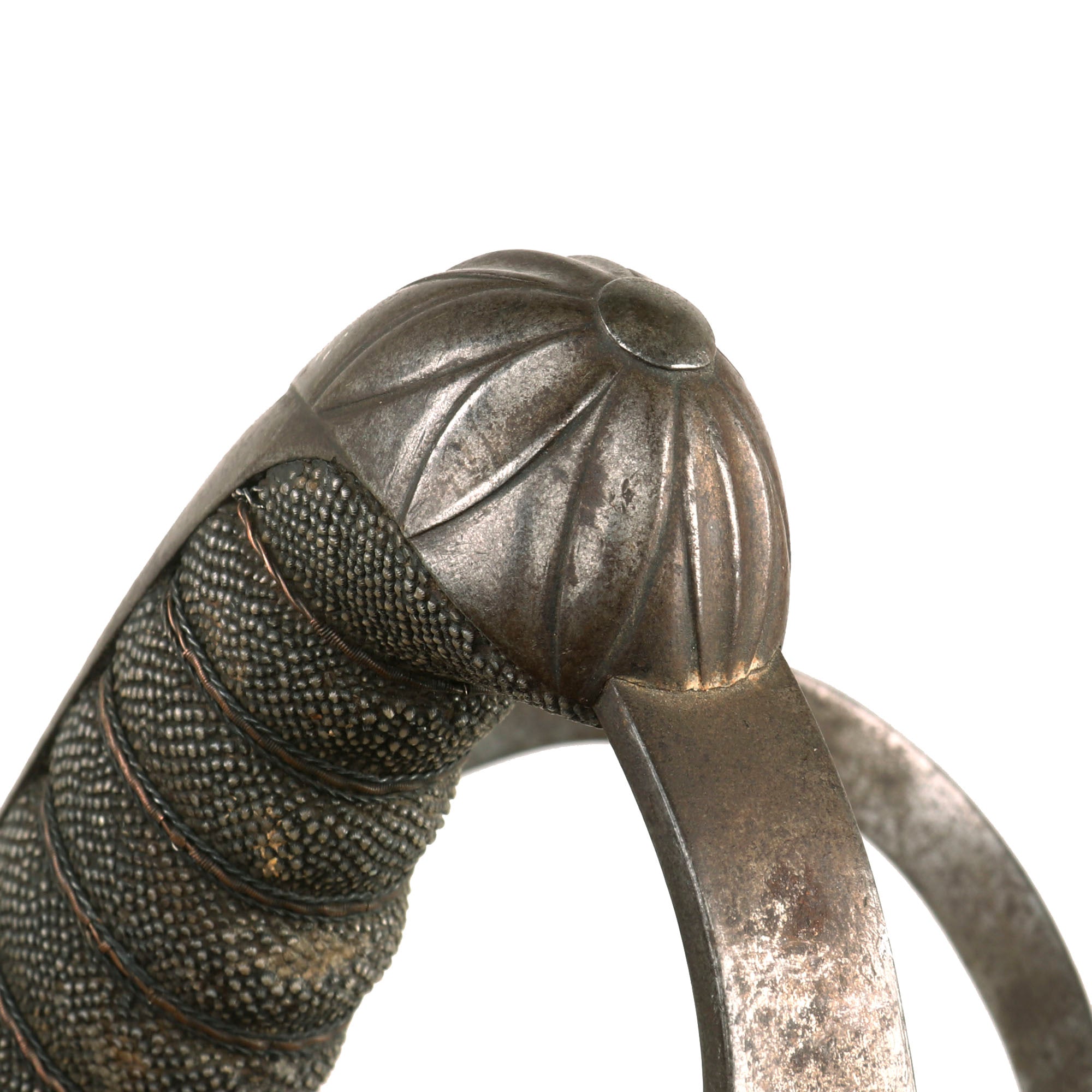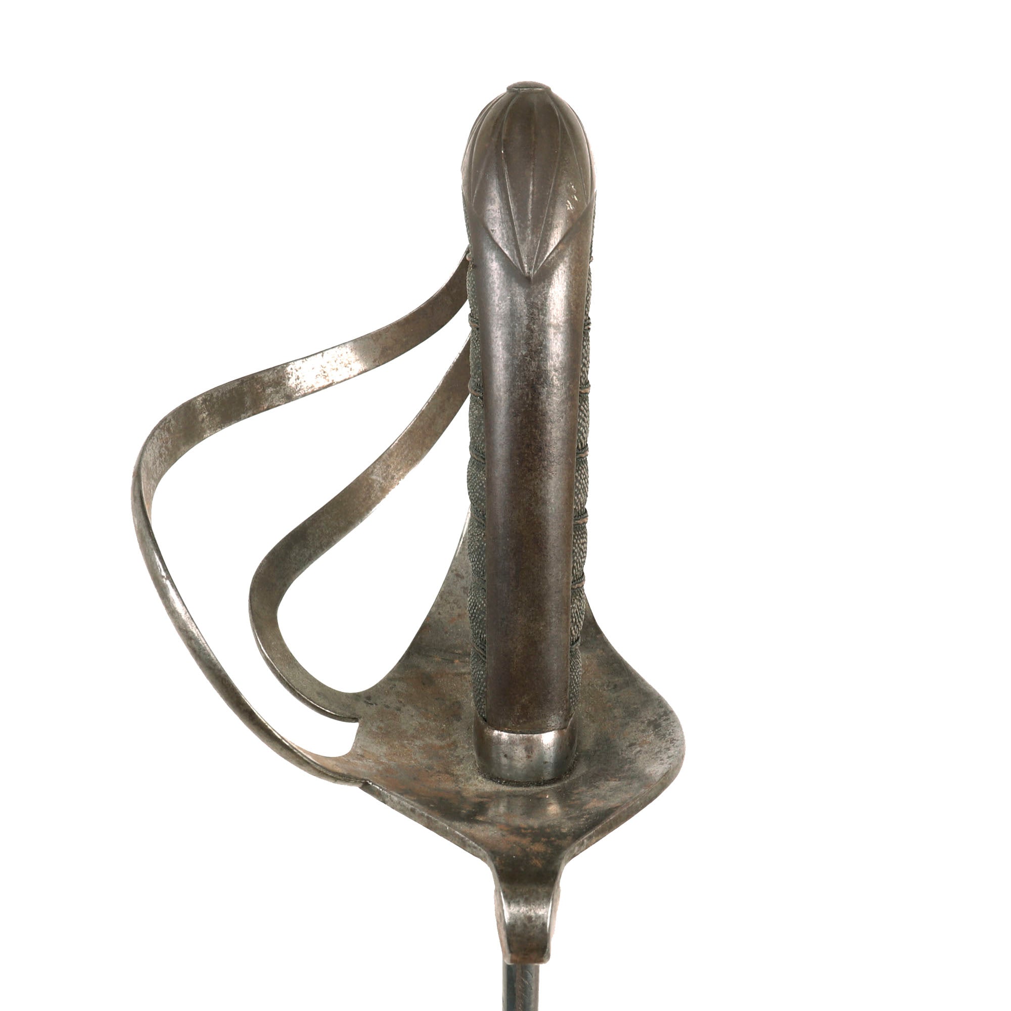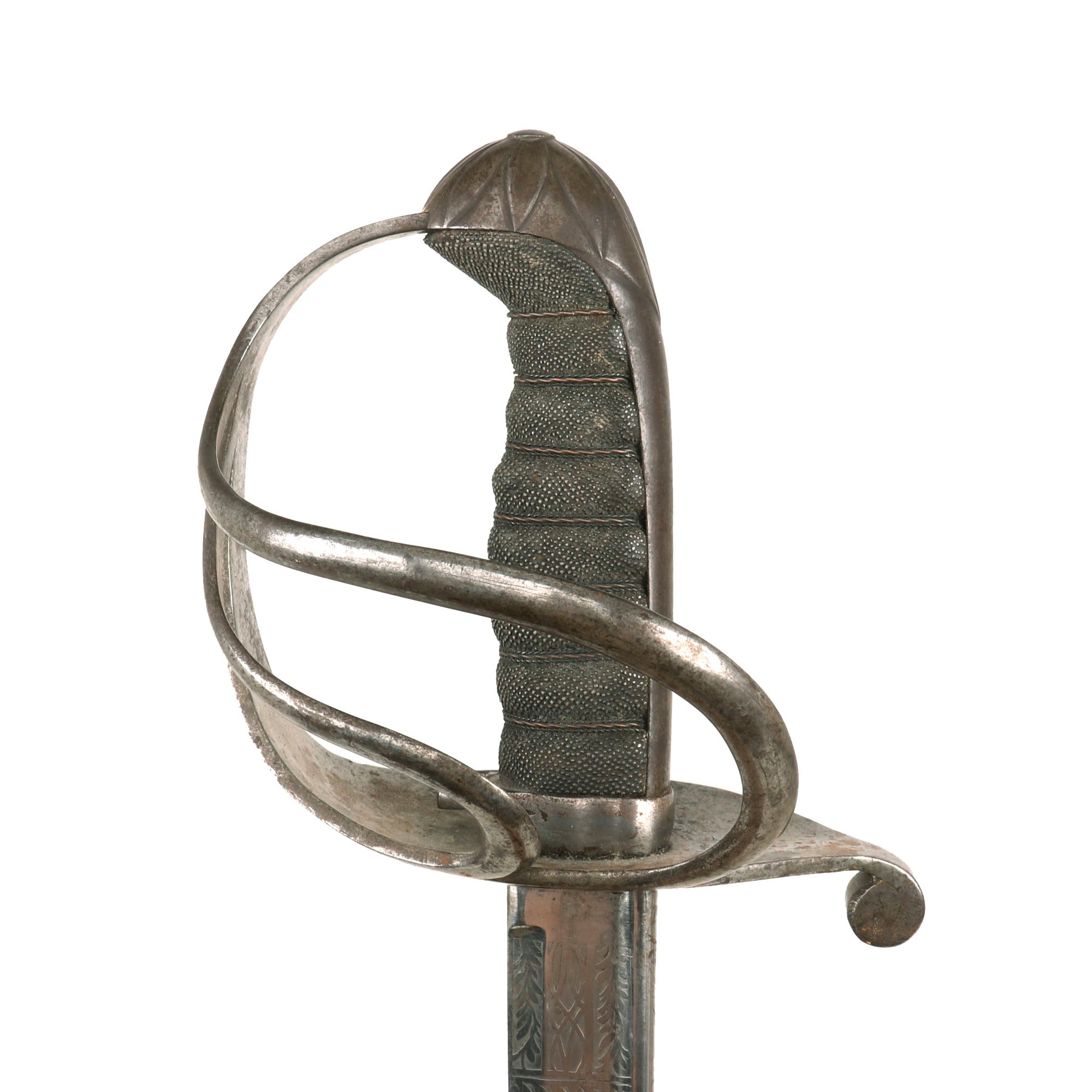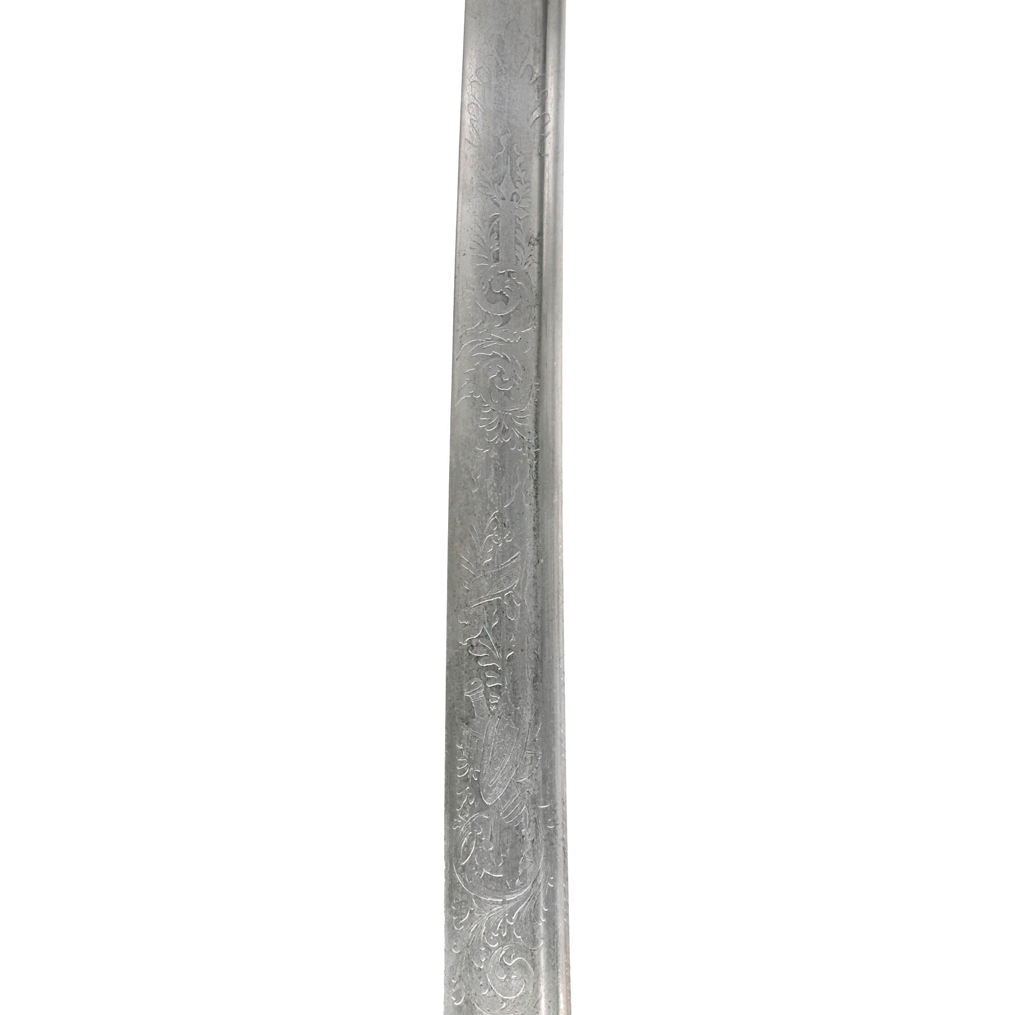 The sword measures roughly 38” long with the scabbard on. The hilt consists of a rayskin grip secured with wire, and a small metal loop catch for a sword knot to be attached. The pommel branches out to create a flower-shape. The blade is beautifully etched with vinery, field cannons, and shields. It is signed gorgeously on the spine P.D. Lüneschloss, Solingen.