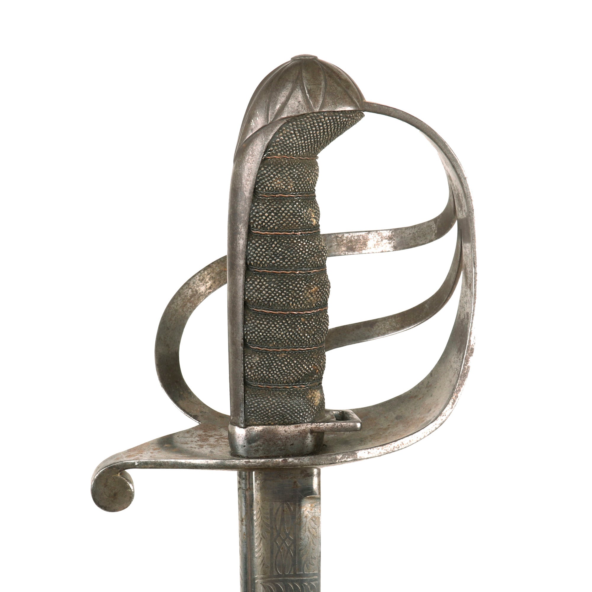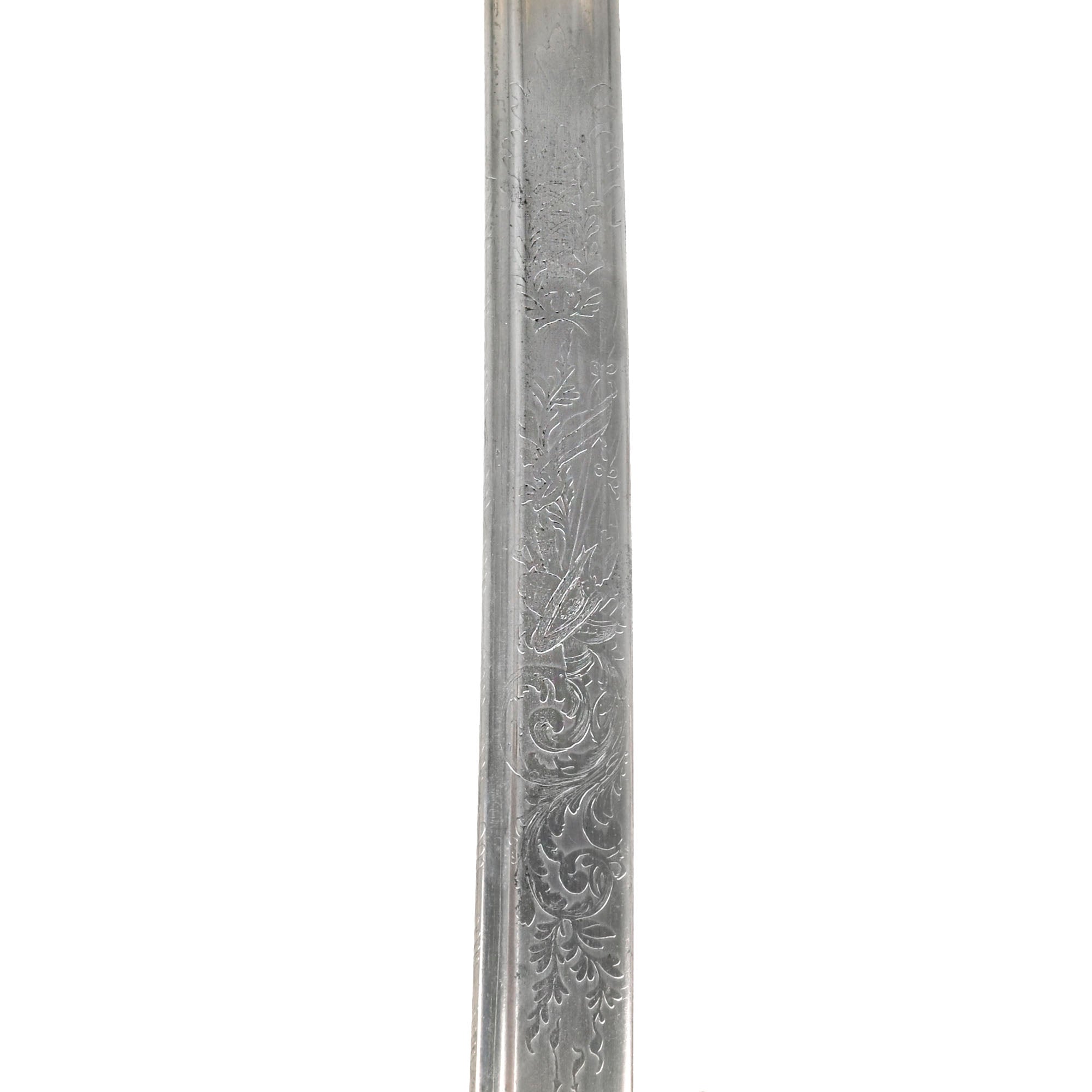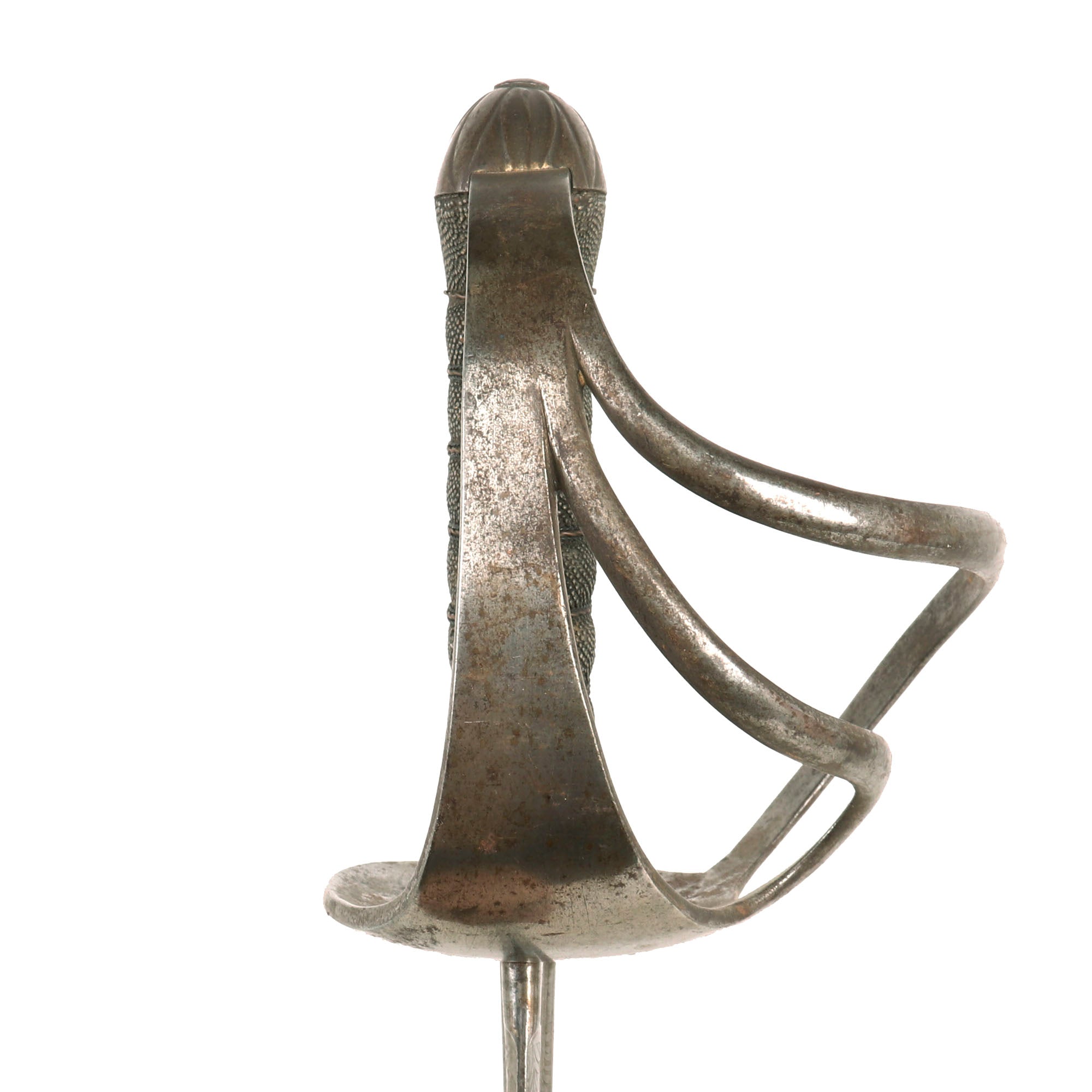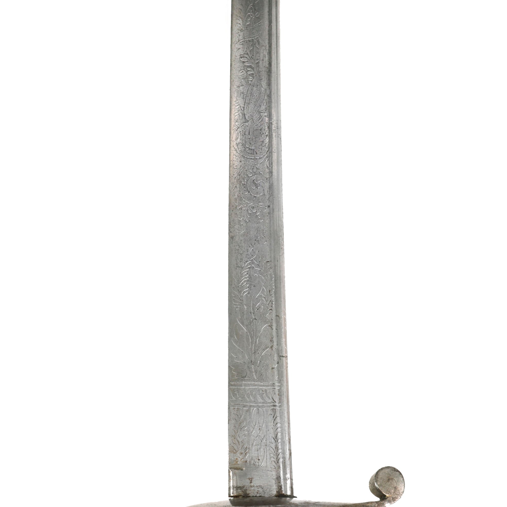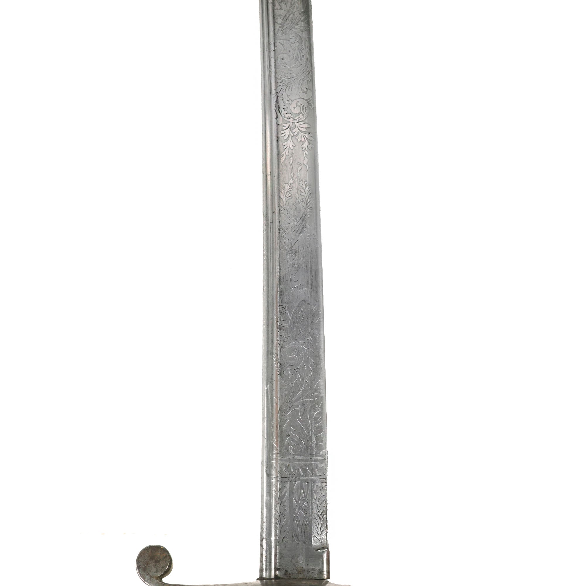 The sword measures roughly 38” long with the scabbard on. The hilt consists of a rayskin grip secured with wire, and a small metal loop catch for a sword knot to be attached. The pommel branches out to create a flower-shape. The blade is beautifully etched with vinery, field cannons, and shields. It is signed gorgeously on the spine P.D. Lüneschloss, Solingen.