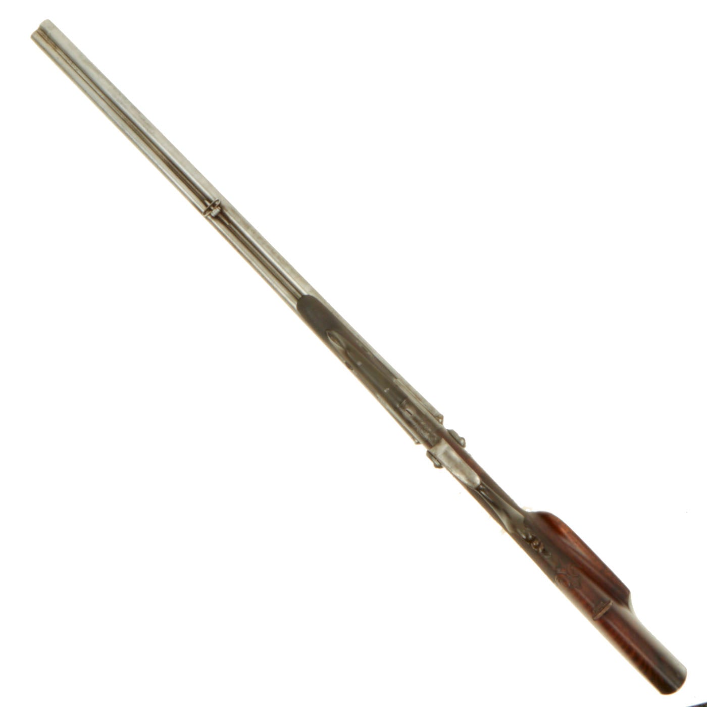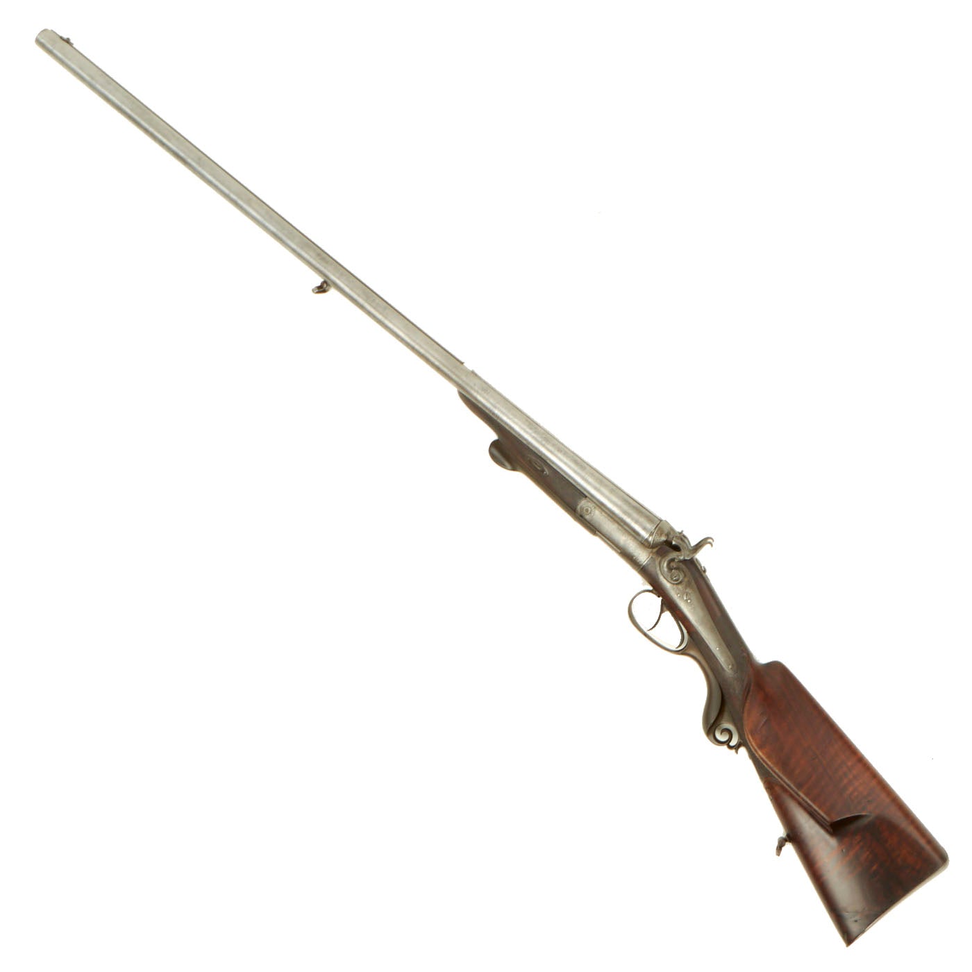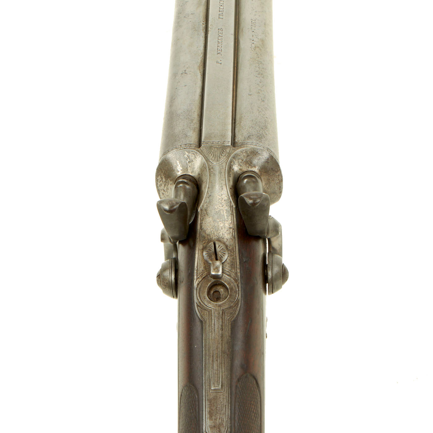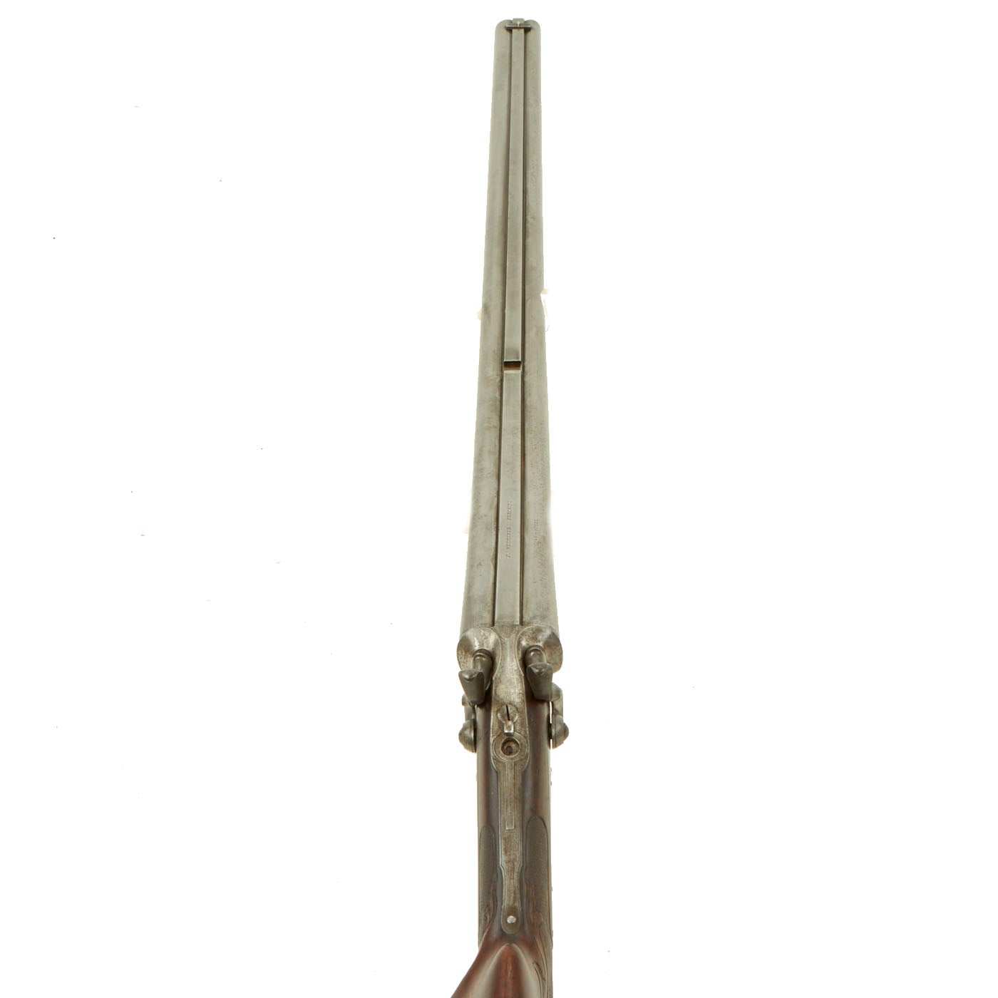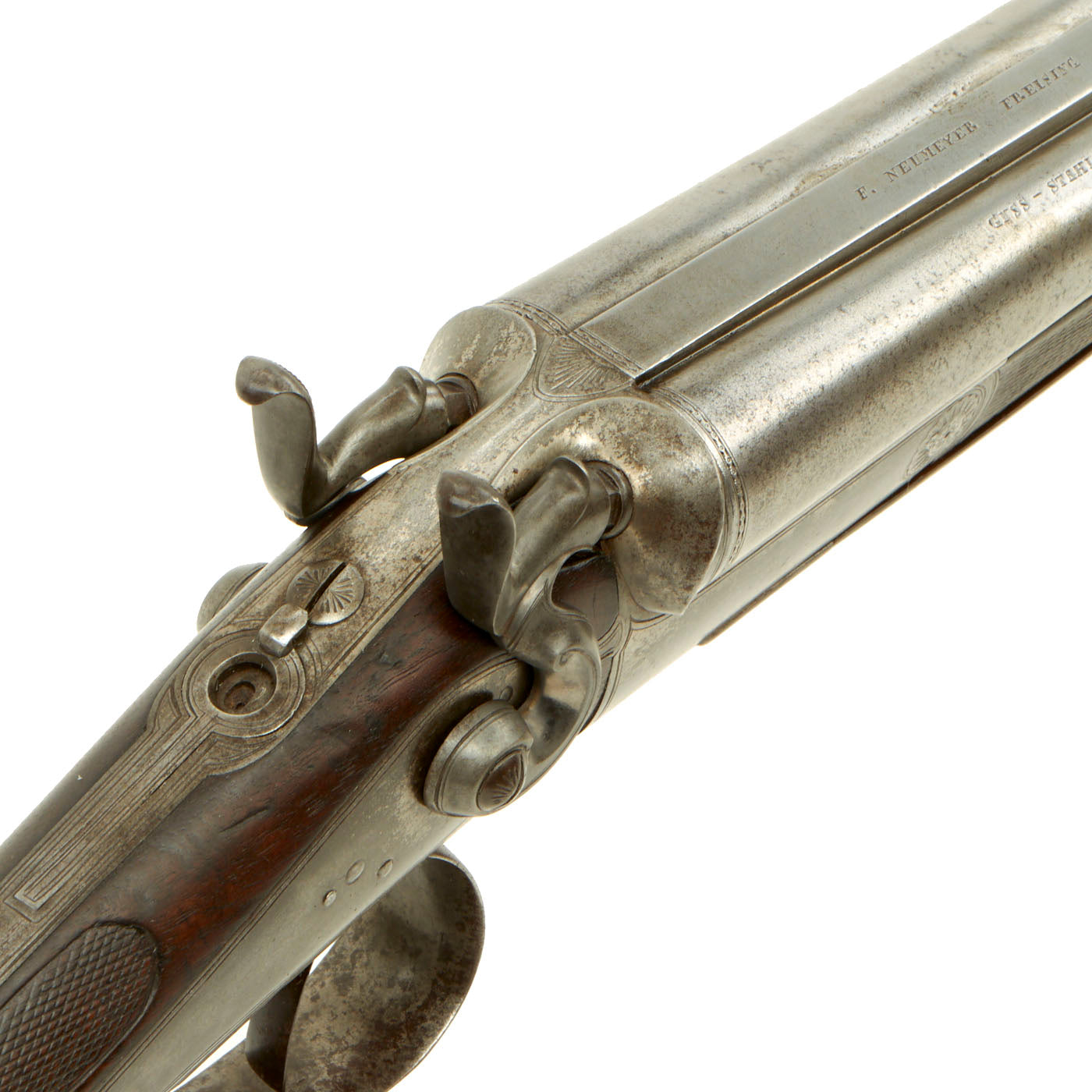 The double barrels are 27 3/4" in length, with the left side being a .67" / 16 bore shotgun and the right side a .43" rifle. The barrels also look to be of different manufacture methods, as the left side shotgun is "Damascus" twist steel, while the right barrel is marked GUSS-STAHL, for "Cast Steel. The gun measure 43 1/2" in overall length. The lovely walnut stock houses twin back action hammer locks, which are unmarked. The barrel rib is marked with the makers name and location: